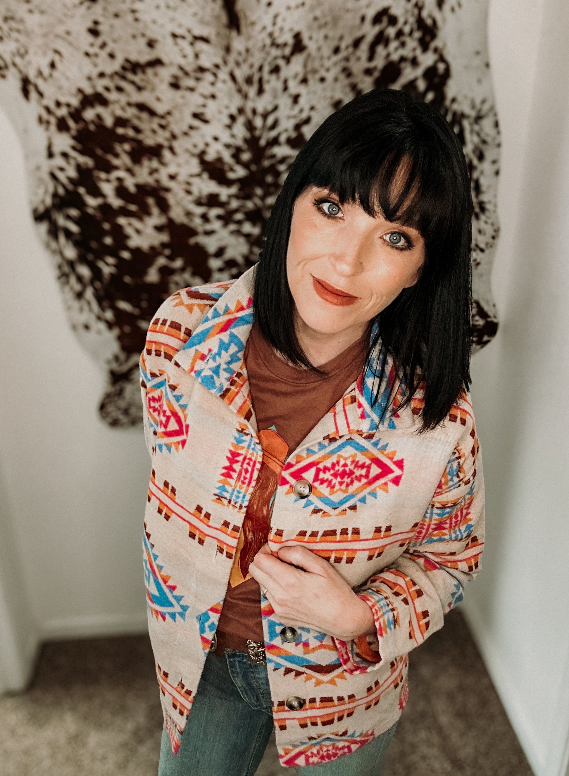 Step up your western fashion game with The Aztec Trail Jacket. This jacket is the perfect blend of bold Aztec patterns and classic western details. Featuring a button-up closure and a flattering fit, this jacket is as stylish as it is versatile—perfect for any occasion that calls for a little extra cowgirl flair.