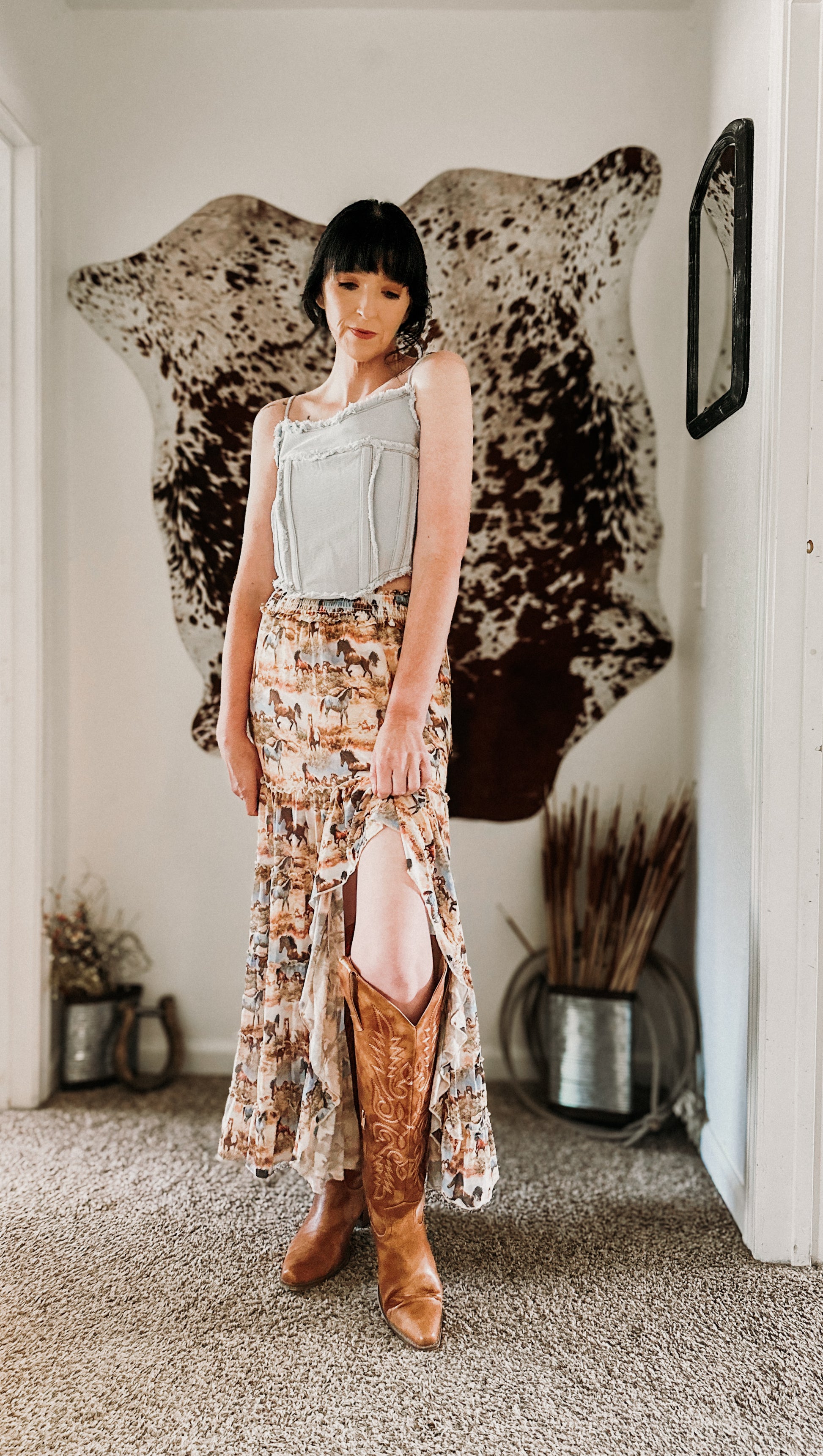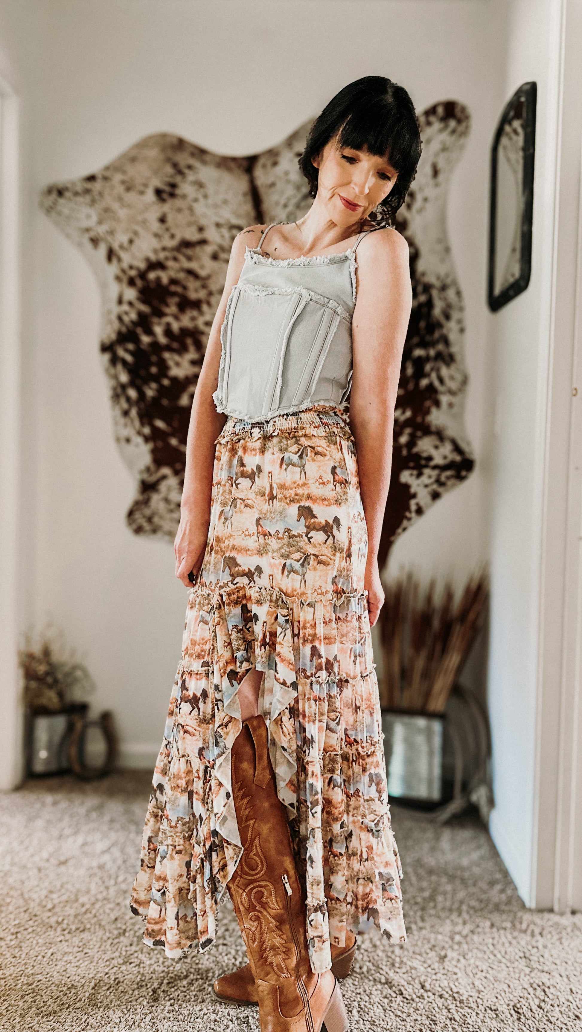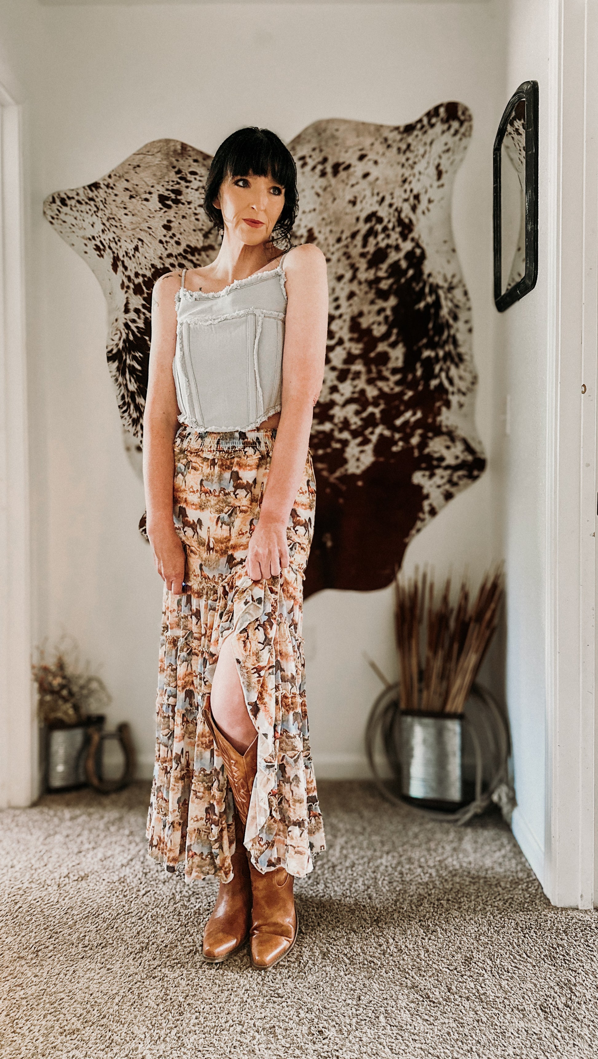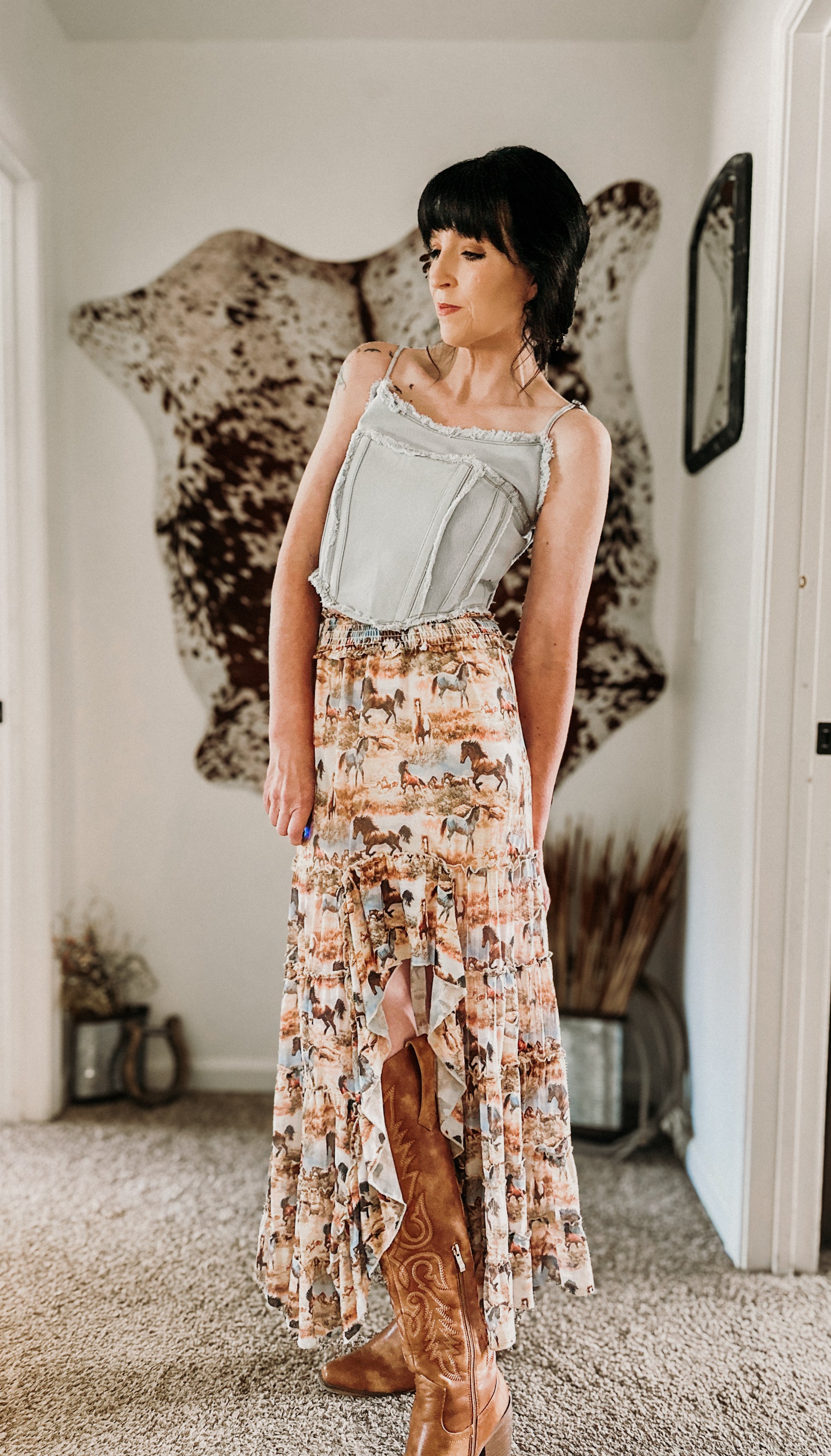 Structured, frayed, and full of slow-burn attitude—the Backroad Blues Corset is a dusty dream in mineral-washed light denim. With adjustable spaghetti straps, frayed seams, and a fitted corset bodice, she’s ready for late-night bonfires, dusty trails, and a little small-town trouble.
