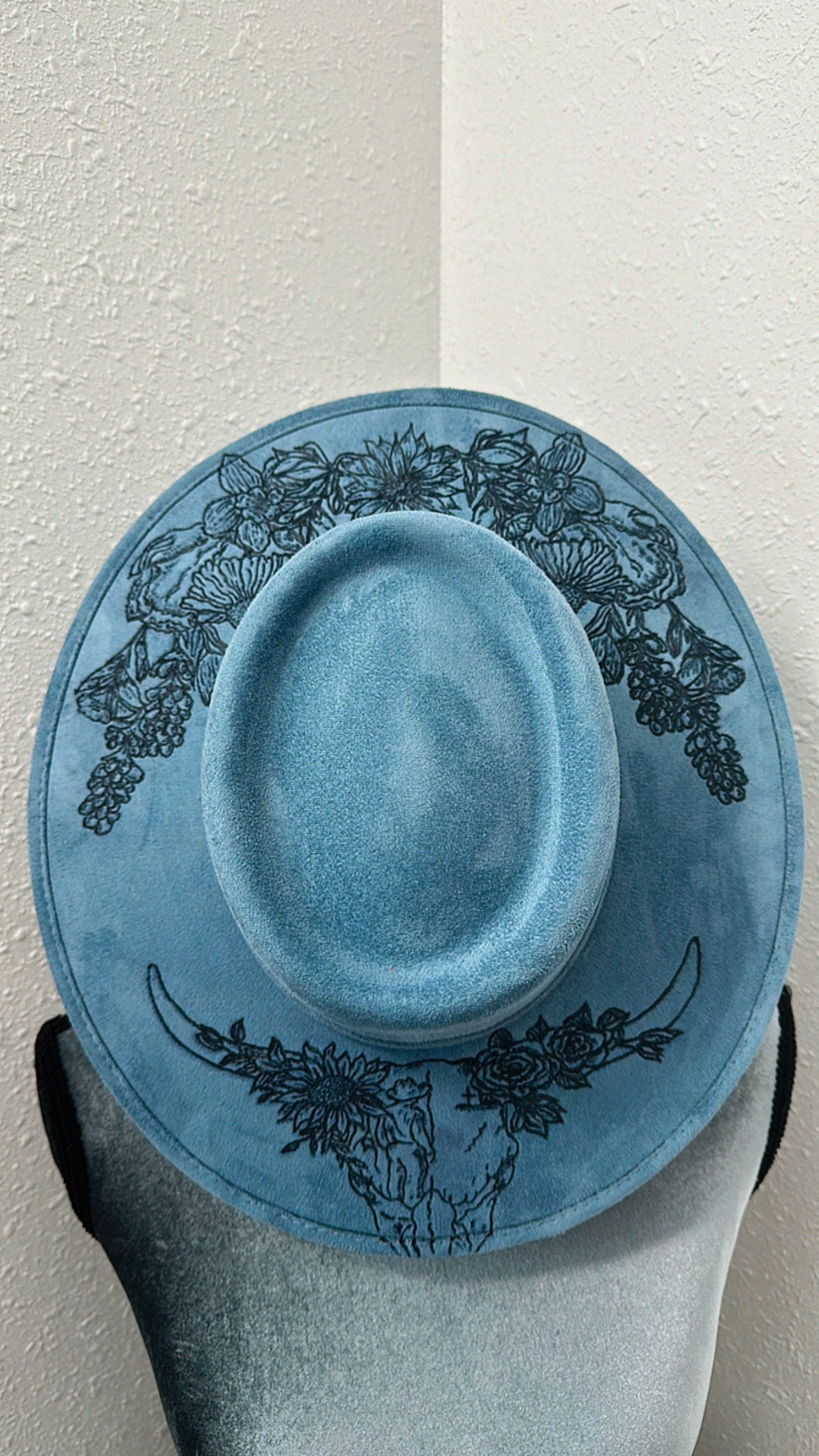 The Blue Hollow Bloom is a dreamy wide brim rancher hat, hand-burned with delicate wildflowers wrapping around the top brim. On the back? A haunting bull skull, detailed with florals and a cowboy silhouette etched into the crown — a quiet nod to the rugged soul who won’t be forgotten.