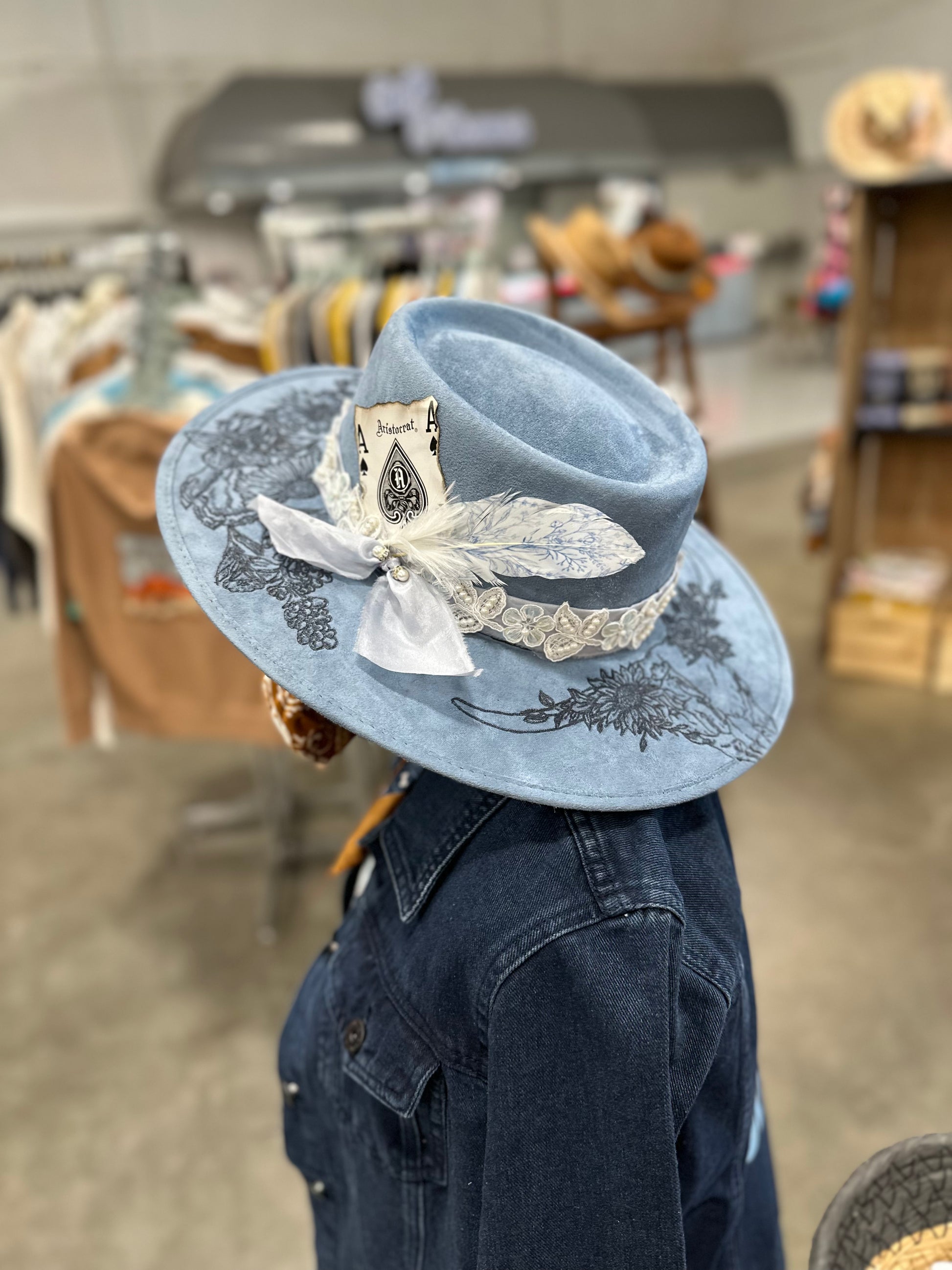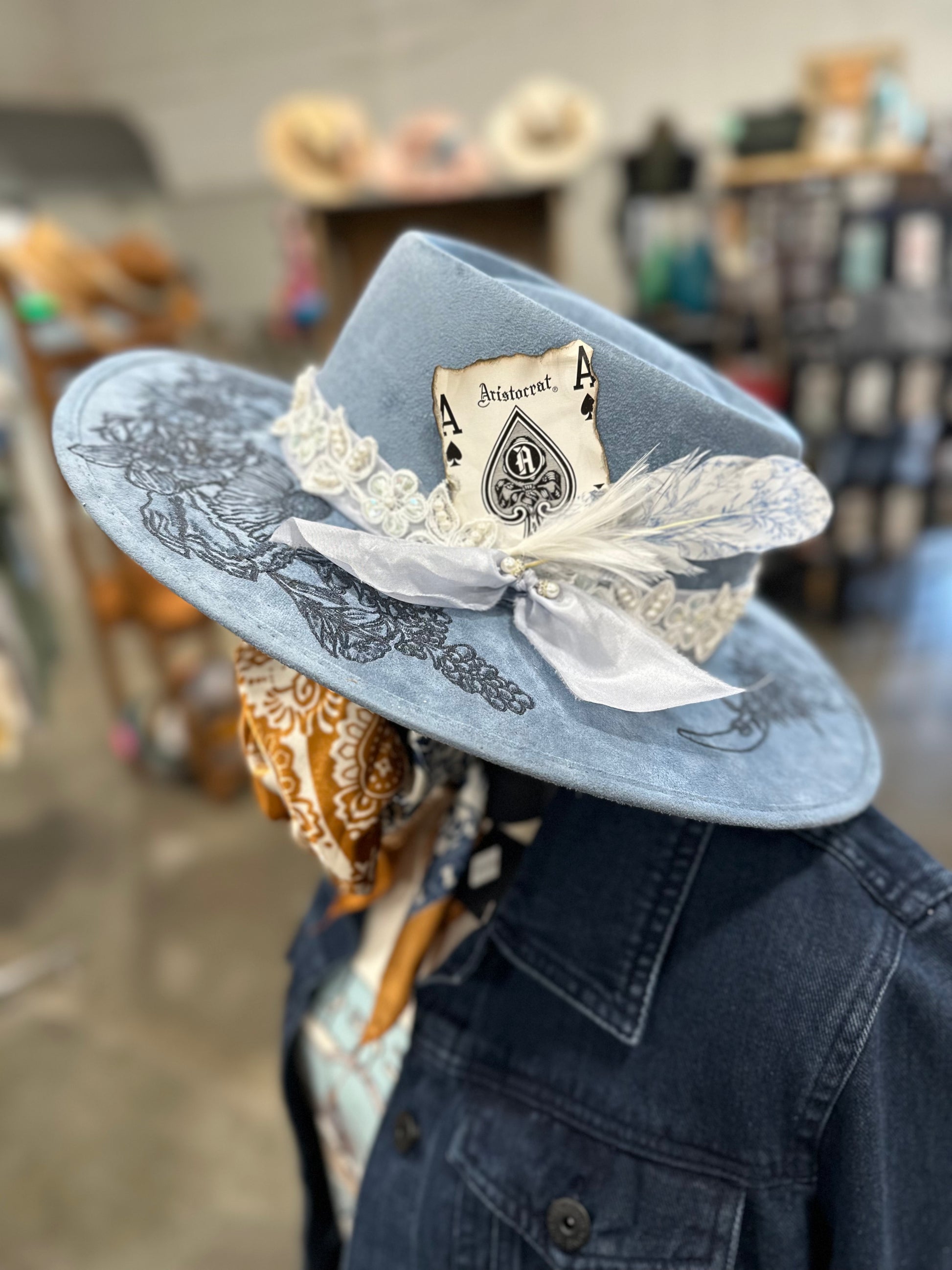 Topped with an ethereal hat band: soft light blue satin ribbon, holographic lace with pearls, two pearl and diamond pins, white printed feathers, and a burnt-edge ace of spades card. Every element is styled and placed by hand — a one-of-a-kind piece for the bold-hearted.