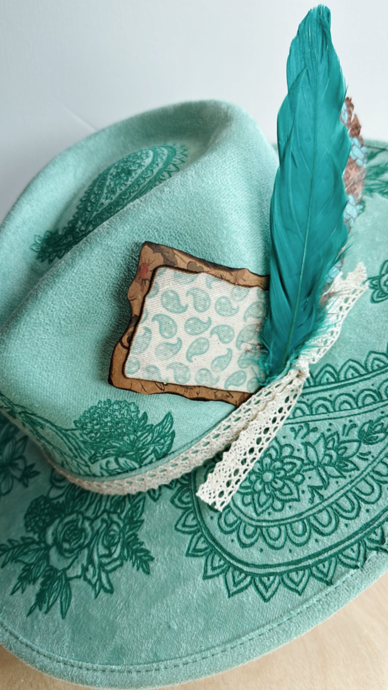 The hat band is soft and simple — a single lace ribbon, delicate enough to let the artwork shine, but styled with two bold feathers: one deep turquoise, and one printed feather in rich brown check with turquoise gems and western stars.