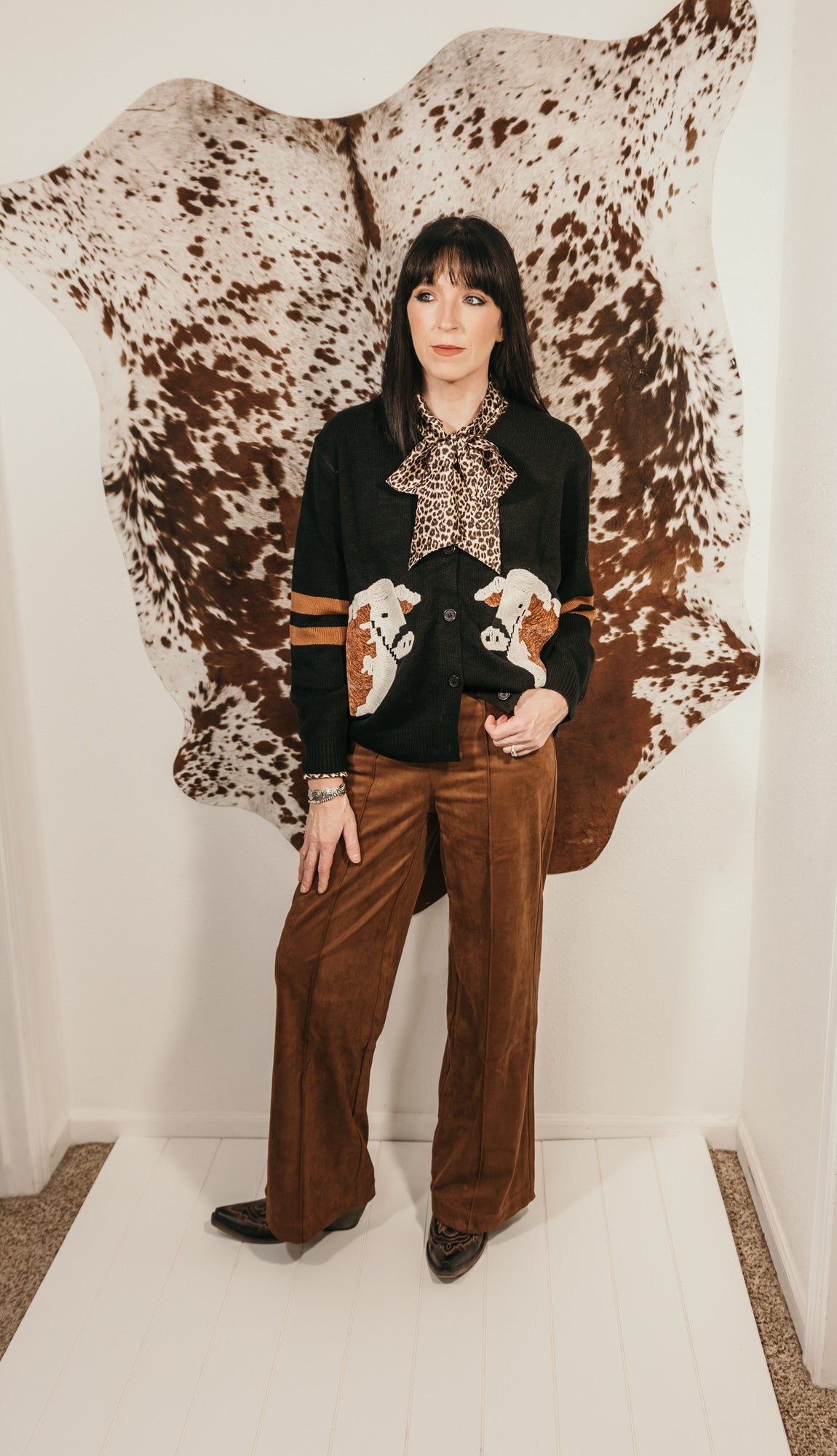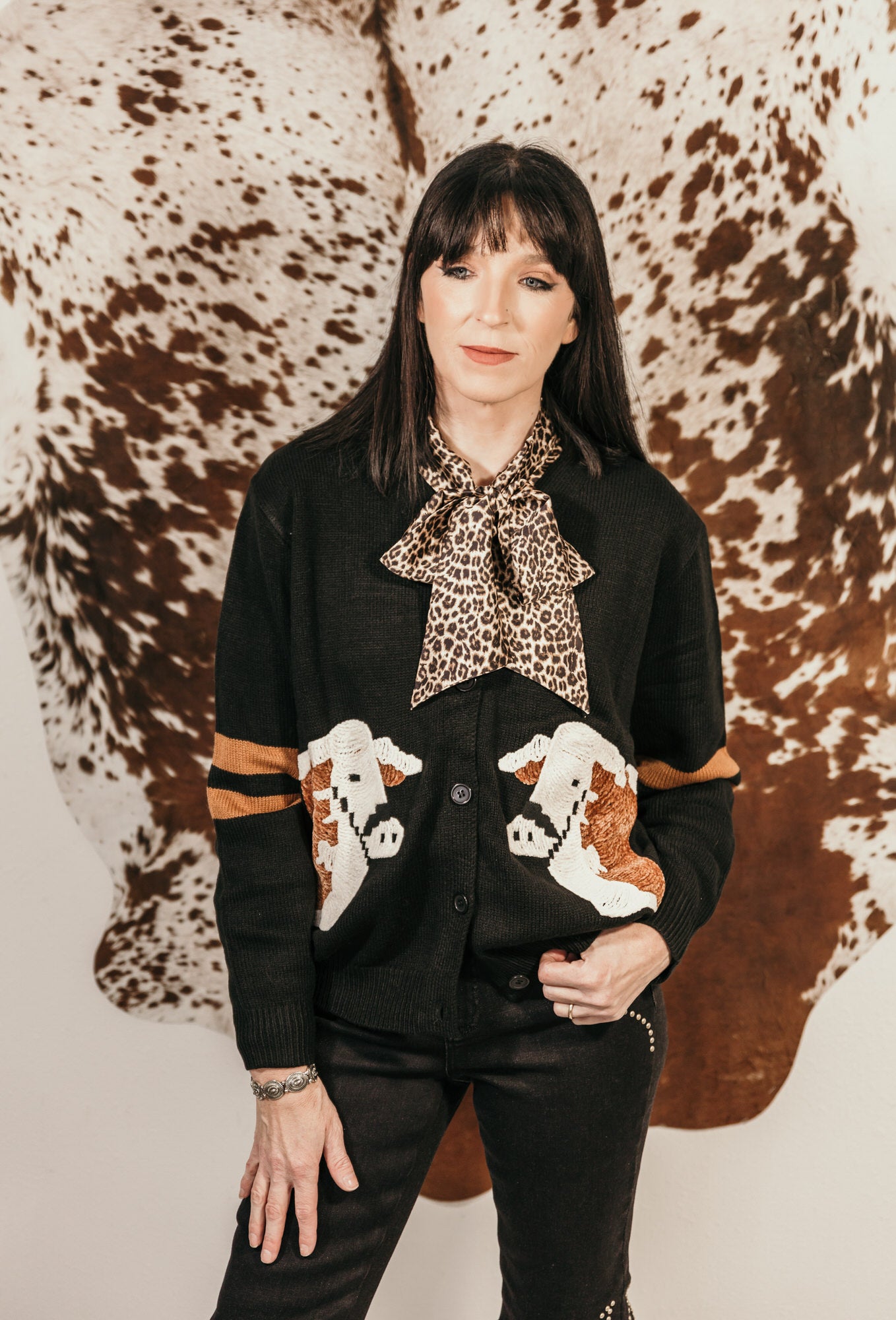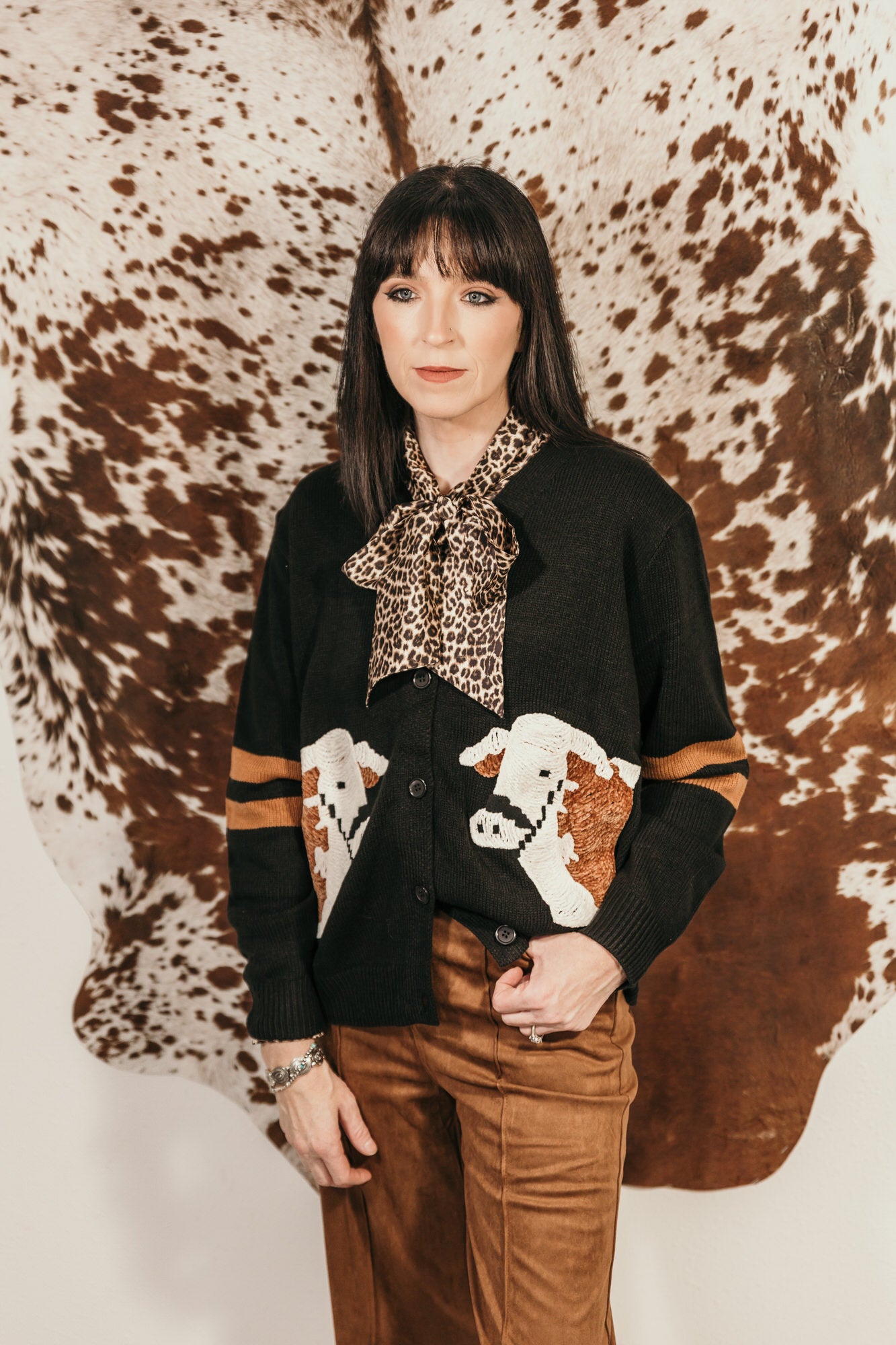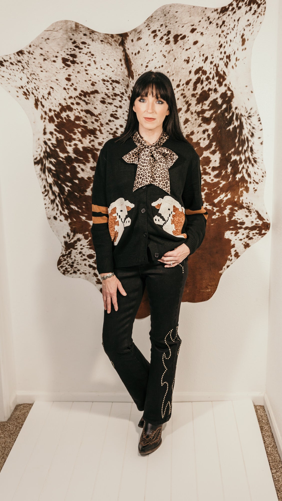 Meet the Cattle Card – Black Hereford, your new favorite layer that blends vintage ranch vibes with modern Western comfort. This soft-knit cardigan features a timeless Hereford-inspired pattern in black and white — the perfect nod to heritage style with a contemporary cowgirl twist.