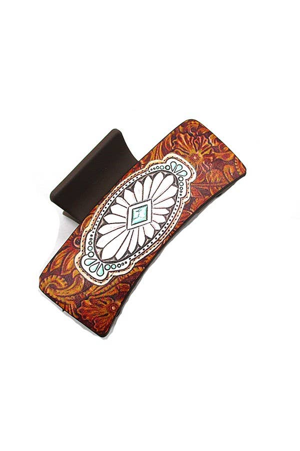 Every cowgirl needs a quick-draw hair fix The Cowgirl Concho Claw features a brown tooled PU leather wrap with a bold silver concho and turquoise center stone. At 2"x4", it’s big enough to hold your locks steady while doubling as a statement accessory. Whether you’re headed to the rodeo, the fairgrounds, or just keeping it western chic day-to-day, this claw has you covered.