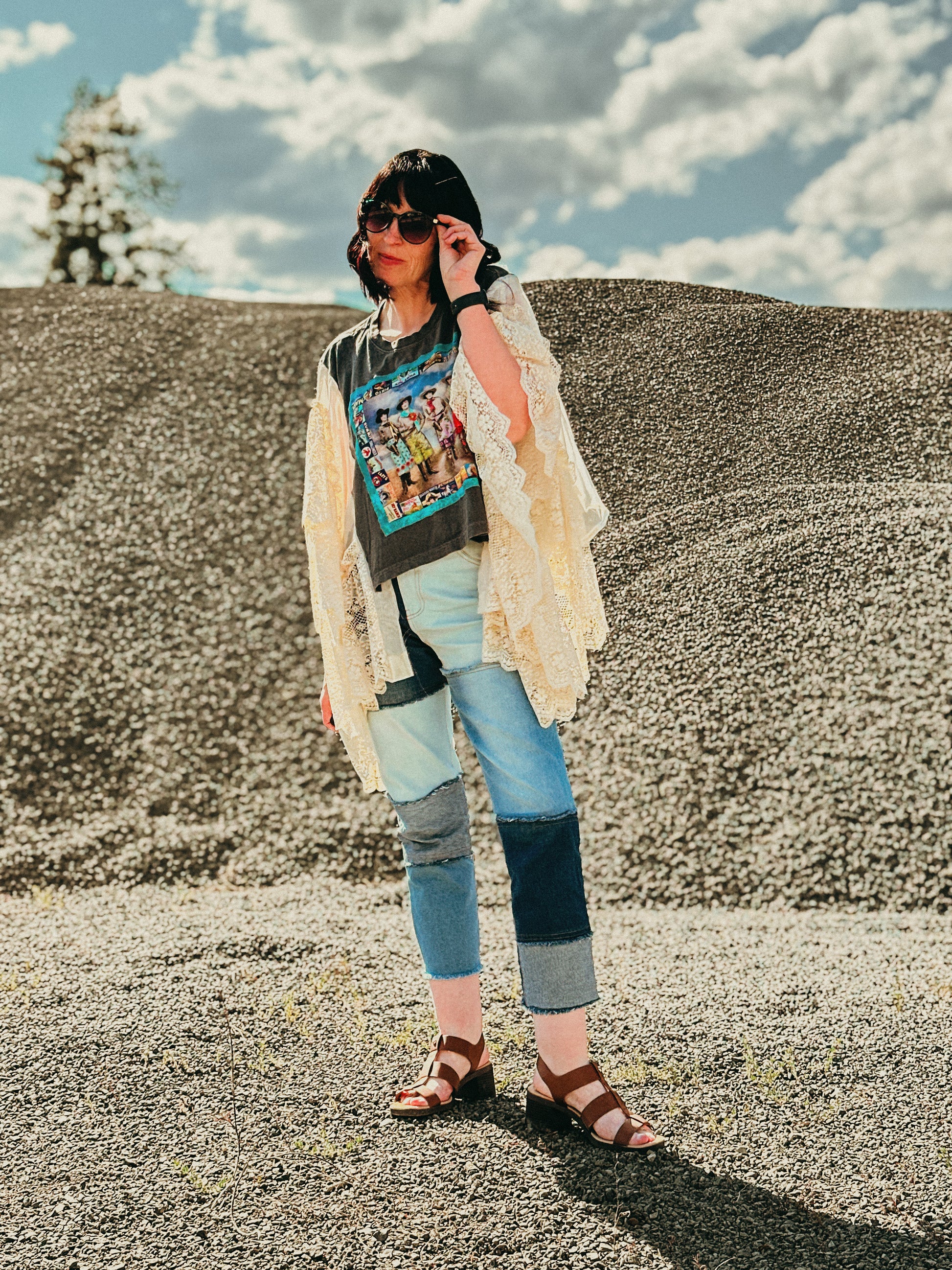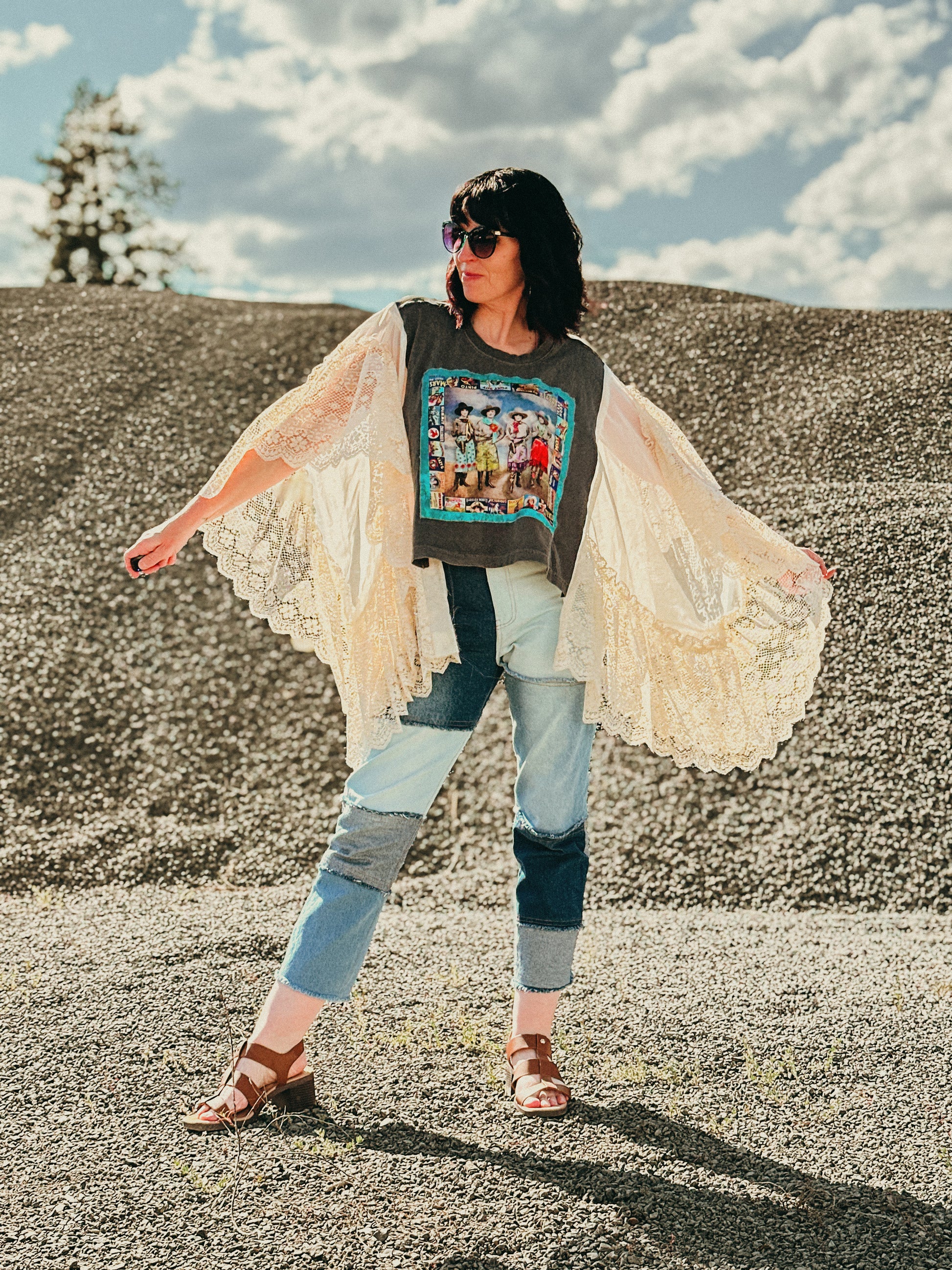 Handmade from a faded black base, this one-of-a-kind top features oversized cream lace and sheer poncho-style sleeves, raw edge seams, and a stitched-on vintage cowgirl scene.