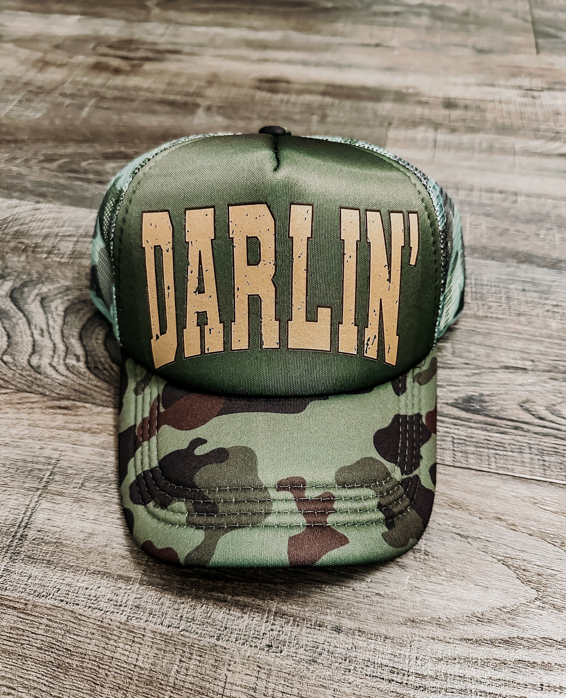 This camo trucker is for the girl who waves with a wink and walks with a little extra strut when someone’s watching. With a bold Darlin’ graphic across the front and full camo mesh back, this hat brings the charm—and a whole lotta sass.