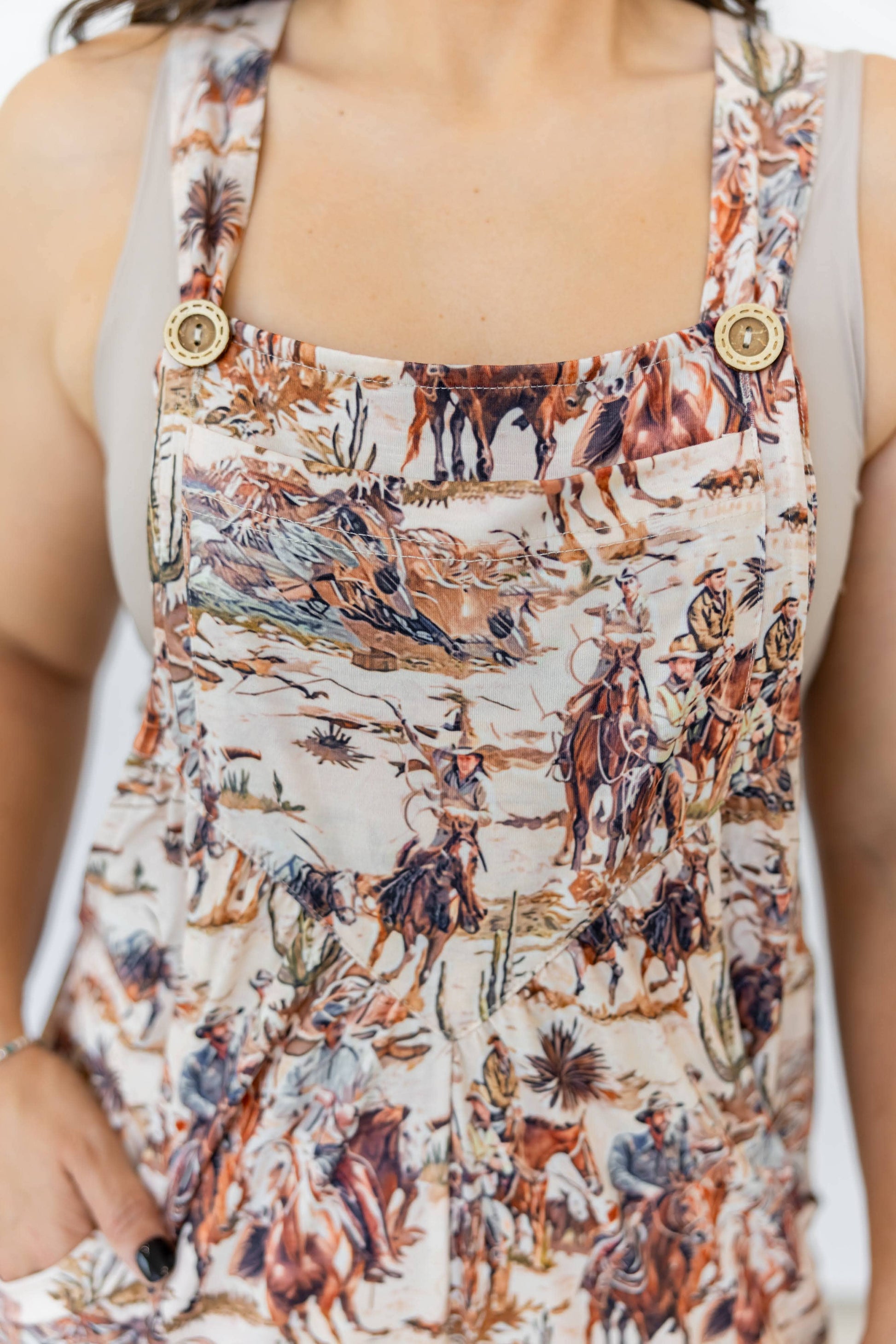 The Desert Daydream Jumper is giving vintage rodeo poster meets modern western muse. This flowy tiered maxi overall features a full desert print with bronc riders, cacti, and golden skies — like wearing a postcard from your favorite dusty daydream. Adjustable straps, bib front, and a relaxed fit make this beauty as easy to wear as it is to style.