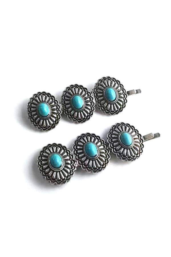 A subtle pop of turquoise goes a long way The Desert Daze Bobby Pins feature western-style zinc conchos with turquoise centers — three on each pin for a bold yet delicate look. Sold as a set of two, these hair accessories are perfect for adding a little cowgirl sparkle to your everyday style, rodeo nights, or festival fits.