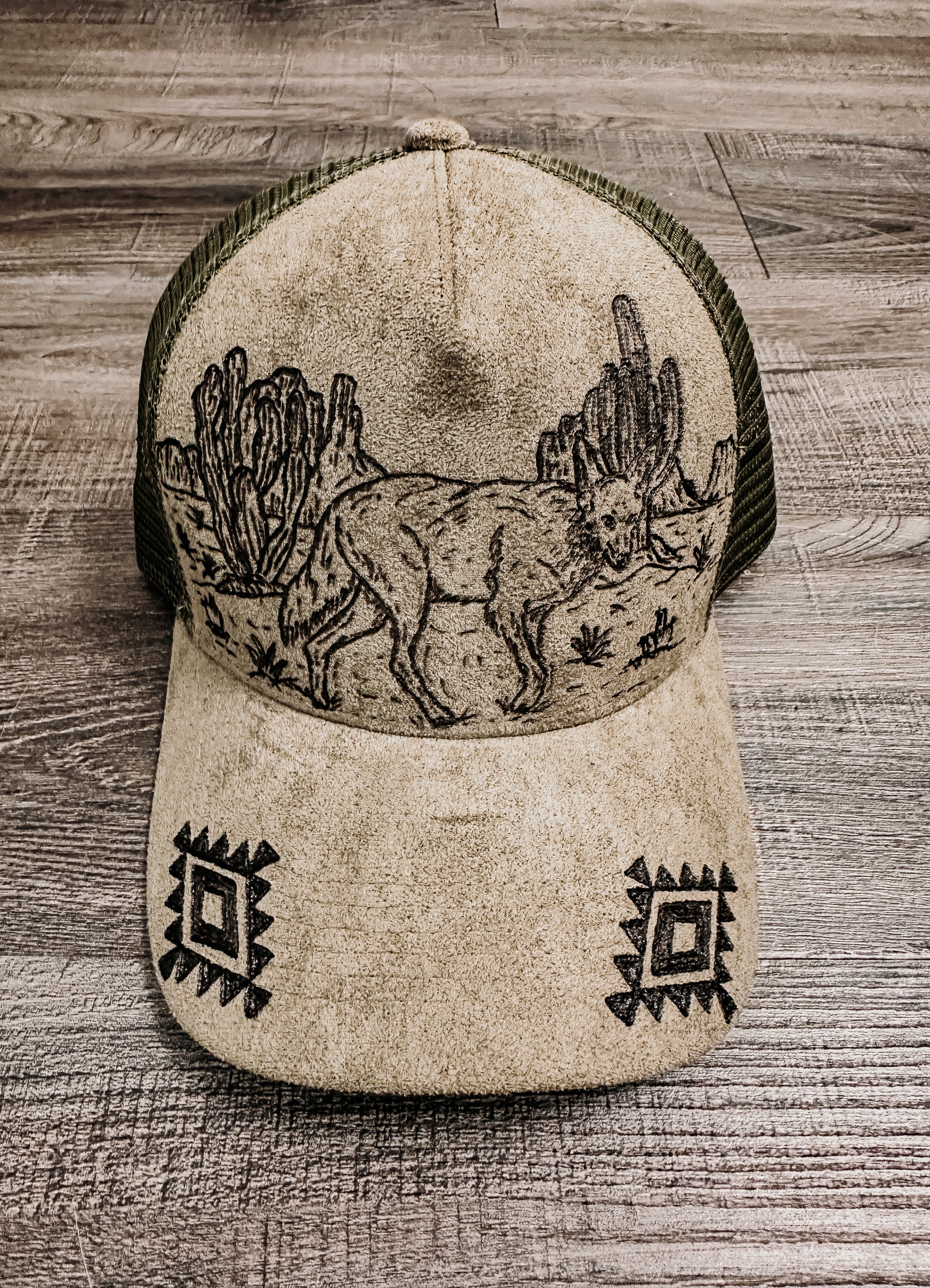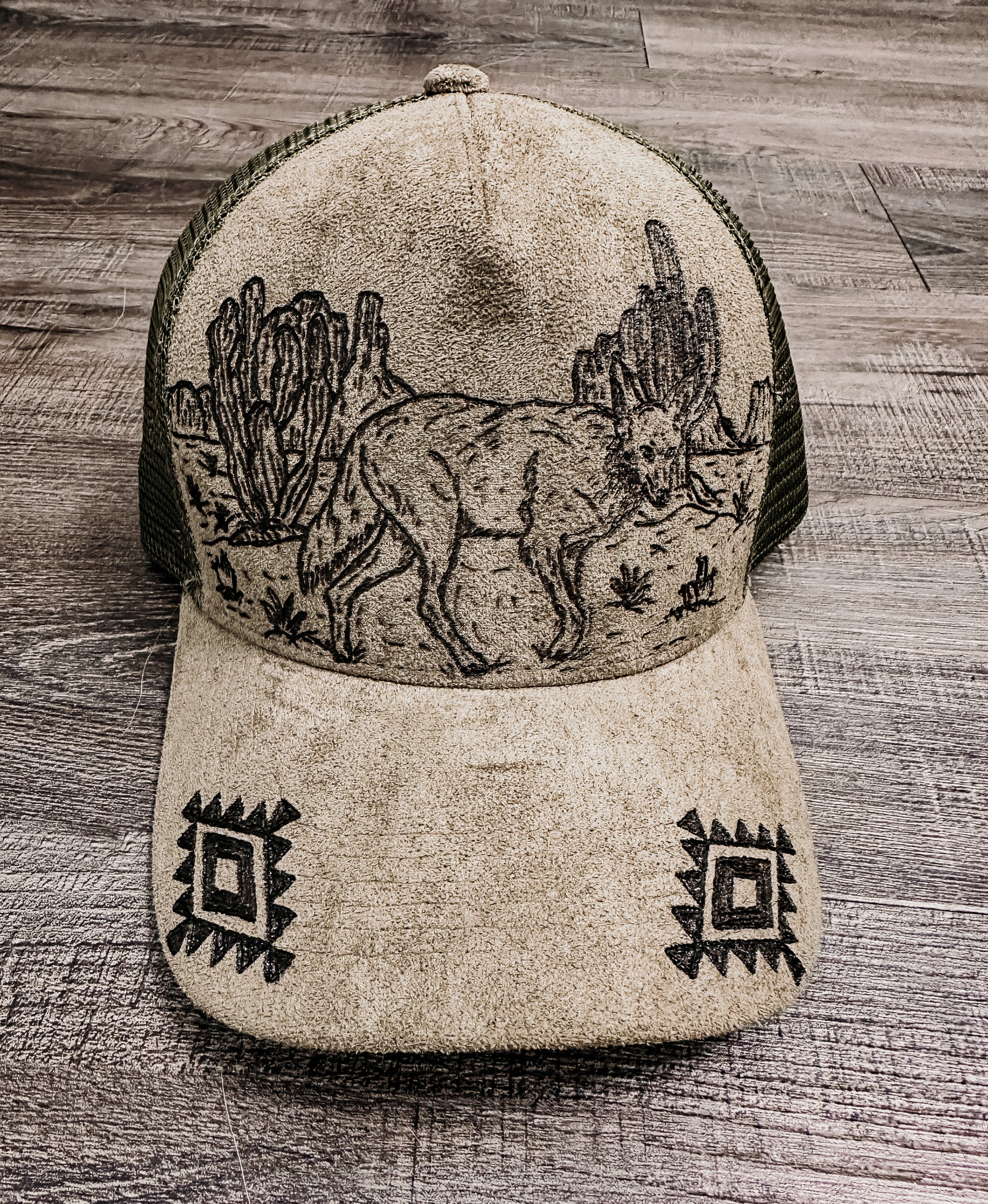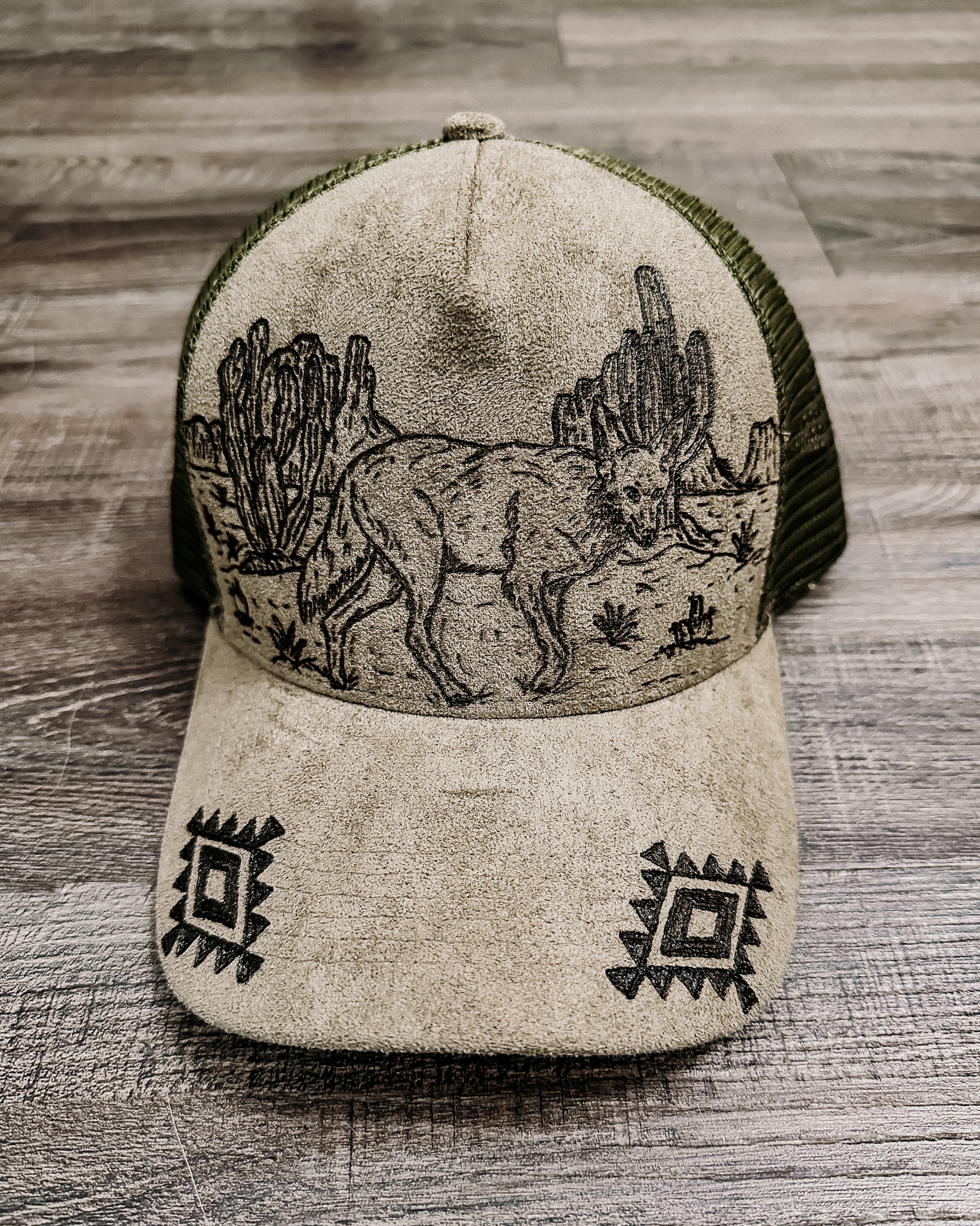 Embrace your wild side with the Desert Wanderer Hat, a hand-burned, one-of-a-kind olive green trucker hat. Featuring a desert scene with a coyote graphic and accented by an Aztec pattern on the bill, this hat captures the rugged spirit of the southwest. Every piece is individually hand-burned, giving it a uniquely authentic western vibe — perfect for any cowgirl ready to roam.