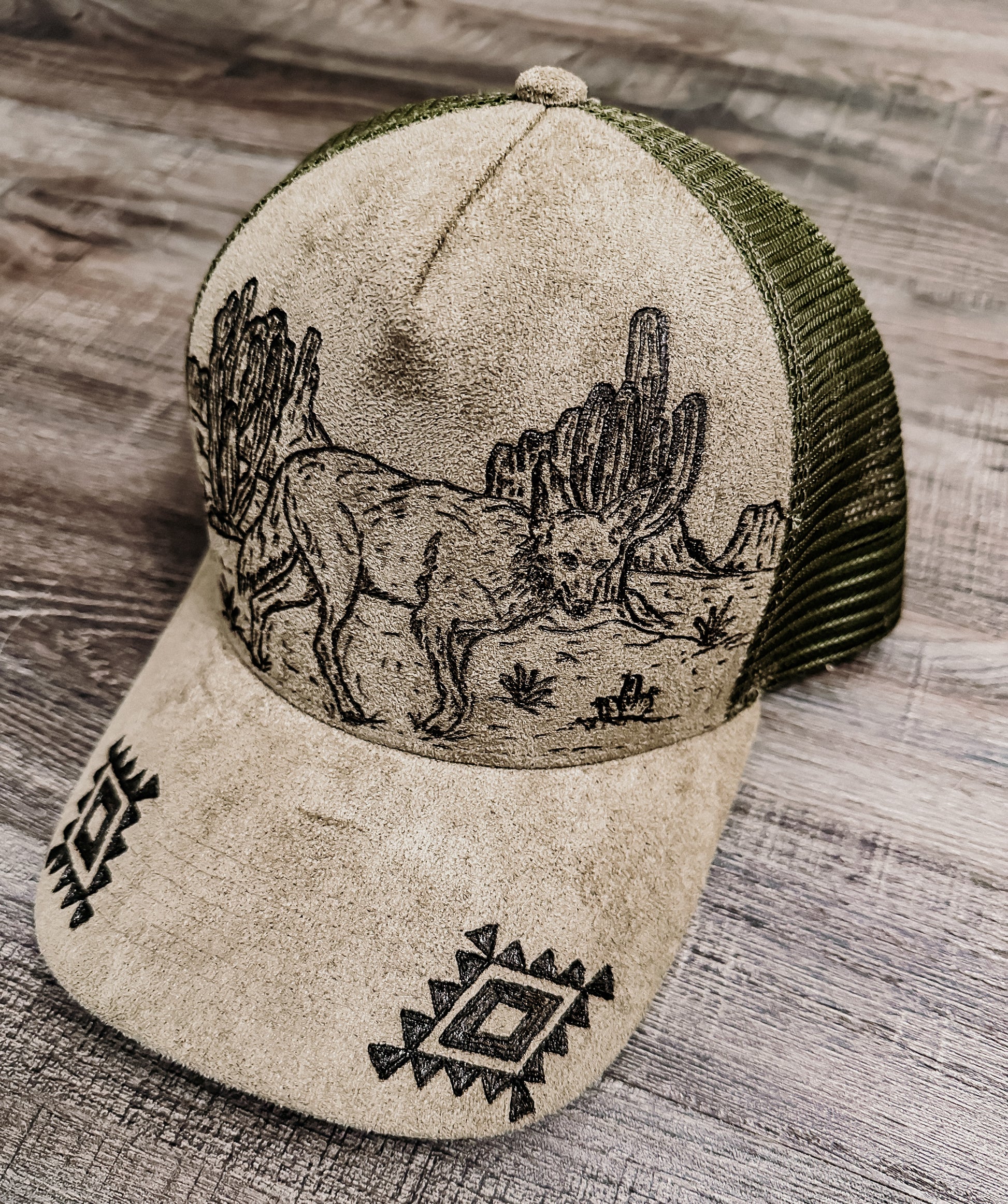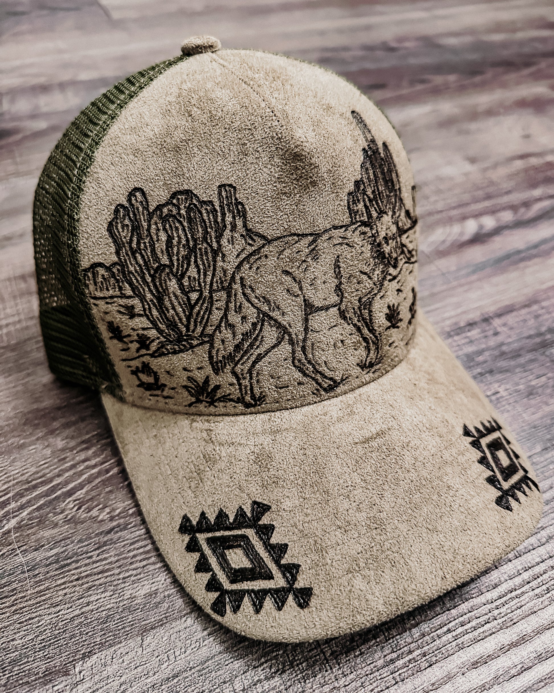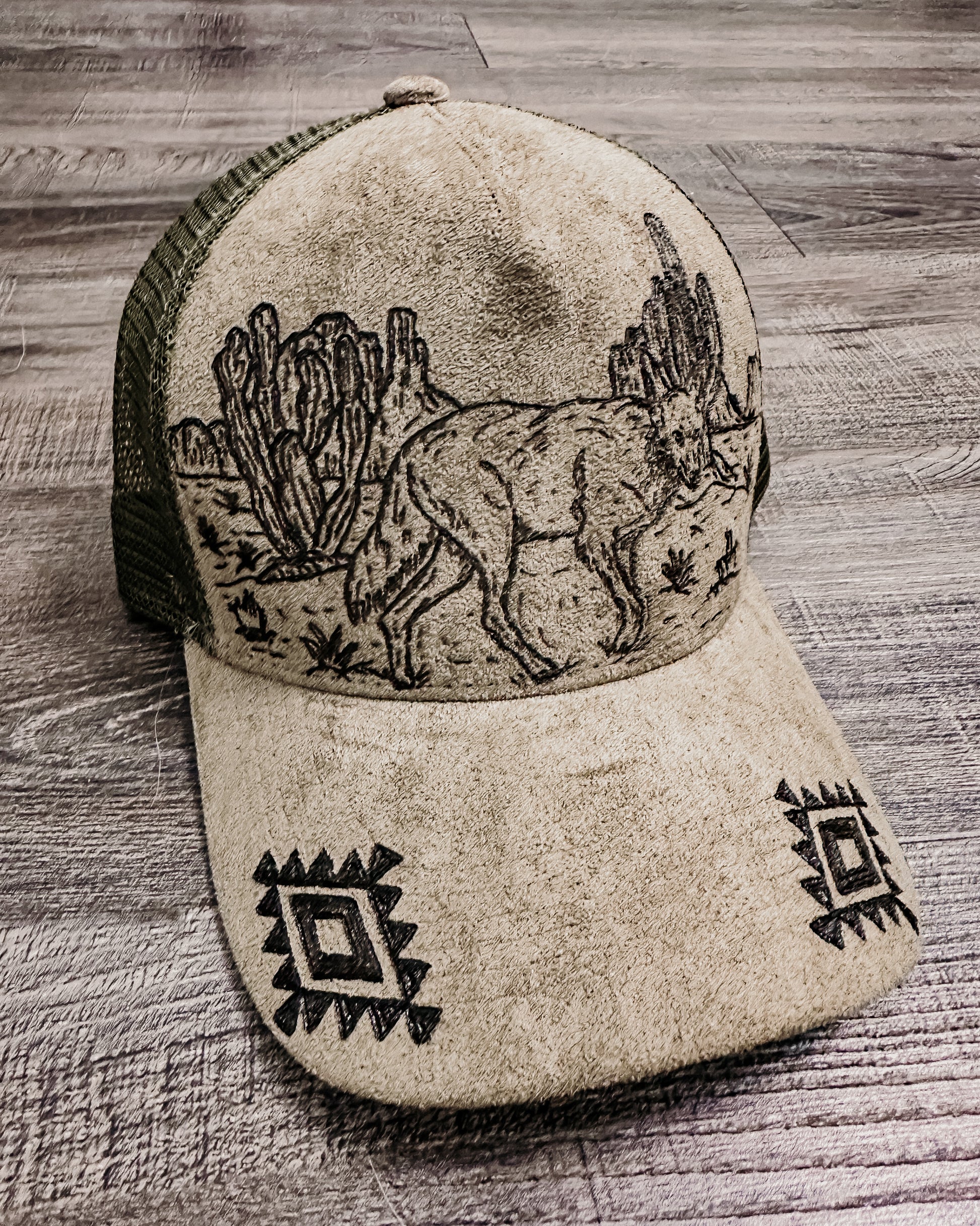 Embrace your wild side with the Desert Wanderer Hat, a hand-burned, one-of-a-kind olive green trucker hat. Featuring a desert scene with a coyote graphic and accented by an Aztec pattern on the bill, this hat captures the rugged spirit of the southwest. Every piece is individually hand-burned, giving it a uniquely authentic western vibe — perfect for any cowgirl ready to roam.
