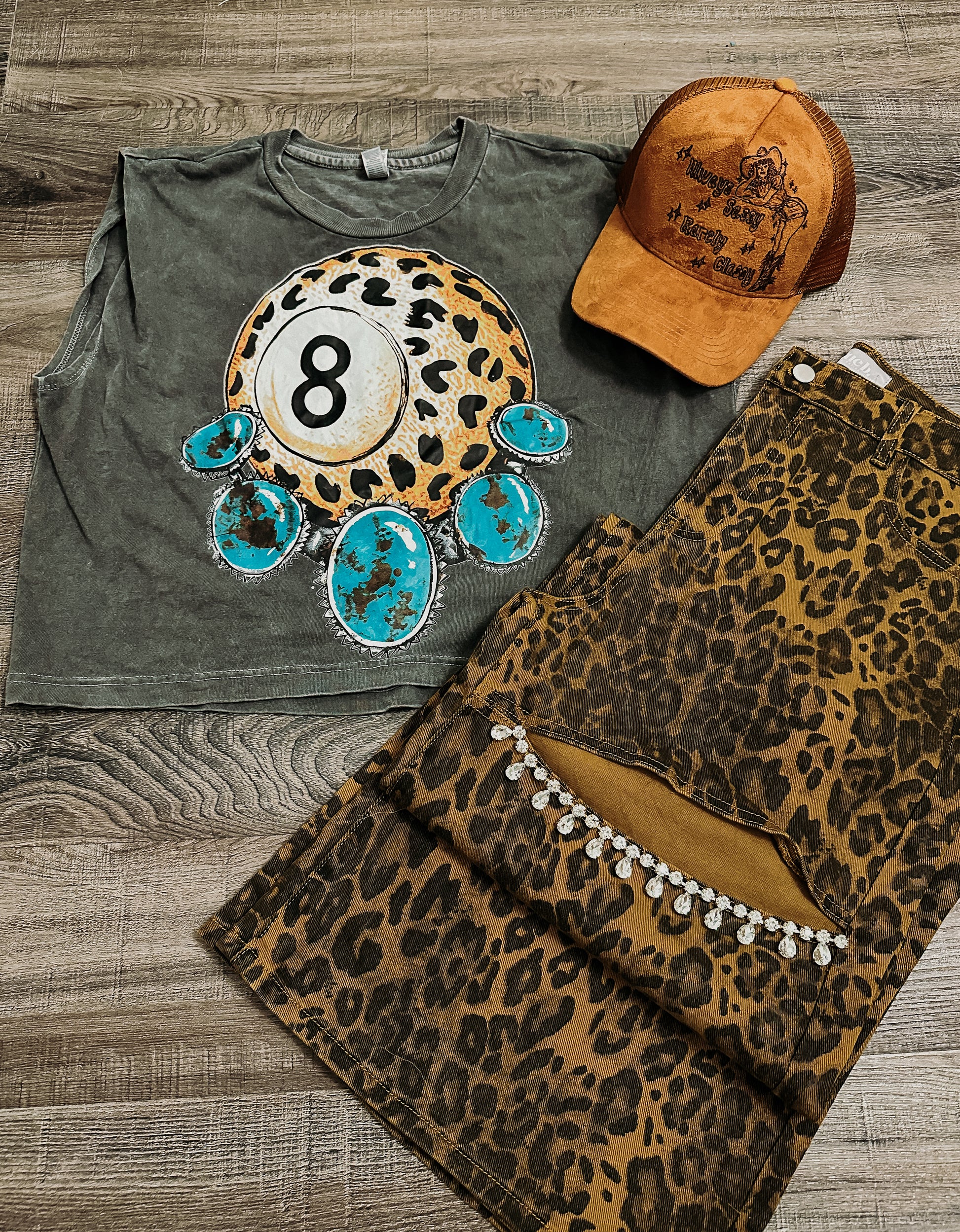It’s cheetah print. It’s a bold 8 ball. And it’s giving edge with attitude. The Eight Ball Hustle Tee is a cropped, sleeveless graphic in a washed black tone that brings instant street-style grit to your western wardrobe.