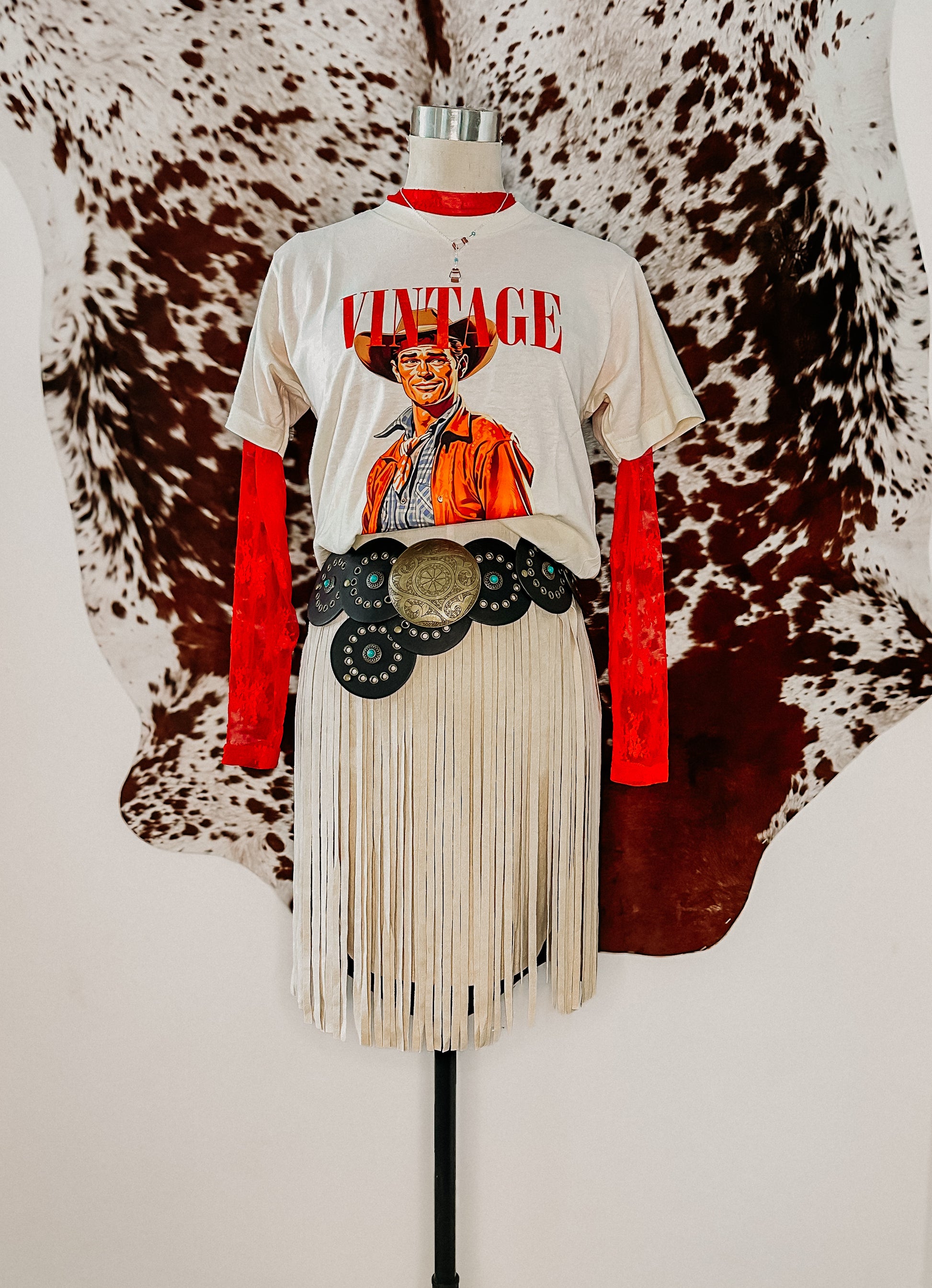 Indulge in luxury with The Fringe Rodeo Mini Skirt. Crafted from soft suede, this cream-colored boho western beauty is made for making a statement. The flattering mini length and playful fringe detail bring sass and style, making this a must-have piece for your wardrobe. Whether you're hitting the NFR or just channeling that cowgirl spirit, this skirt is a total showstopper.