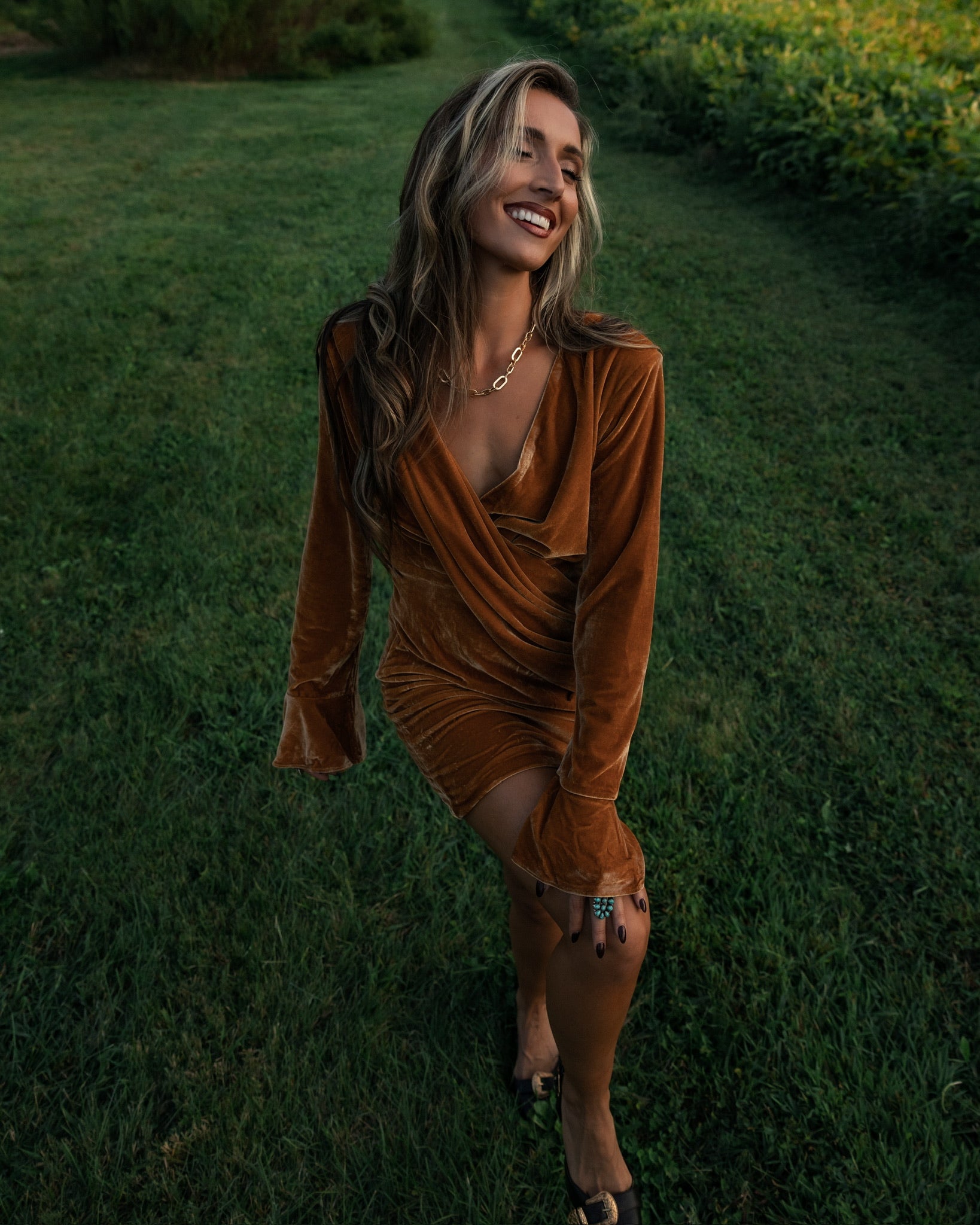 Turn heads from sundown to showtime in the Golden Hour Dress. Soft, velvety, and ultra-stretchy, this mini dress was handpicked by Liz for its bold Wild at Heart energy. With a flirty open back, dramatic flared cuffs, and a draped front, it’s the ultimate statement-maker for NFR nights, concerts, or any time you’re chasing the spotlight. Available in this exclusive fall mustard shade, it’s your new go-to for making an entrance.