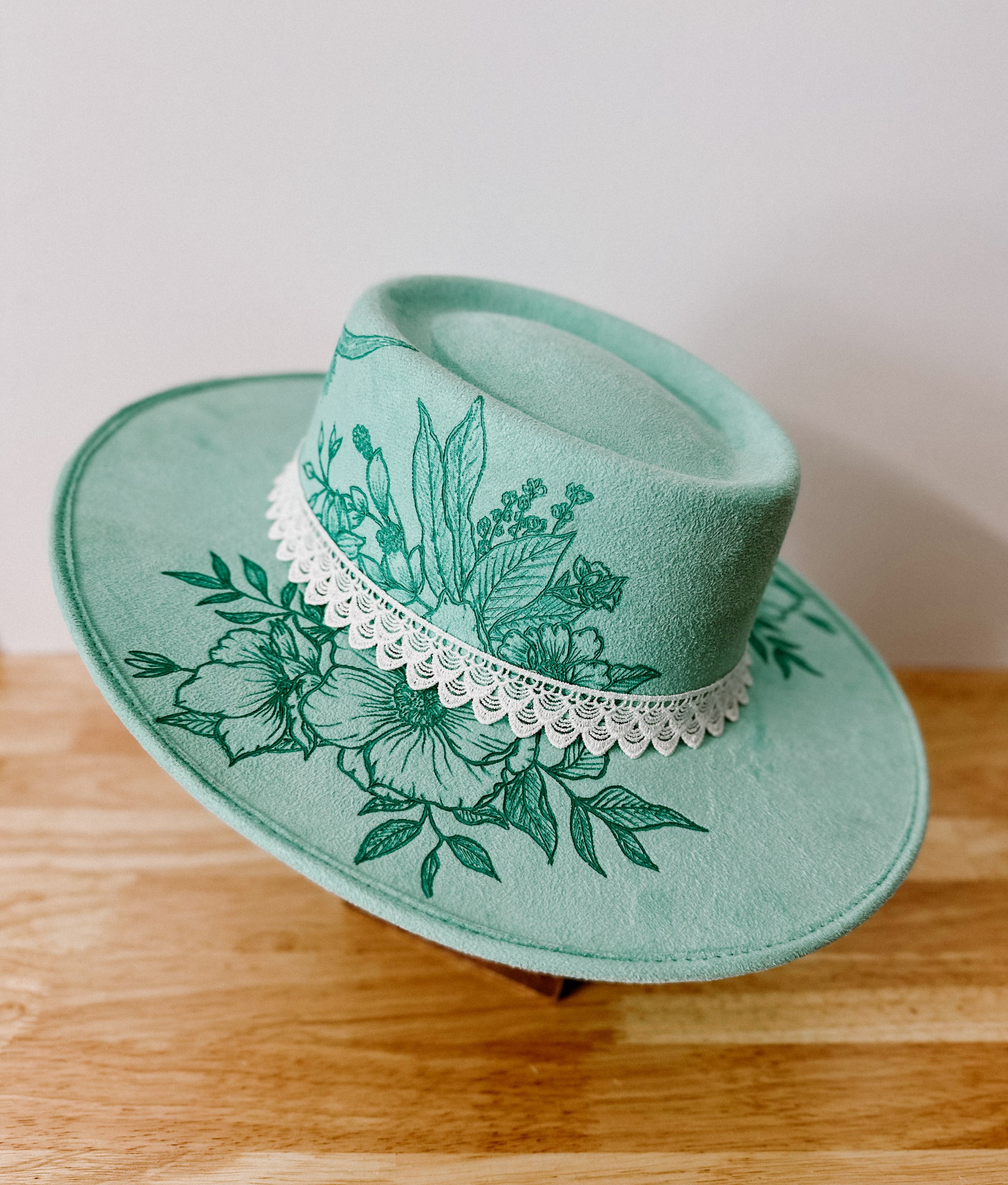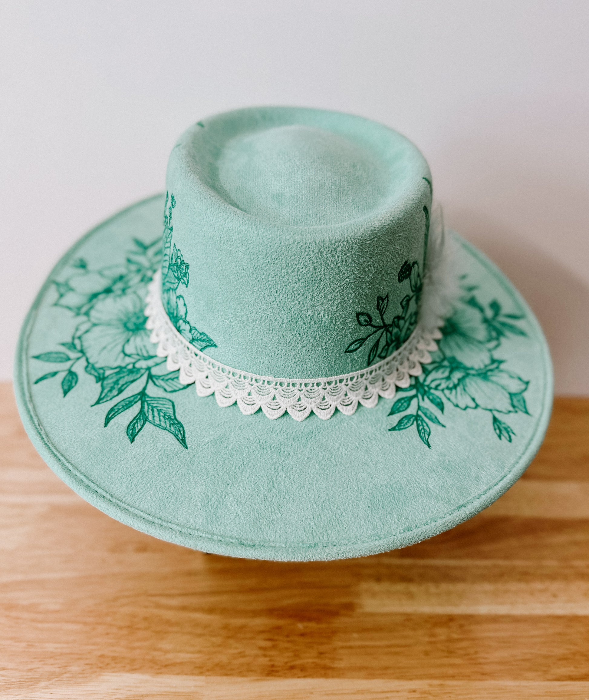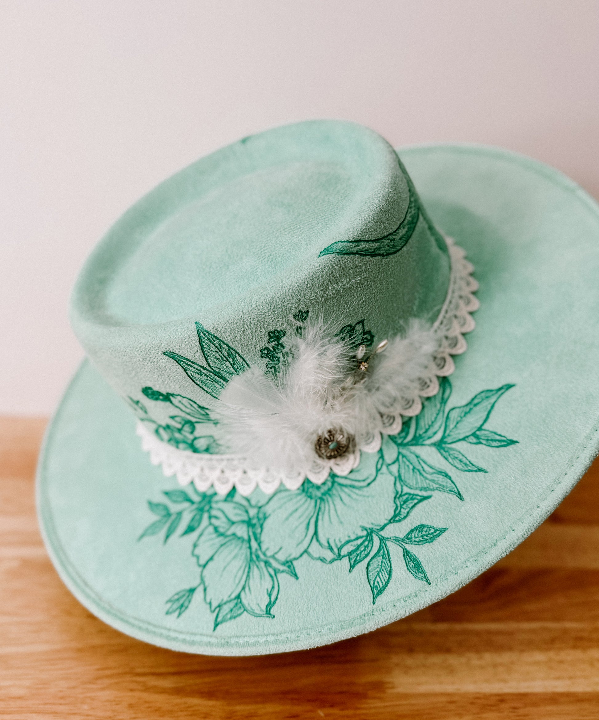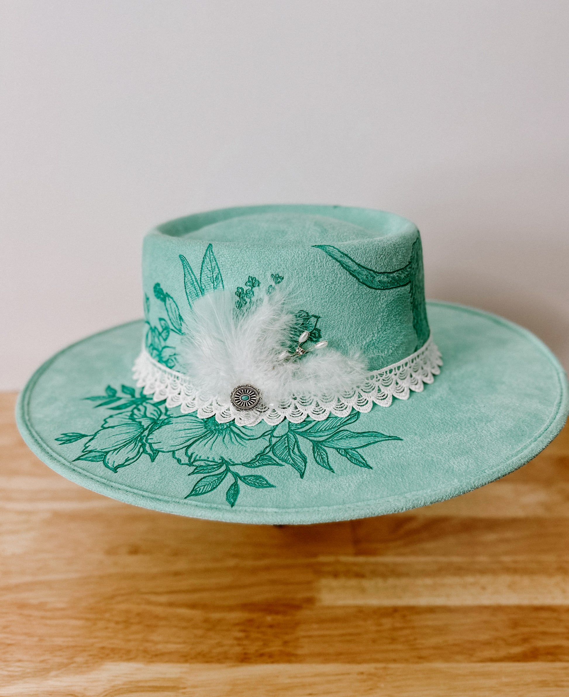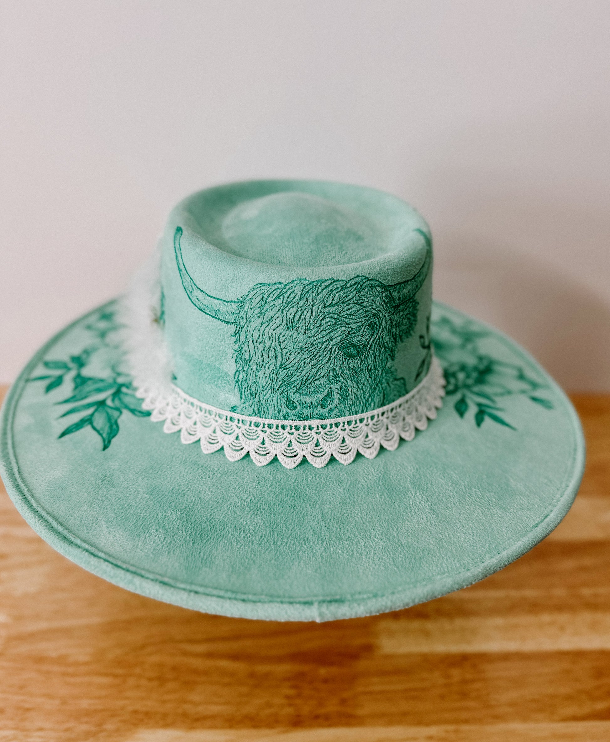 She’s bold, she’s serene, and she knows how to turn heads from the first tilt. The Highland Haze Rancher is a wide brim beauty in a soft turquoise mint tone, hand-burned with dreamy floral sprays along both sides of the brim that trail upward into the crown. On the back? A majestic Highland cow steals the show — every detail burned by hand, every inch dripping with intention.