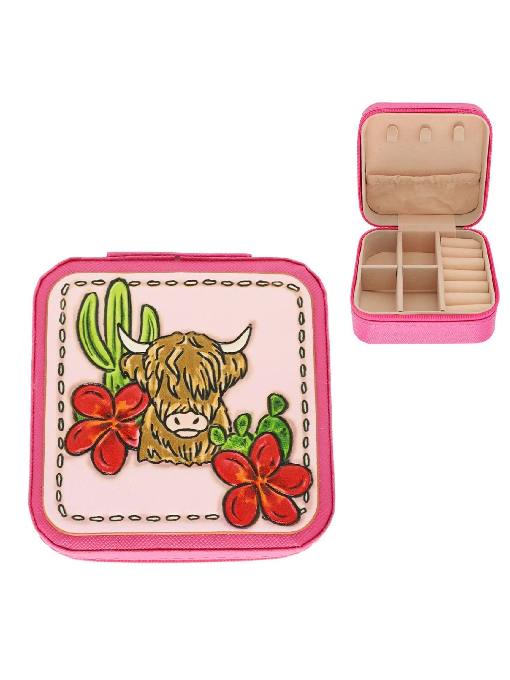 Travel in style with the Highland Hideaway Box. Crafted from genuine leather, this small travel-sized jewelry box is perfect for keeping your precious jewelry safe and secure on the go. The beautifully detailed Highland Cow tooling design adds a rustic western flair, making it a must-have accessory for cowgirls who love a little charm.