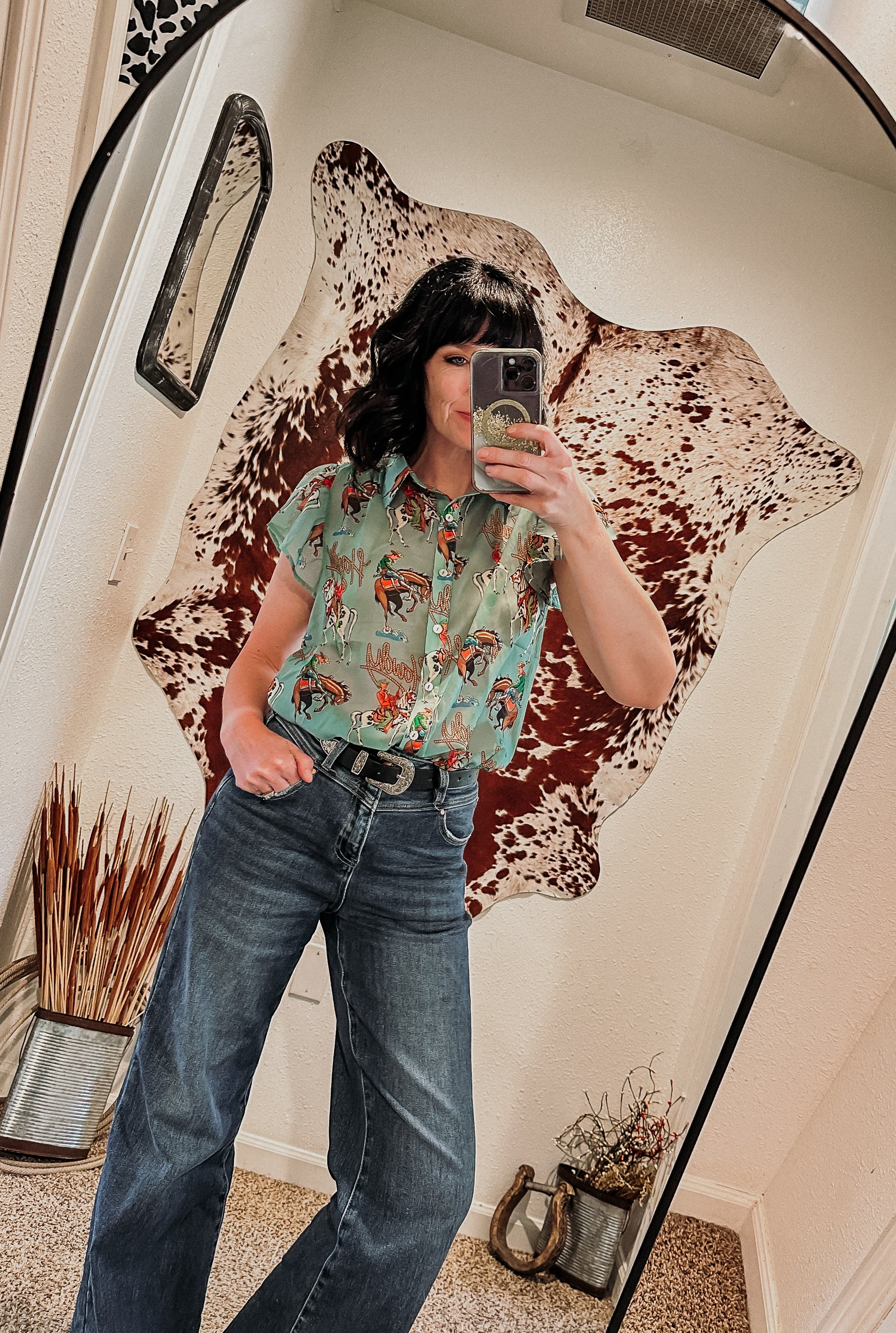 Sweet, sassy, and ready to steal the spotlight — the Howdy Darlin Blouse is the kind of top that turns “just running errands” into a full-blown fashion moment. With its dreamy blue hue, fluttery sleeves, and playful horse + “Howdy” print, this button-down beauty is giving rodeo chic with a whole lotta charm.