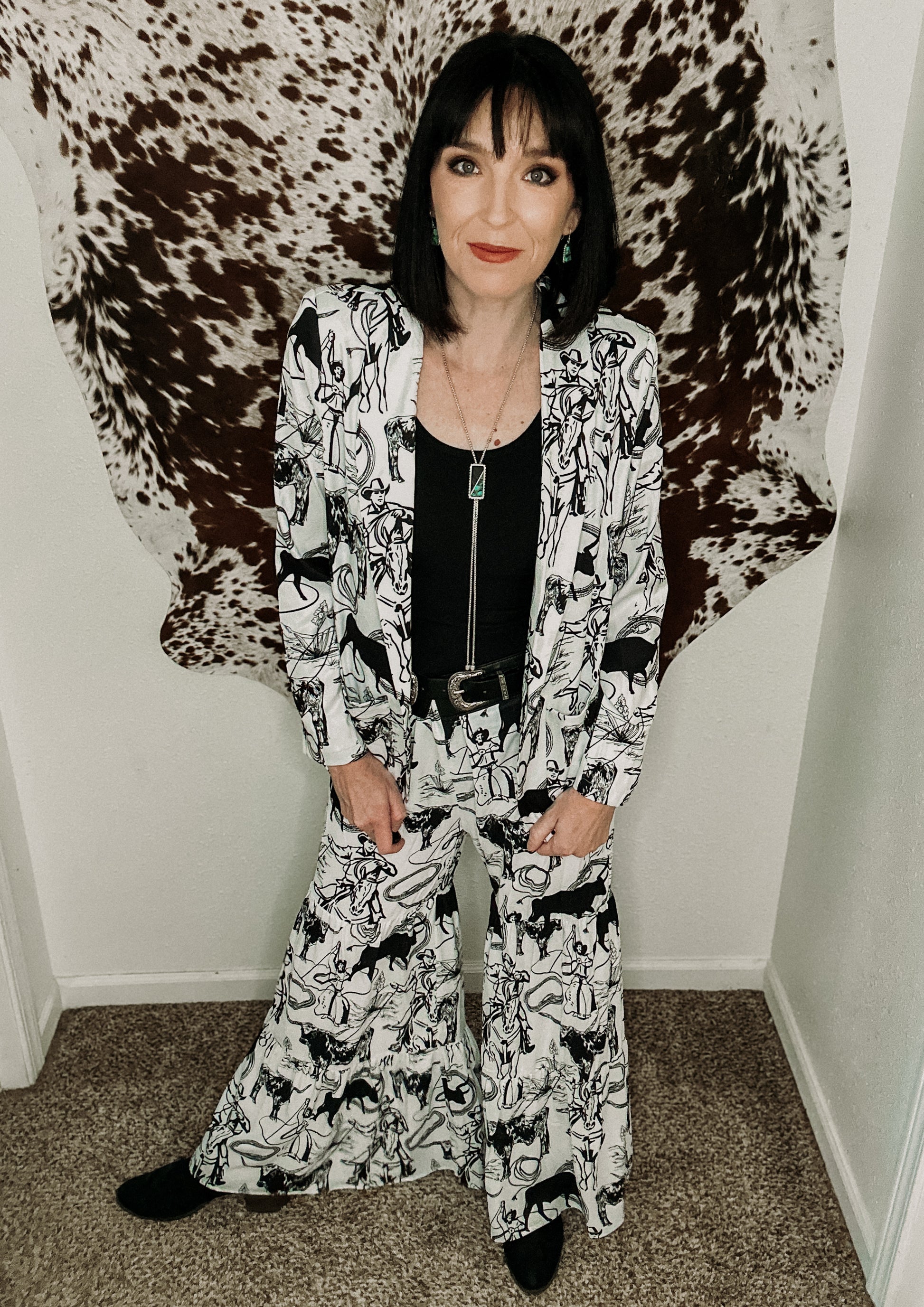 Wild, ruffled, and ready to stomp the style scene—The Lasso Luxe Ruffle Pants are a whole cowgirl statement in one ultra-comfy piece. With tiered ruffles, a longhorn print, and soft poly fabric, these pants bring western flair with fashion-forward fire.