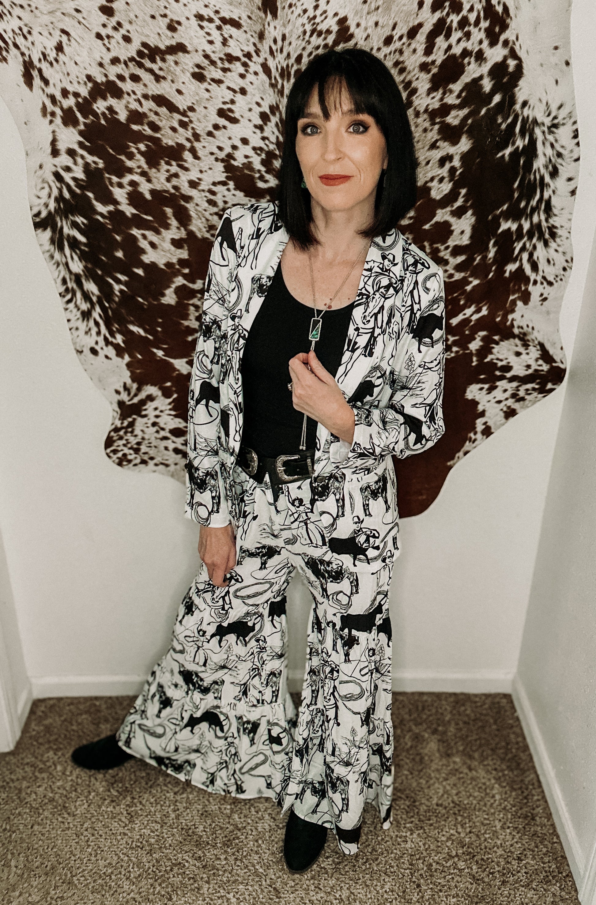 🪶 Style tip: Go full send with the matching blazer and chunky accessories—or rock 'em with a cropped tank and a western hat for a concert-ready look.