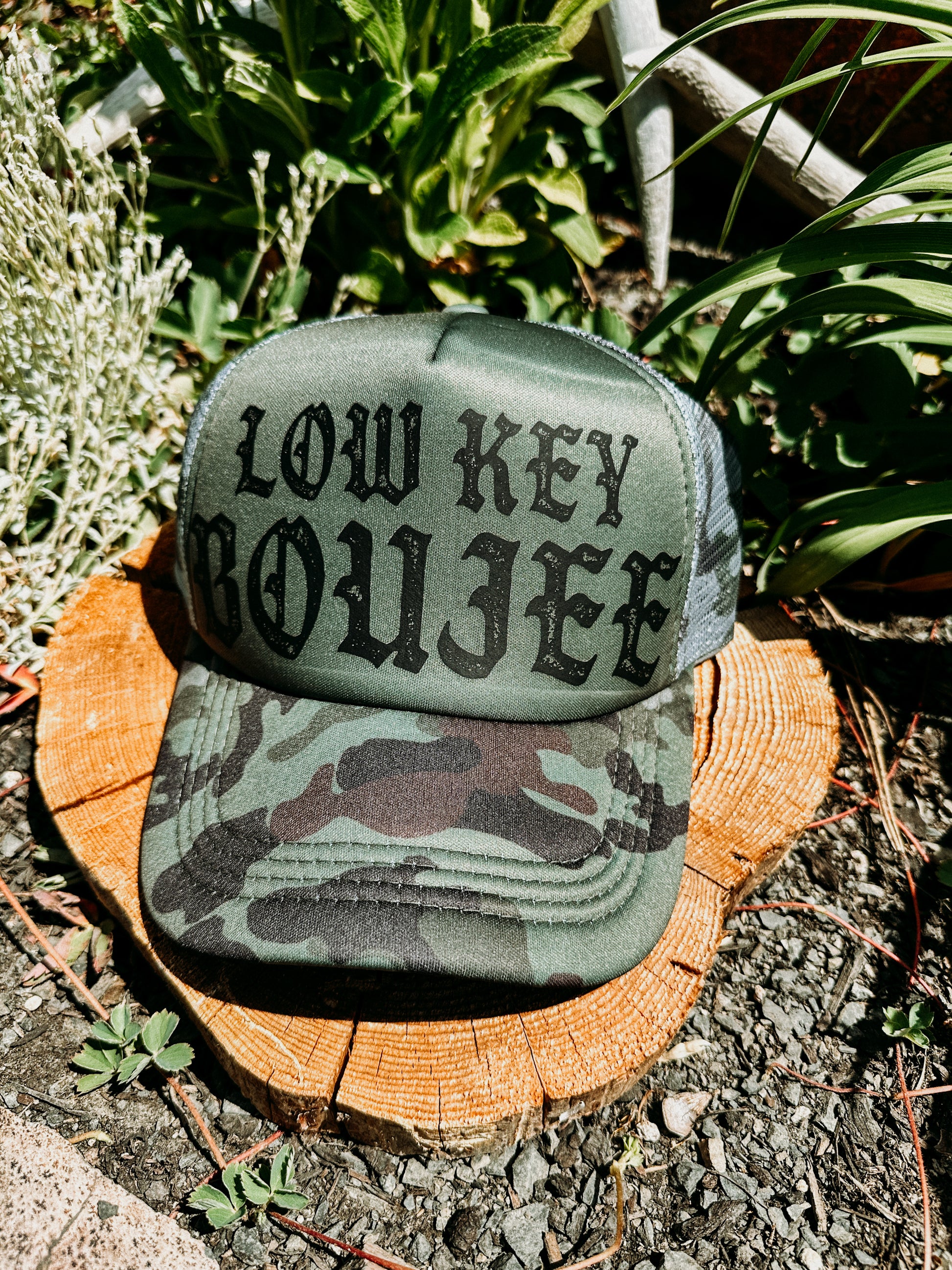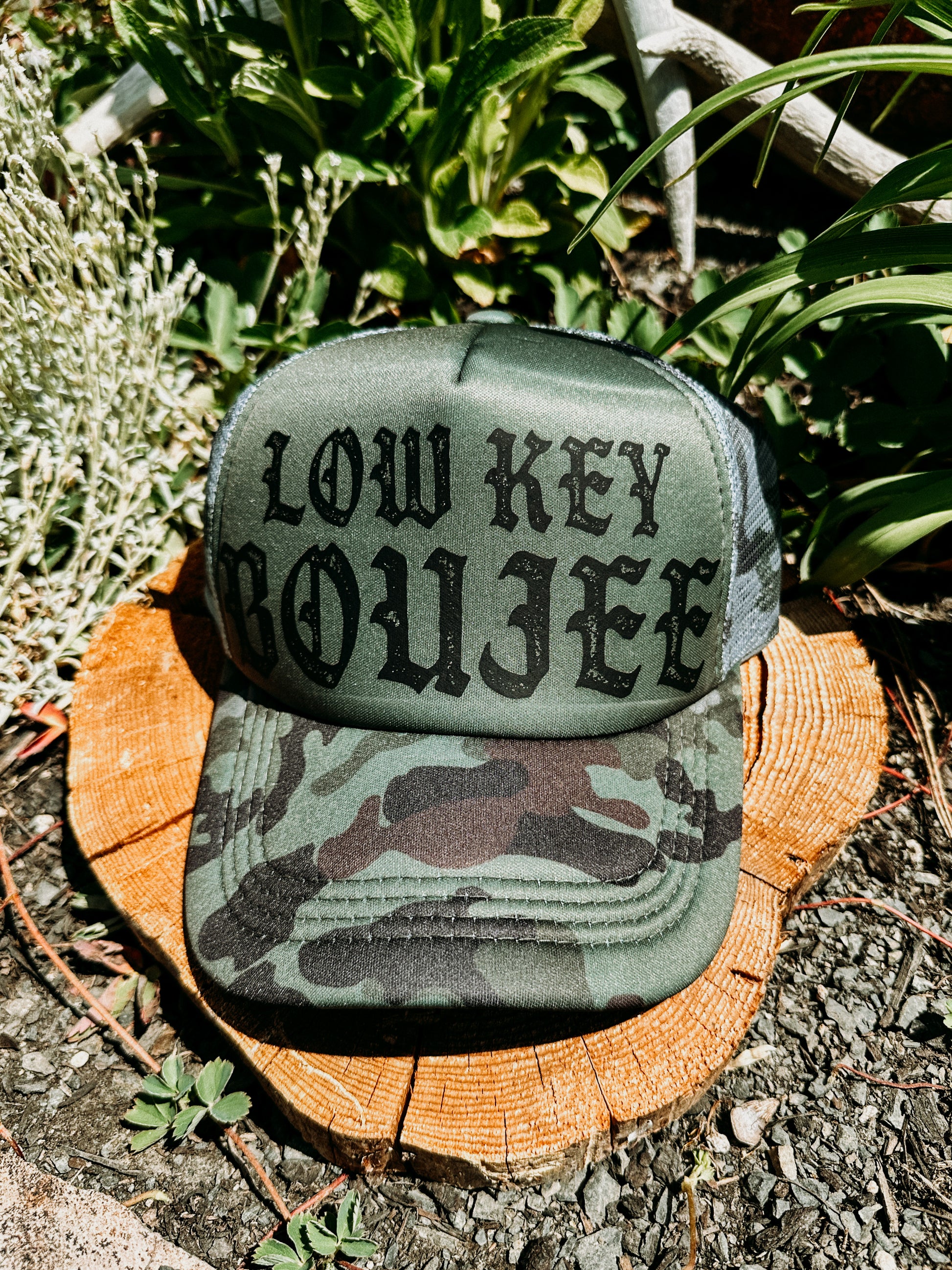 This camo foam trucker keeps it cool with bold black “Low Key Boujee” text across the front—because why yell when your vibe says it all?
