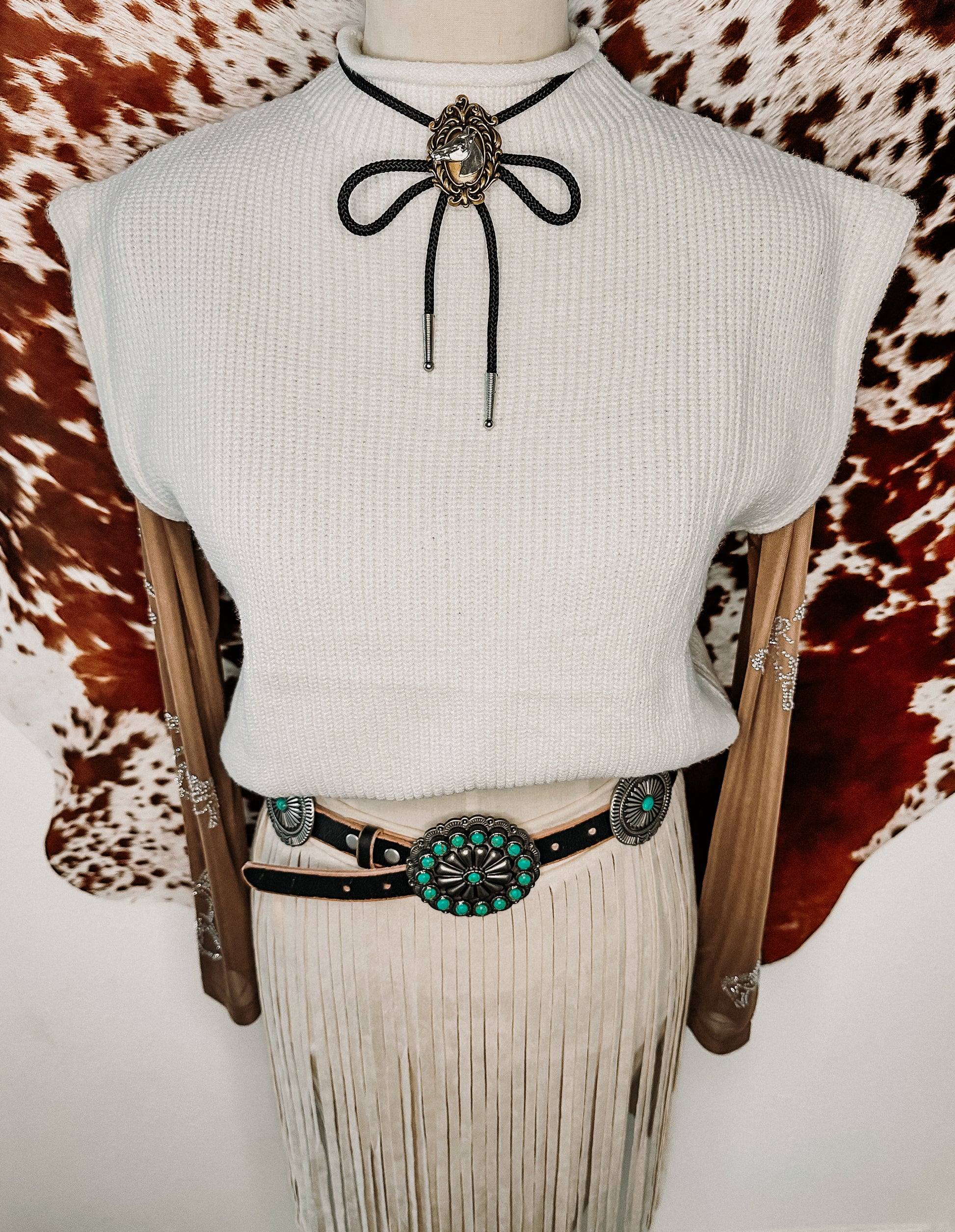 Minimalist meets cowgirl chic in The Moonlit Muse Top. This sleeveless ribbed sweater with a mock neck is a versatile piece that effortlessly blends comfort and style. Crafted from soft knit material, it’s perfect for layering or wearing solo.
