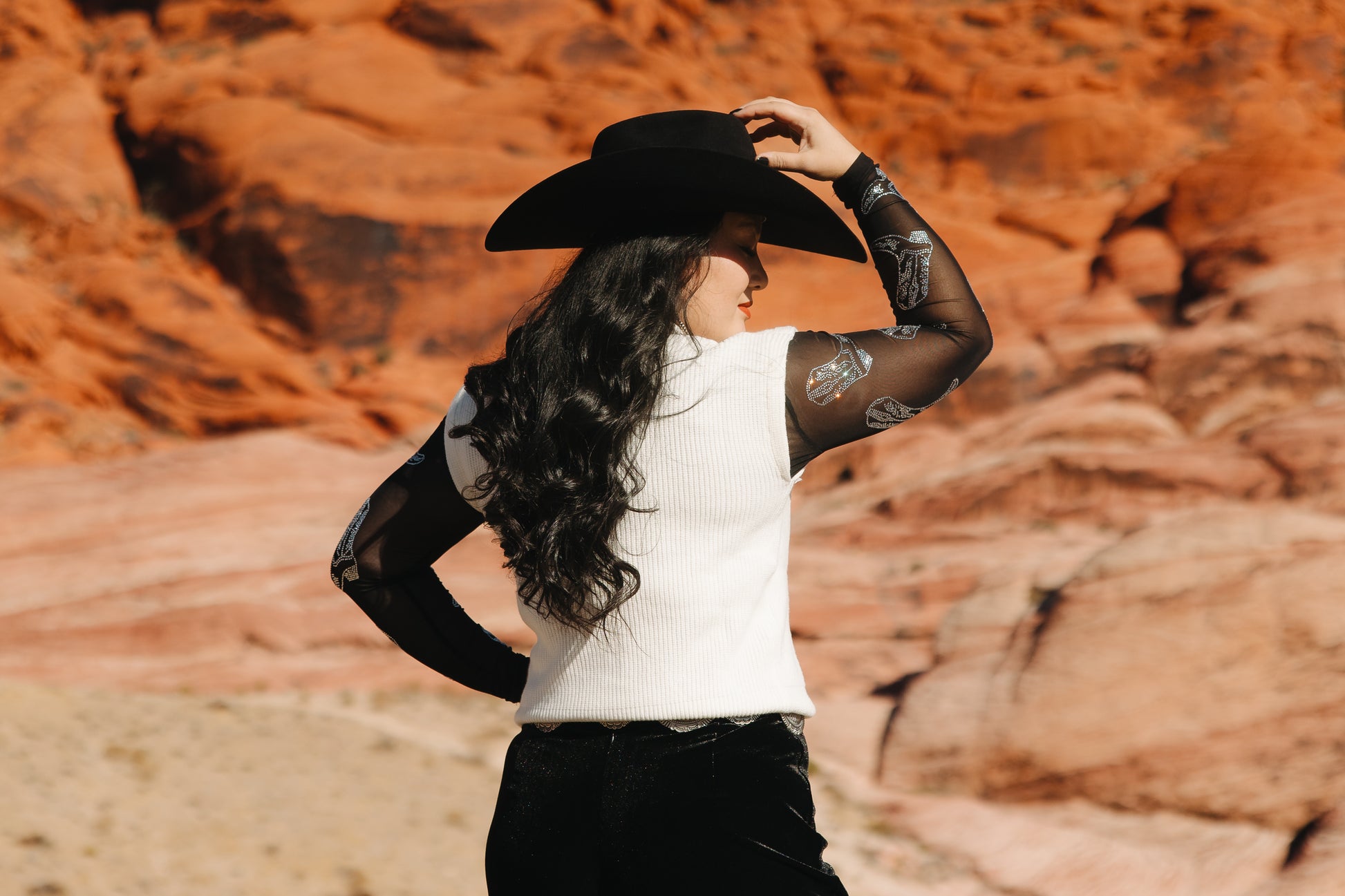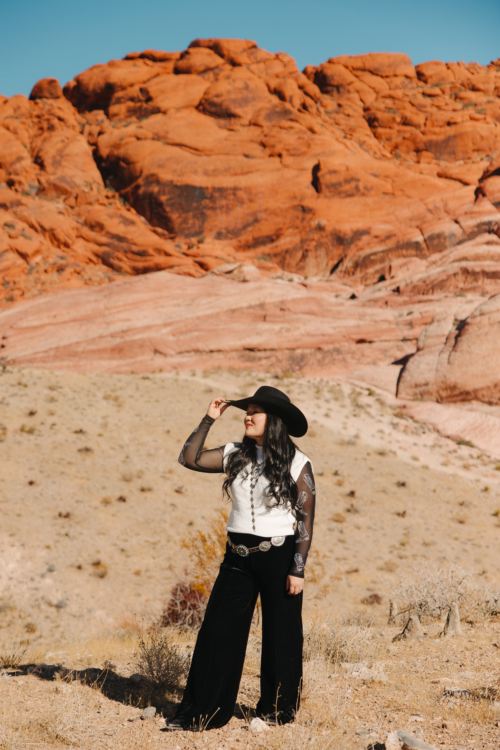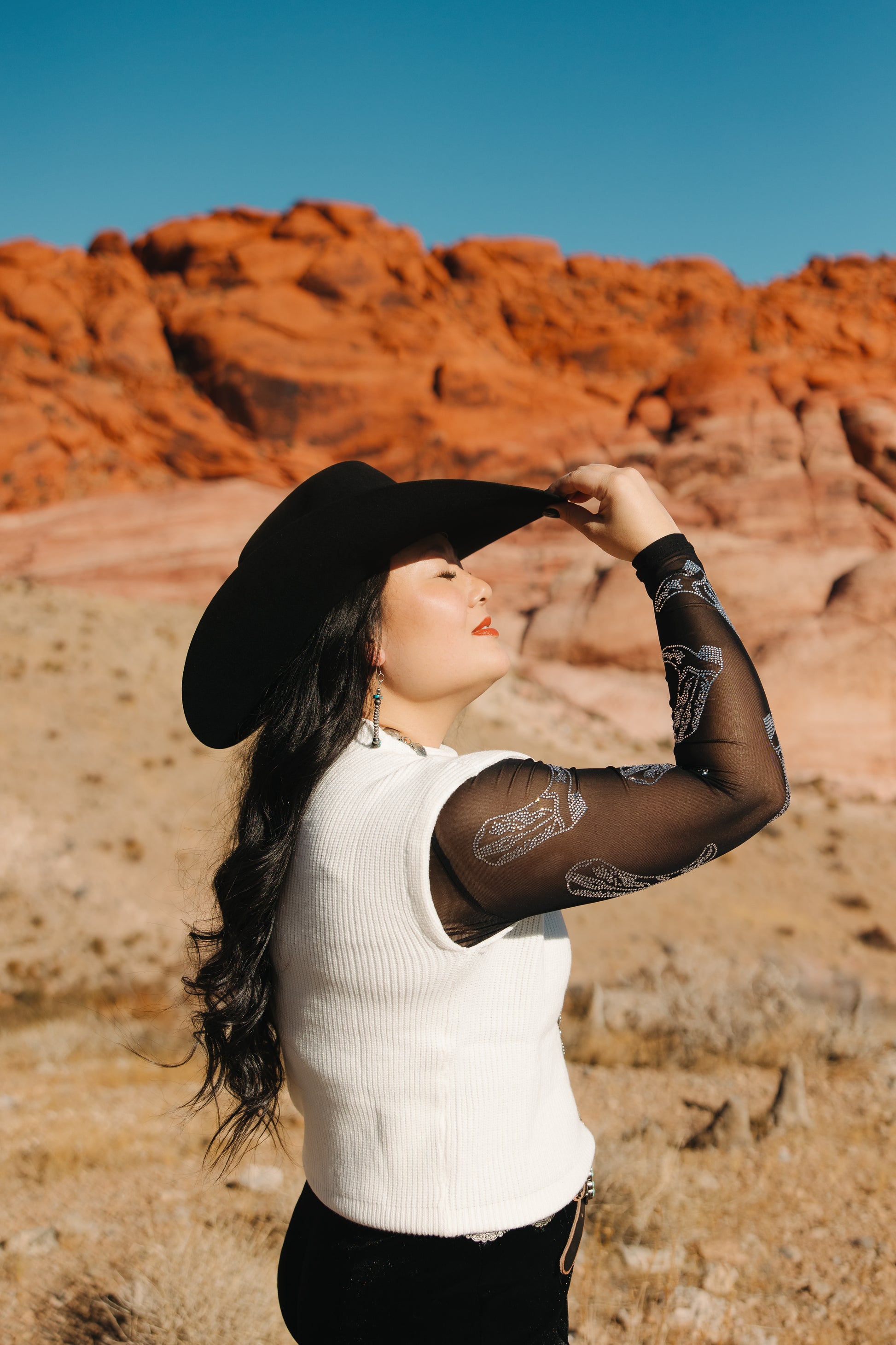 As seen on Kelle Belle at NFR 2024, styled with The Midnight Stampede mesh top, this top can be dressed up for an event or worn casually for a laid-back cowgirl vibe.