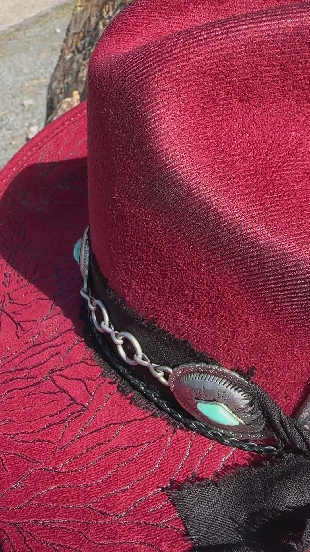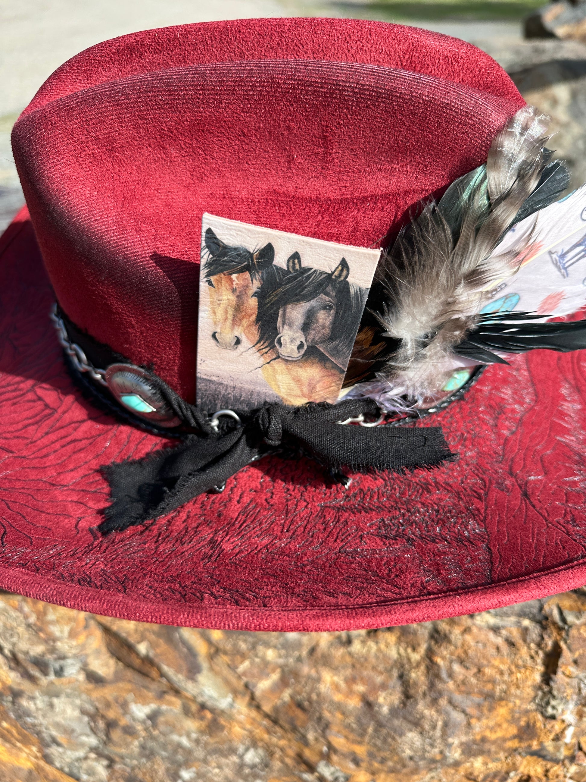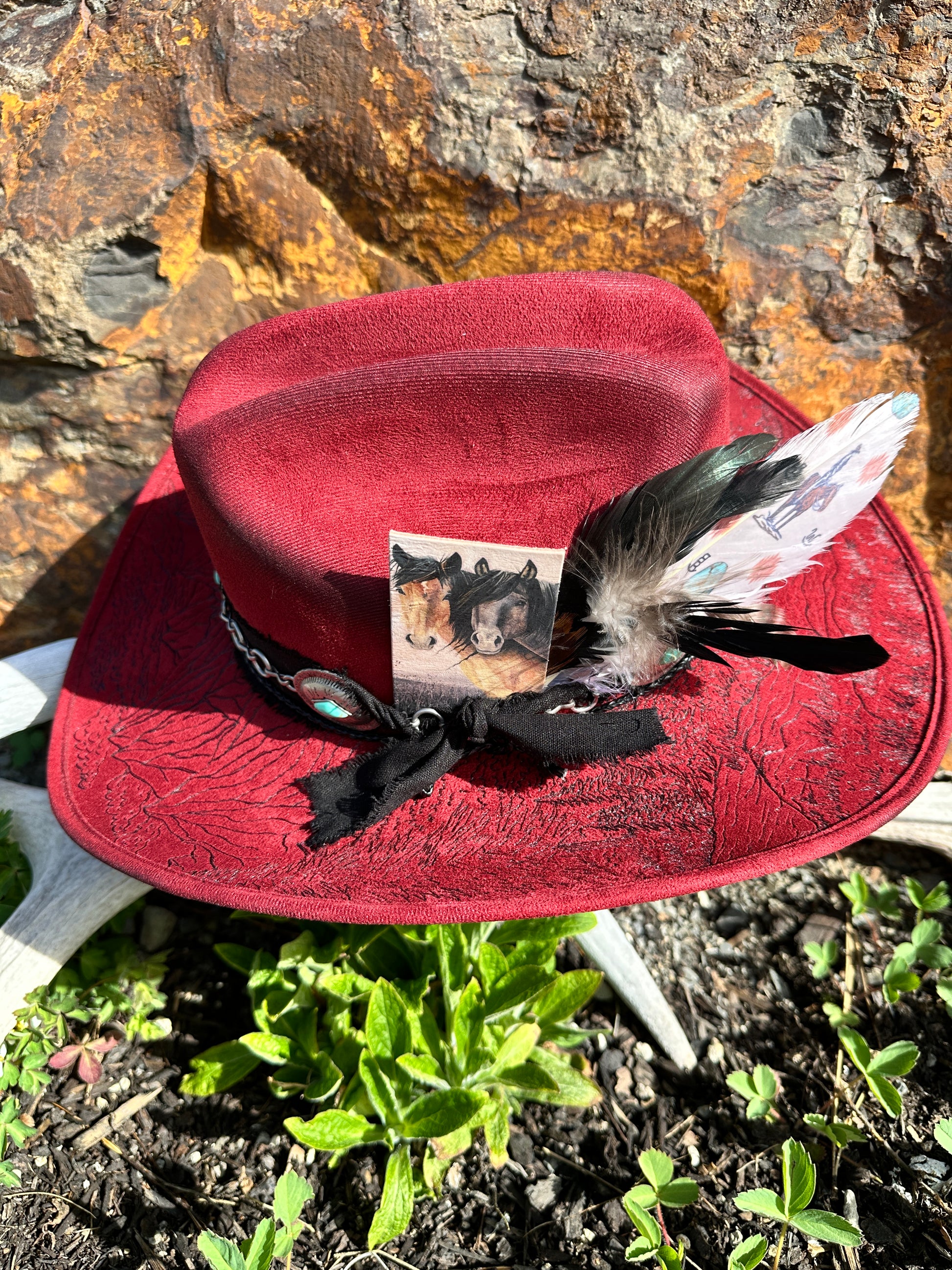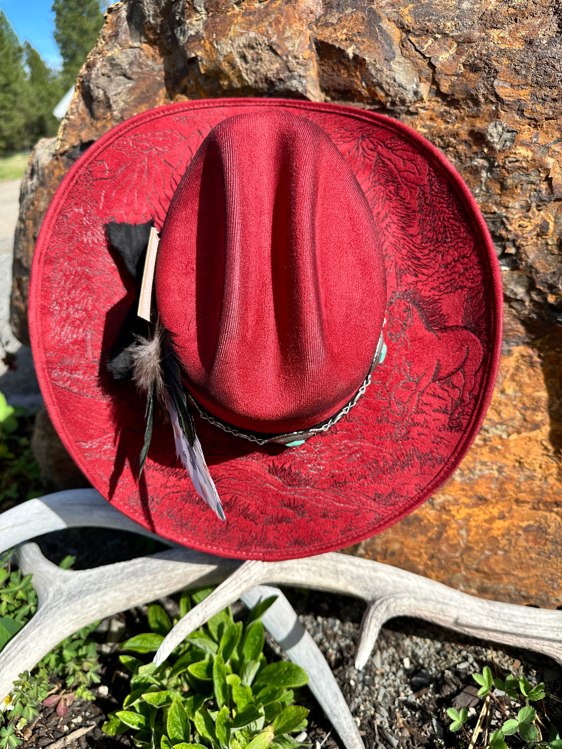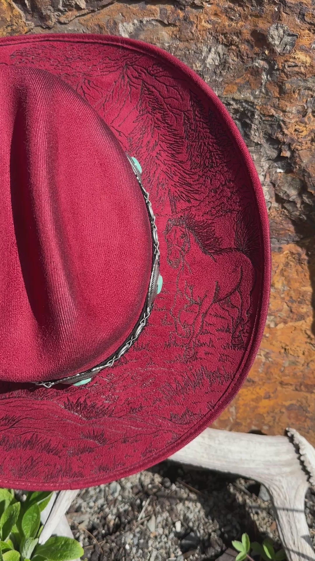The Mountain Run Hat is a rich red wine cowboy hat, hand-burned with a sweeping mountain scene and flowing stream across the top of the brim, with a running horse leading the way. Every detail is meticulously burned by hand — no mass production, no duplications.
