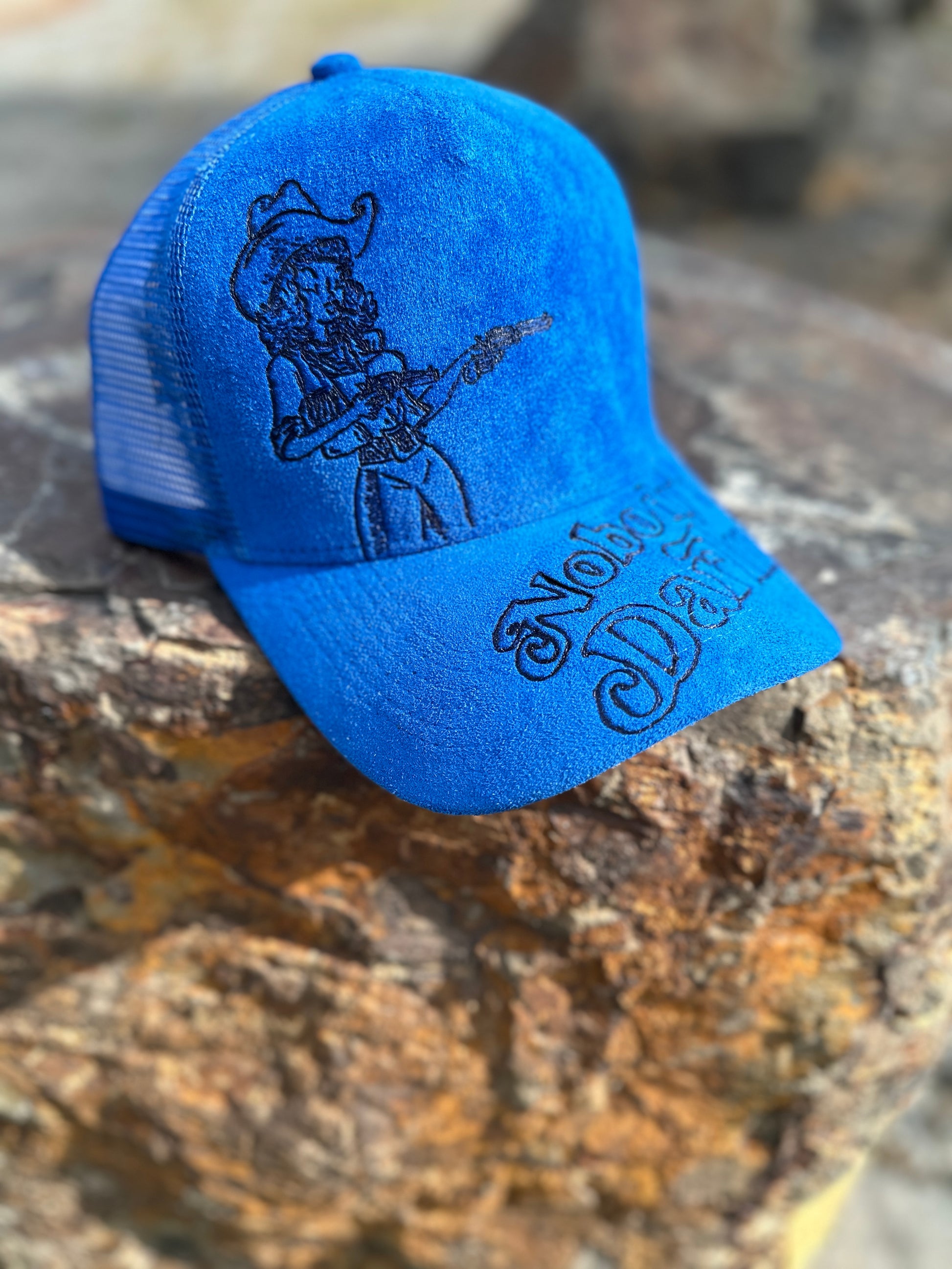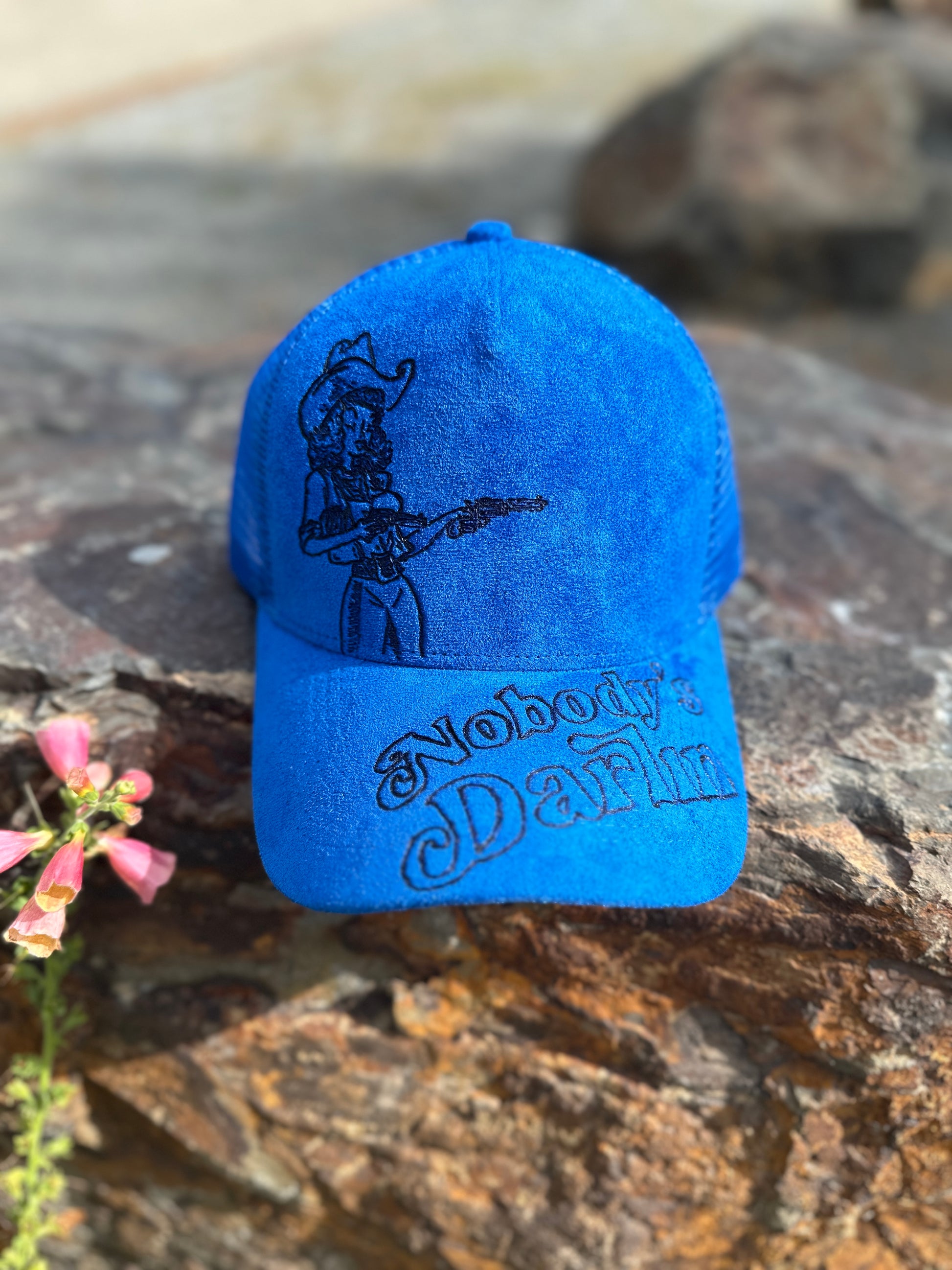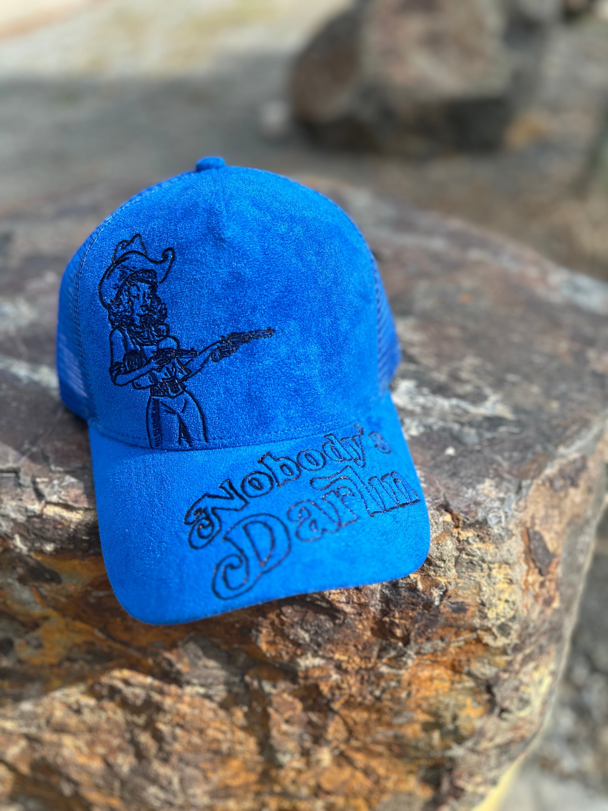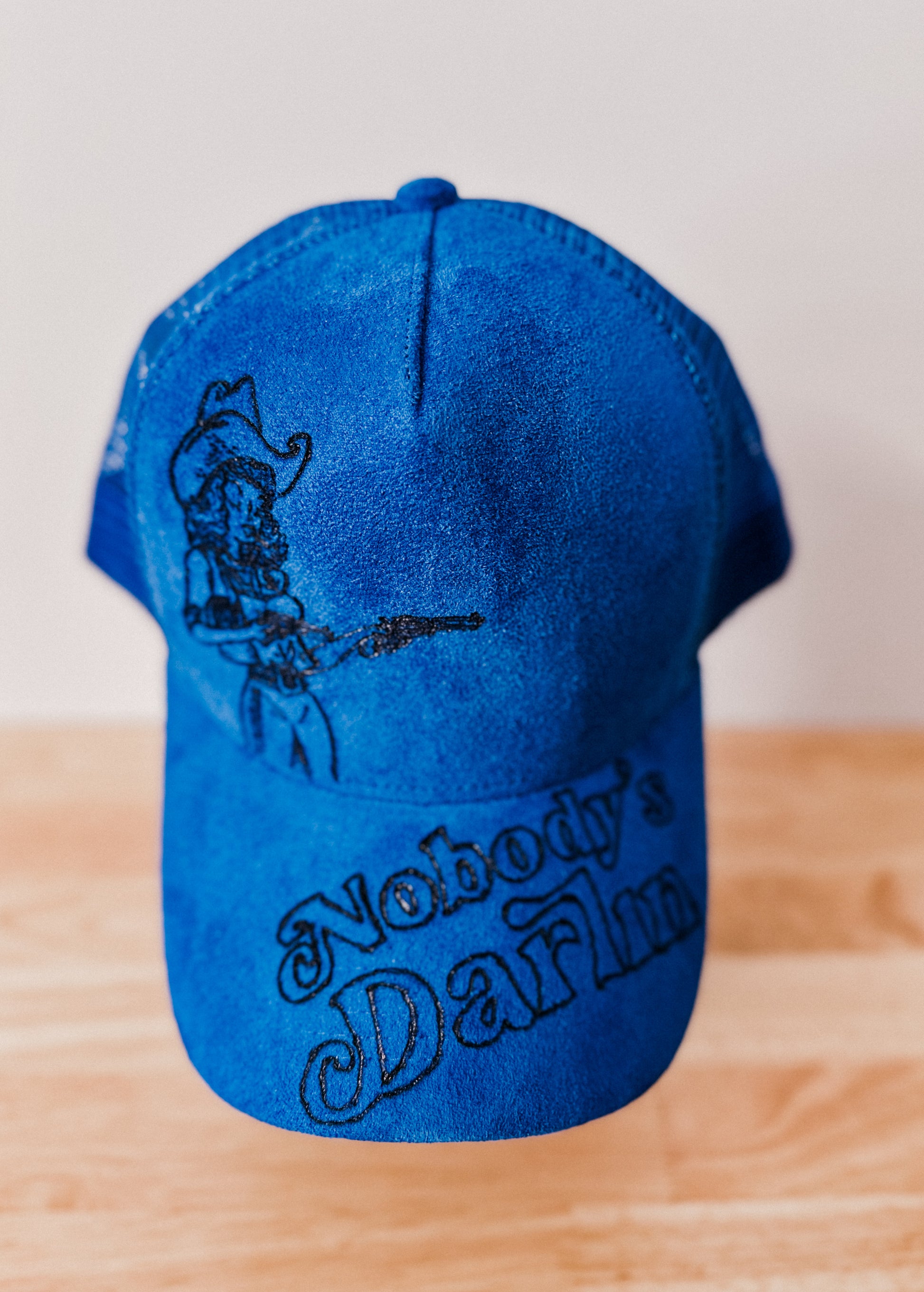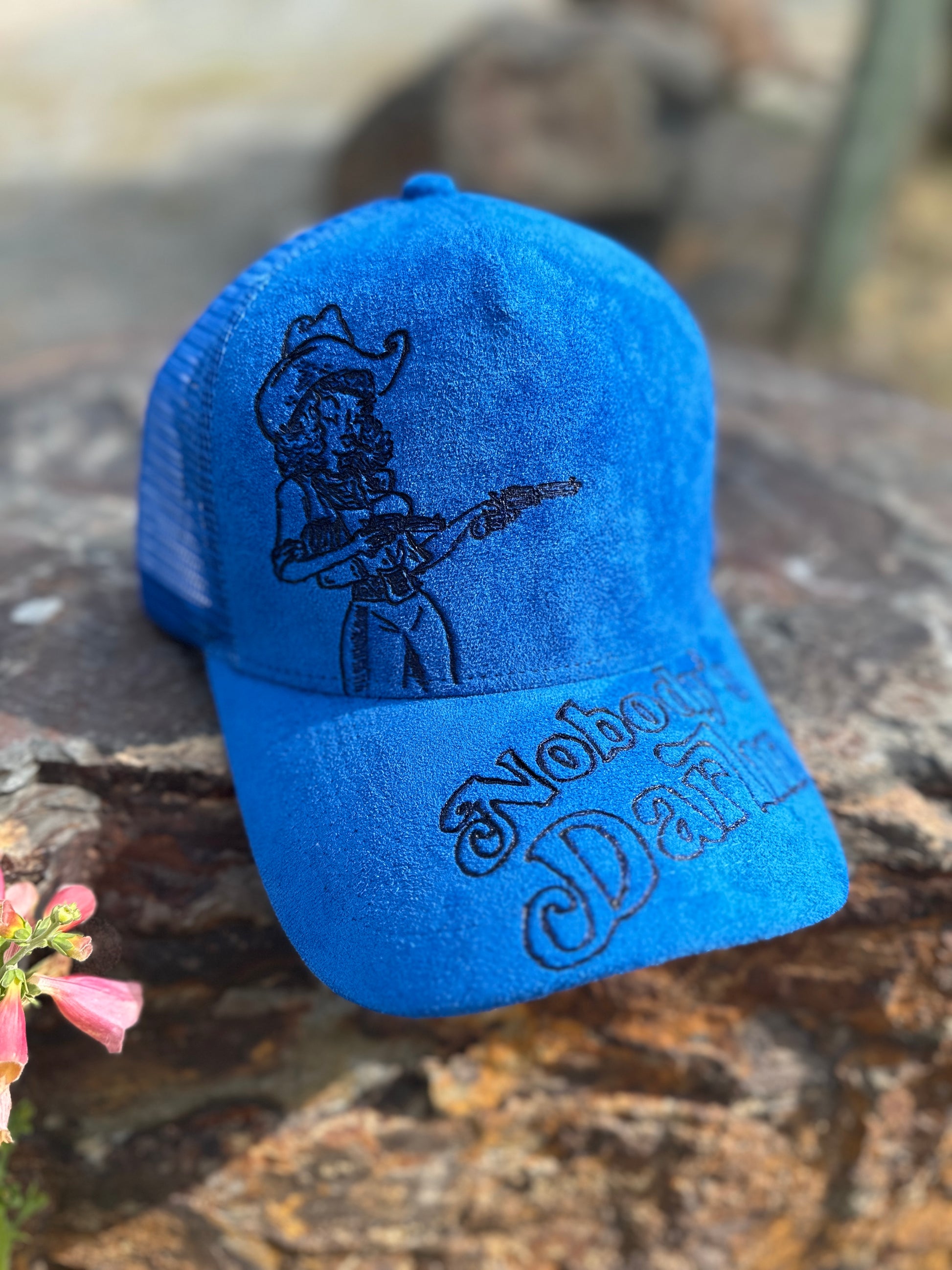 Embrace your independent spirit with the Nobody's Darlin Hat, a hand-burned, one-of-a-kind blue suede trucker hat. Featuring a vintage cowgirl graphic paired with the bold saying "Nobody's darlin," this hat was made for the wild, free-spirited cowgirl who refuses to be tied down. Each piece is hand-burned, making every hat uniquely yours — no two are ever exactly the same.