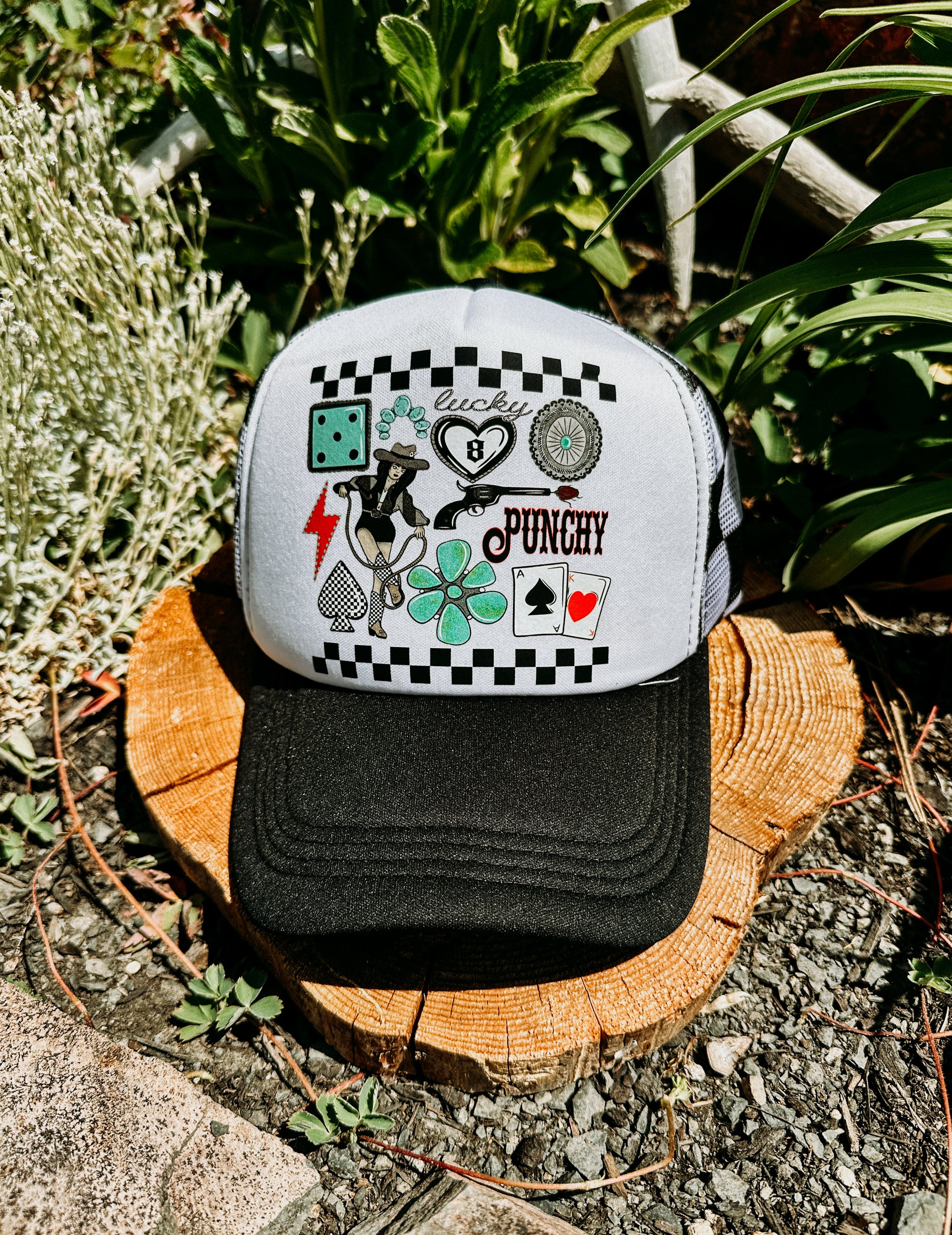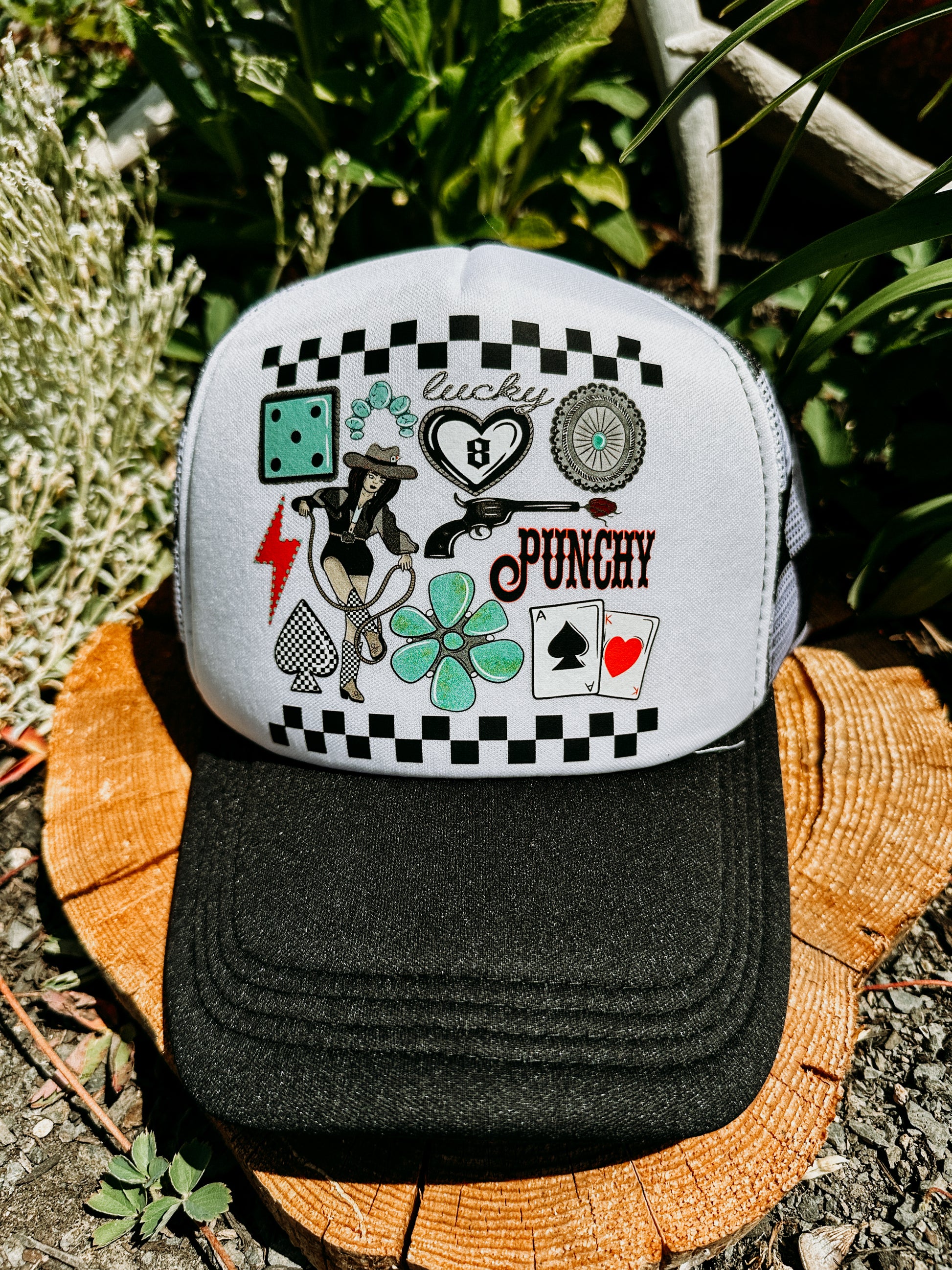 This black foam trucker with black-and-white checkered mesh is covered in a bold western collage featuring pistons, rope, hearts, dice, conchos, and a whole lotta cowgirl energy.