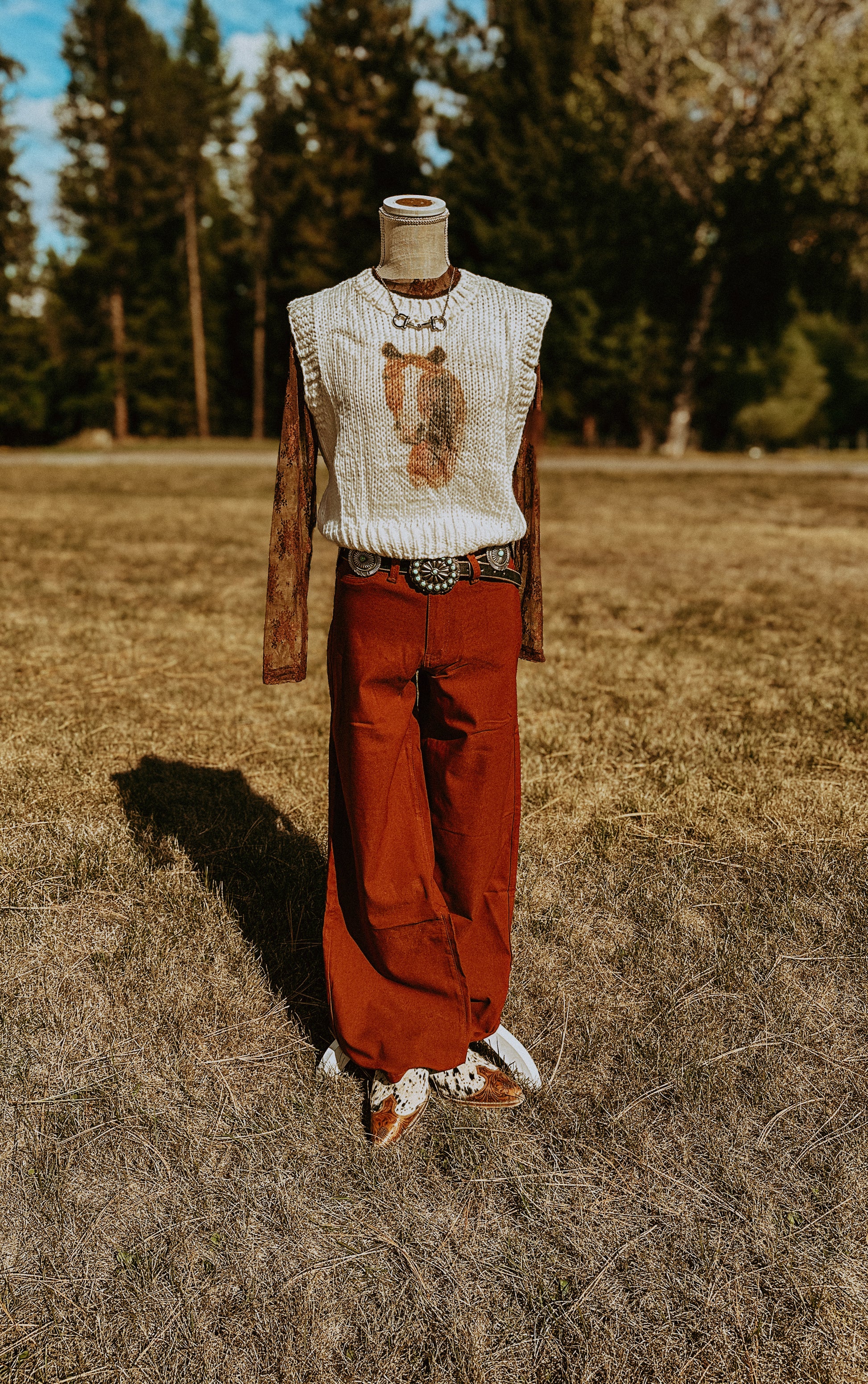 Add a touch of rustic charm to your fall lineup with the Painted Horse Pullover. This cream-colored knit vest is stitched with an intarsia-style horse motif that steals the spotlight while keeping true to Americana roots. Crafted with a hand-knit look and chunky yarn texture, it’s finished with ribbed trim at the neck, arms, and hem for that structured yet effortless silhouette. The slightly cropped fit makes it perfect for layering — toss it over a button-up, a dress, or your favorite tee for instant western chic.