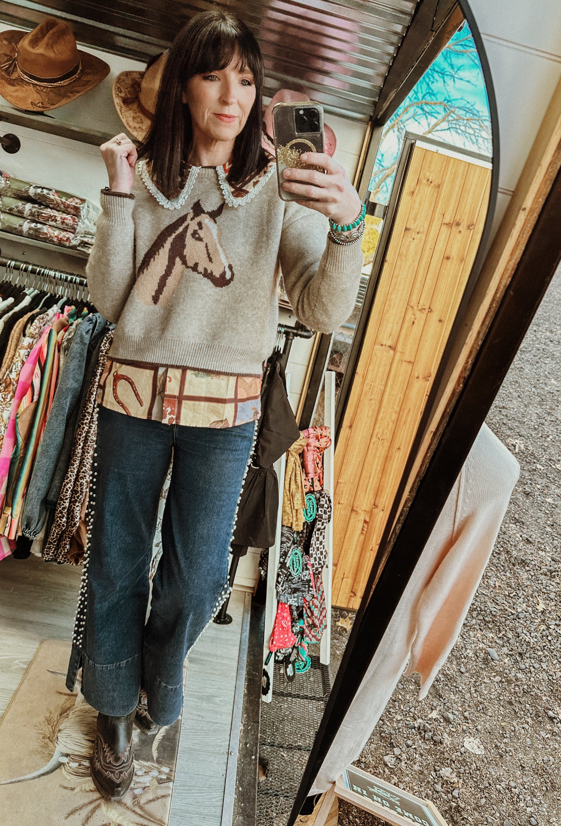 Meet your new show-stopping denim — the Pearl District Denim brings a glam twist to the rodeo classic. These mid-rise flares feature side slits trimmed in luminous pearls that catch the light with every step. The dark wash gives them that sleek, dress-it-up energy, while the flared cut keeps your Western roots front and center.