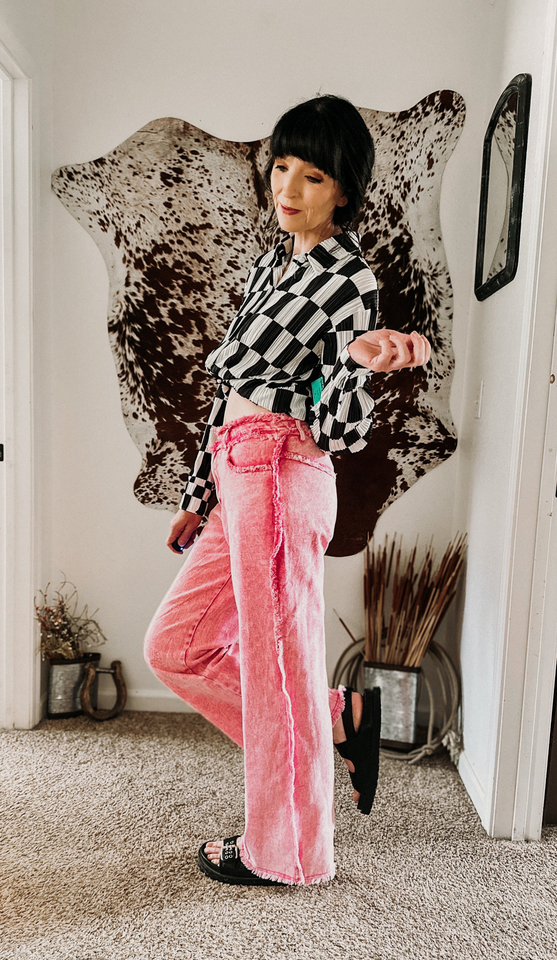She’s soft in color but sharp in attitude. The Pink Smoke Pants bring that slow-burn kind of edge—stone-washed bubble pink denim with a frayed seam finish and a classic straight leg cut. These britches are made for the girl who can rock pretty in pink and still stomp the dust off her boots.