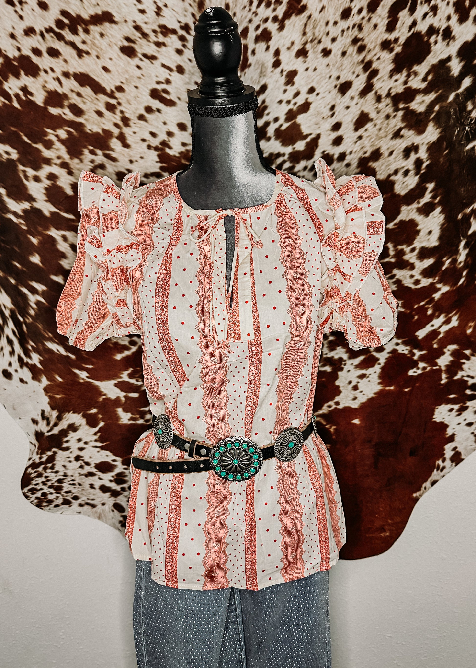 Flirty meets fearless in the Prairie Daydream Blouse—a mixed print puff sleeve top that brings the bold without sacrificing comfort. With ruffled flutter sleeves, a soft V-neckline with a tie detail, and a lightweight feel, she’s ready for sunny days and western ways.