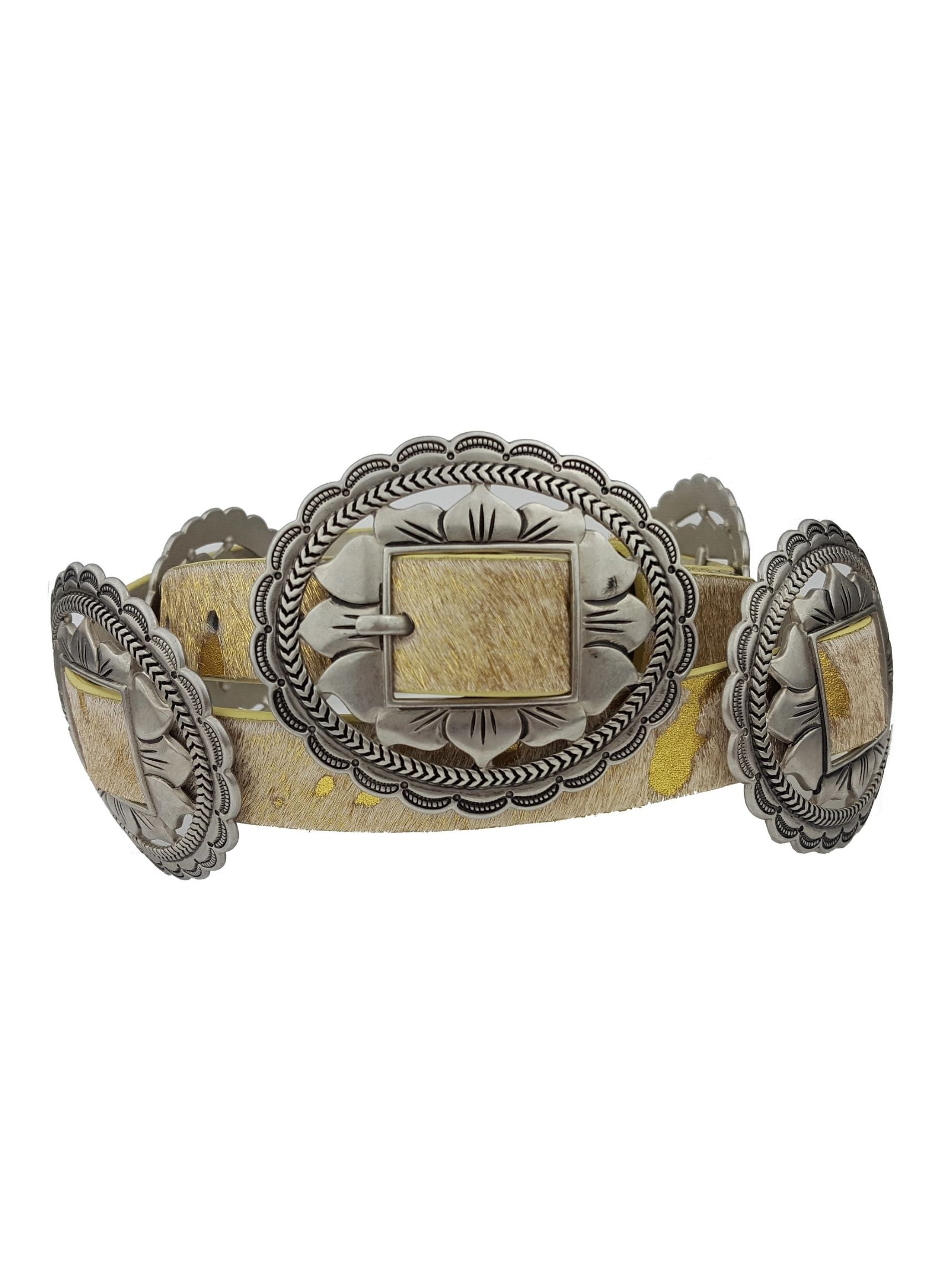 Add a touch of rustic elegance with the Prairie Rose Belt. Featuring intricate floral conchos and genuine cow hair for a unique western touch, this belt is perfect for cowgirls who love bold accessories. The detachable buckle gives you versatility, while the 4 conchos and sleek design make this a true standout.