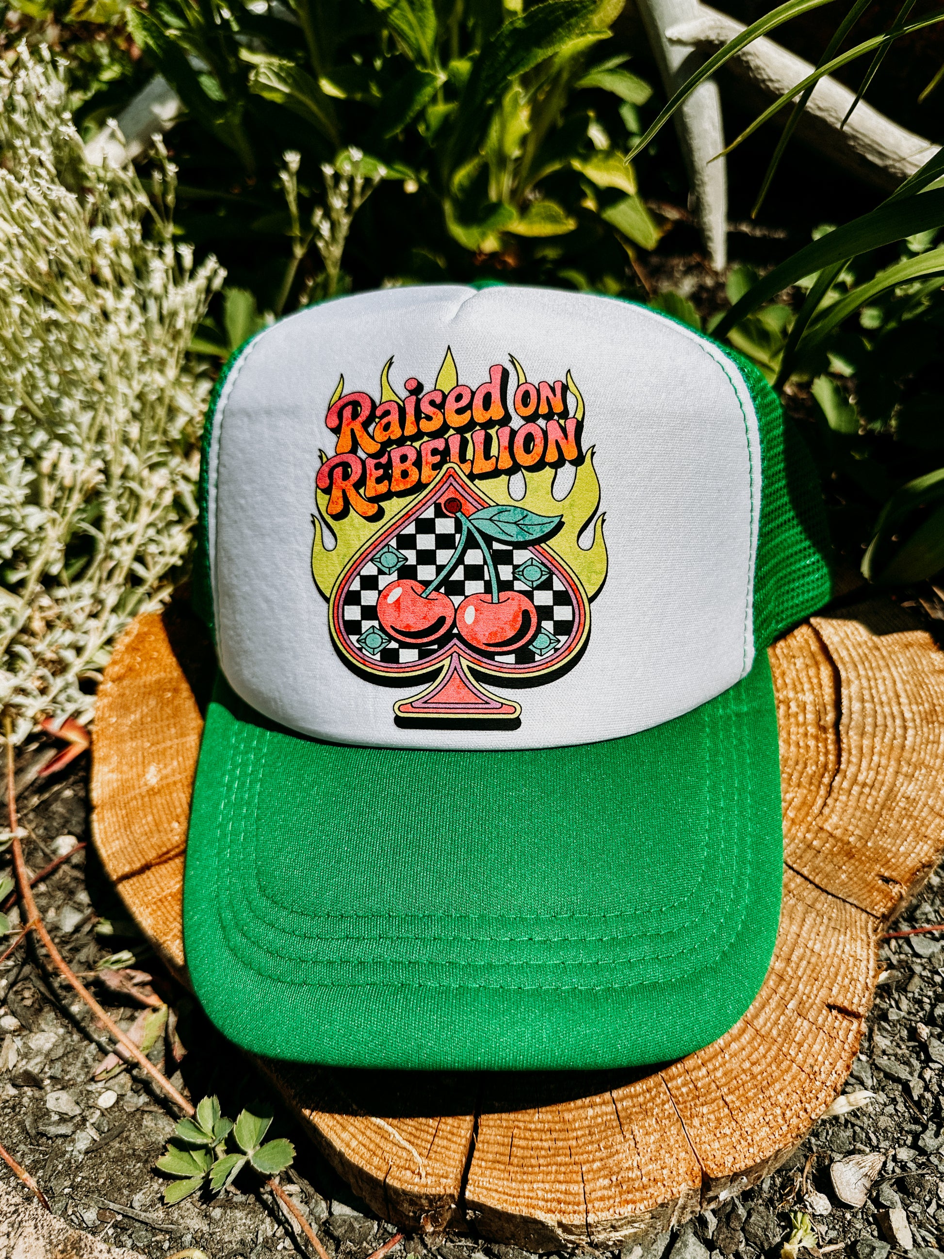 This green foam trucker features a bold, neon western graphic with a checkered spade, cherries, flames, and a whole lotta trouble.