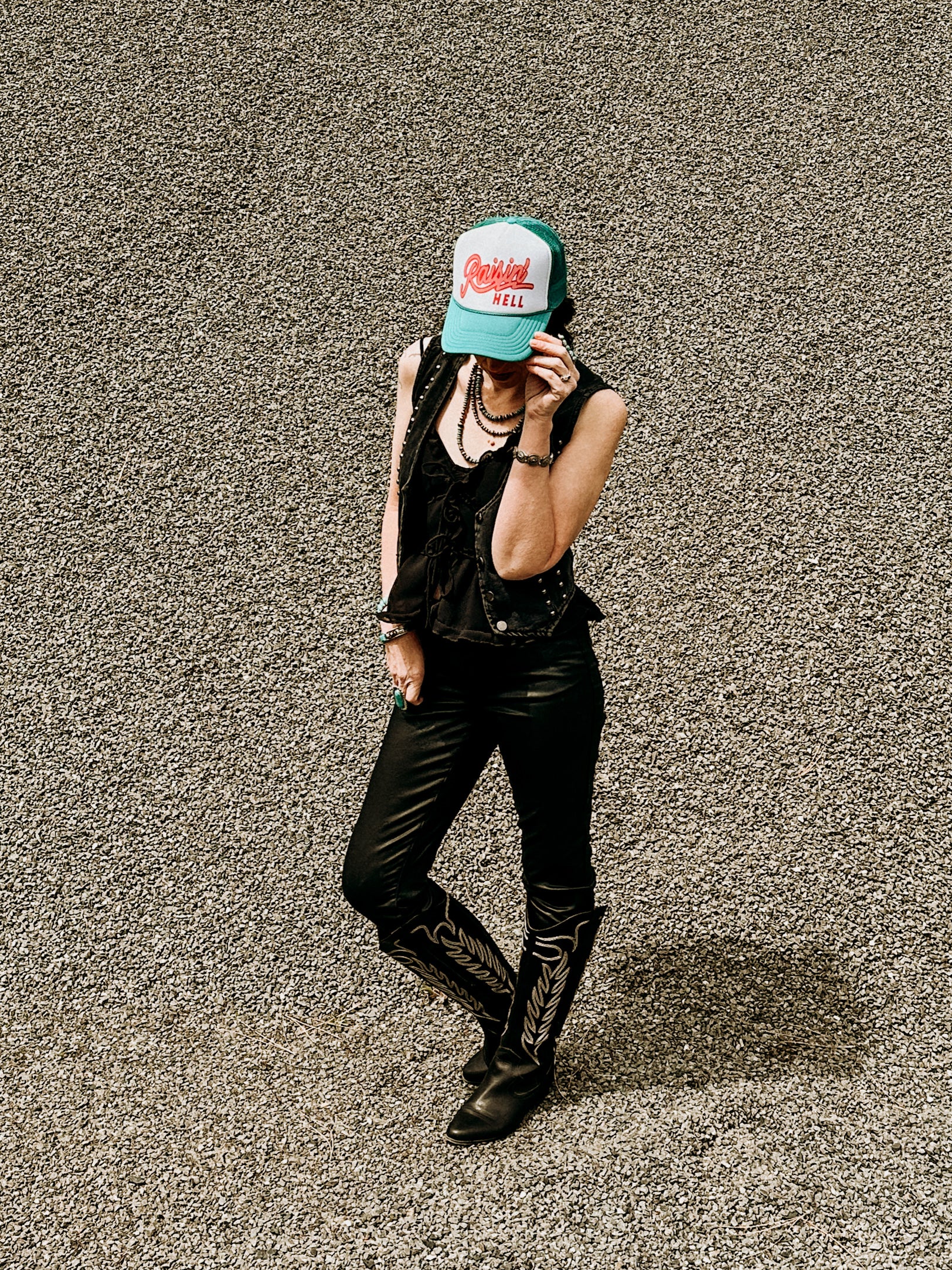 The Raisin Hell trucker is bold, unbothered, and definitely not whispering. With a bright pink graphic front and a turquoise mesh back, this one’s for the girls who live loud and leave an impression. She doesn’t RSVP—she just shows up with leather pants, a Pendleton bottle, and zero chill.