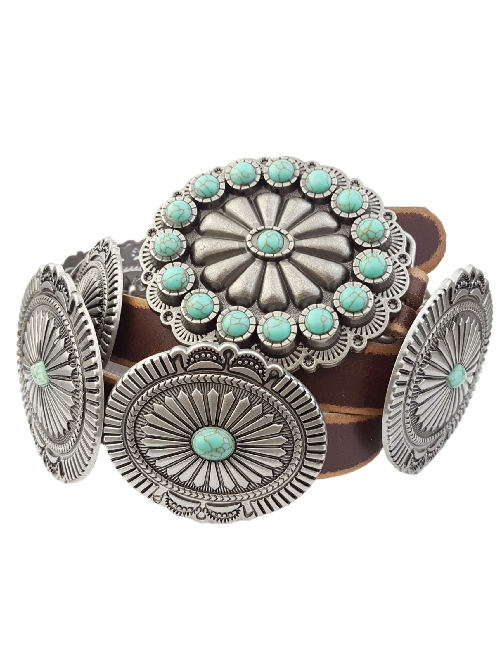 Saddle up with the Rawhide Rebel Belt. Crafted from 100% genuine vintage hand-distressed leather, this belt is adorned with 9 conchos, including a matching Western stone buckle and oval conchos that add vintage flair. The genuine leather strap ensures comfort while keeping your look stylish and bold.
