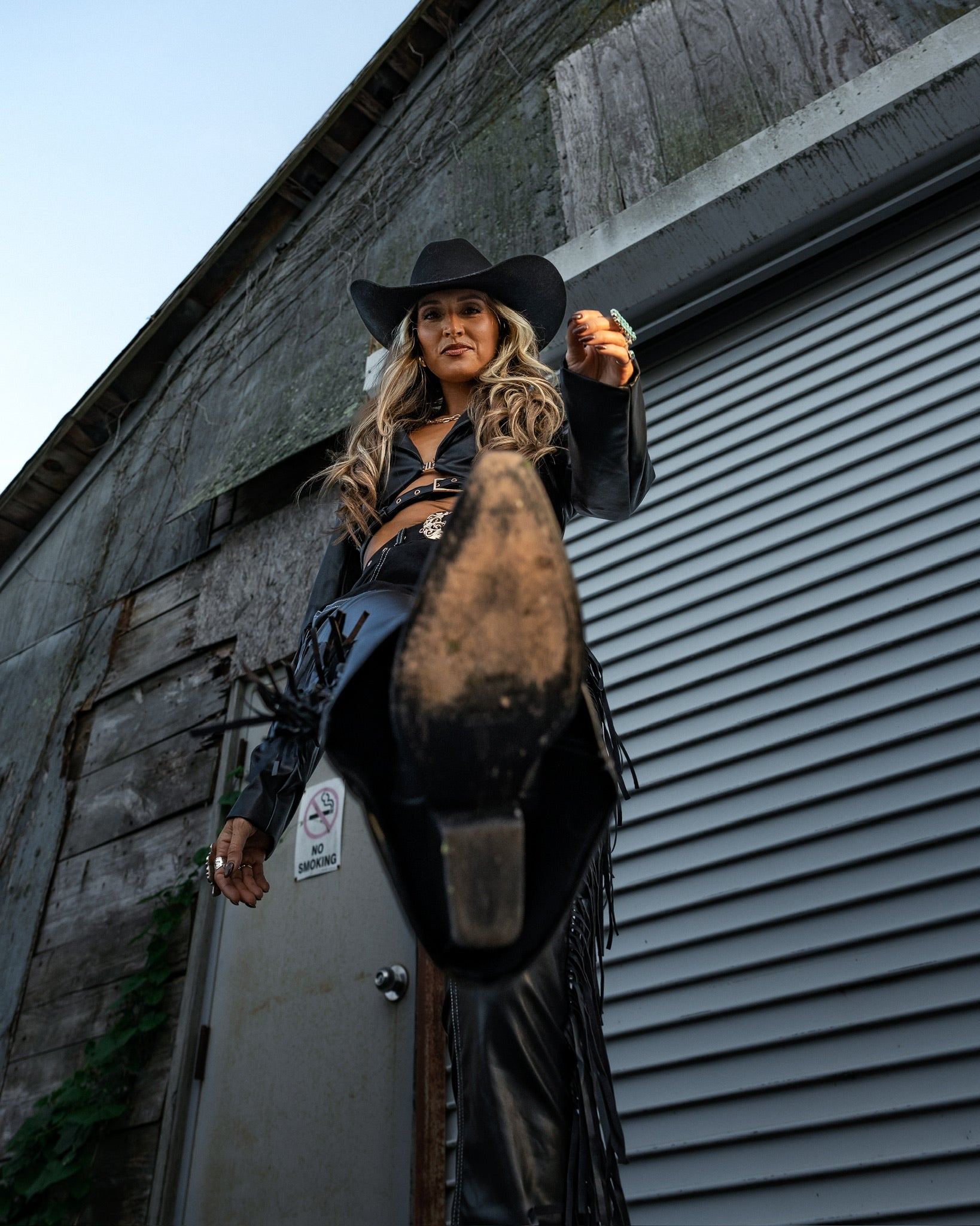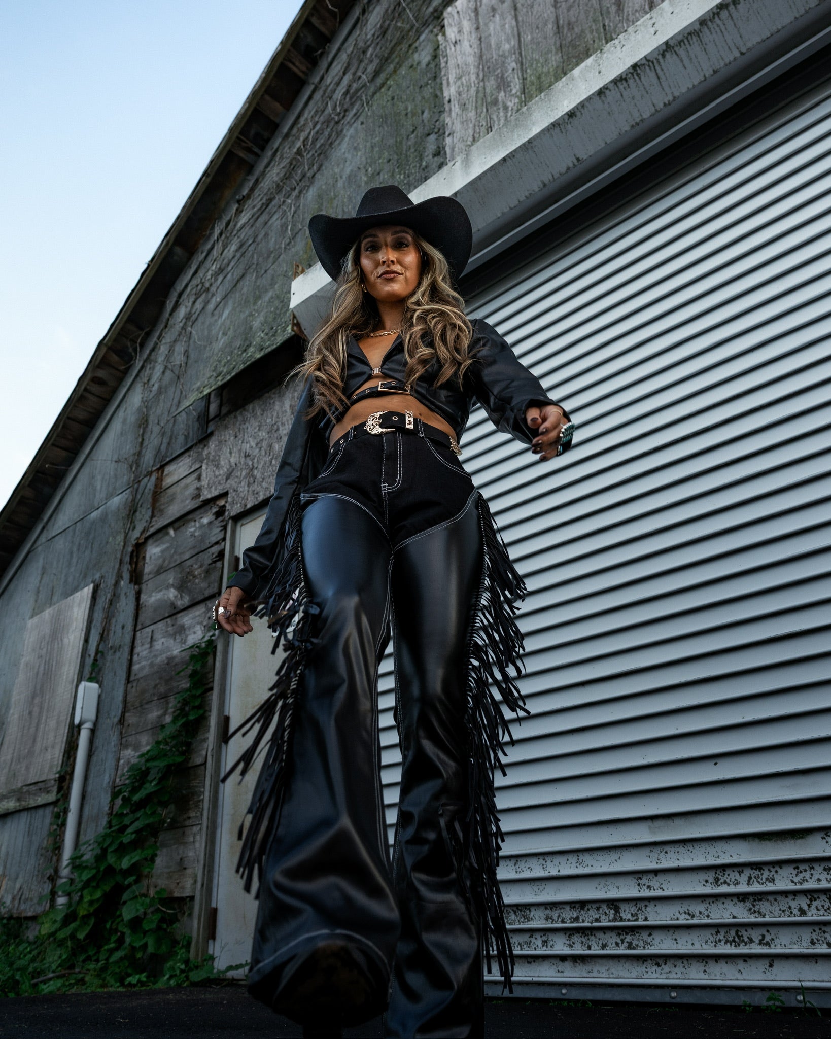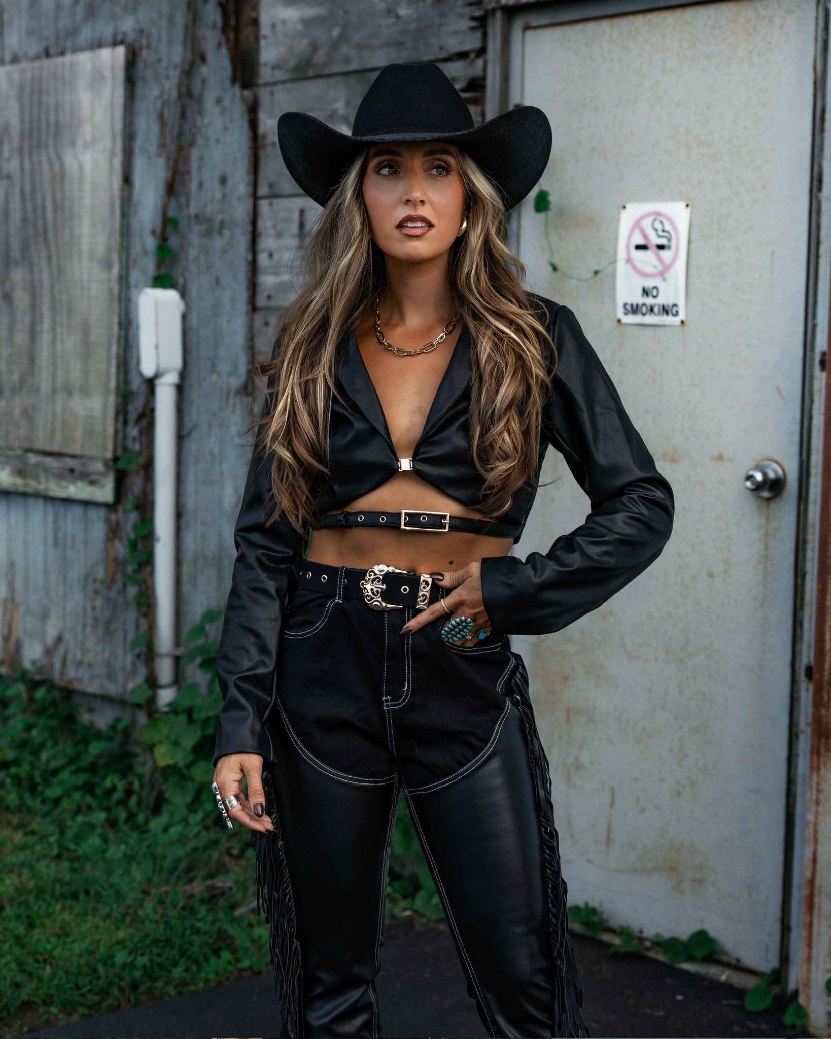 The Rebel Rider Jacket is Liz’s pick for when you want all eyes on you. Cropped and bold in sleek black faux leather, it’s detailed with a chic belted waist that adds just the right edge. Pair it with the Heartbreaker Pants for a full Wild at Heart set, or throw it over denim, skirts, and dresses to instantly elevate your look. Whether you’re headed to the arena or a night out, this jacket is a ride-or-die closet staple.