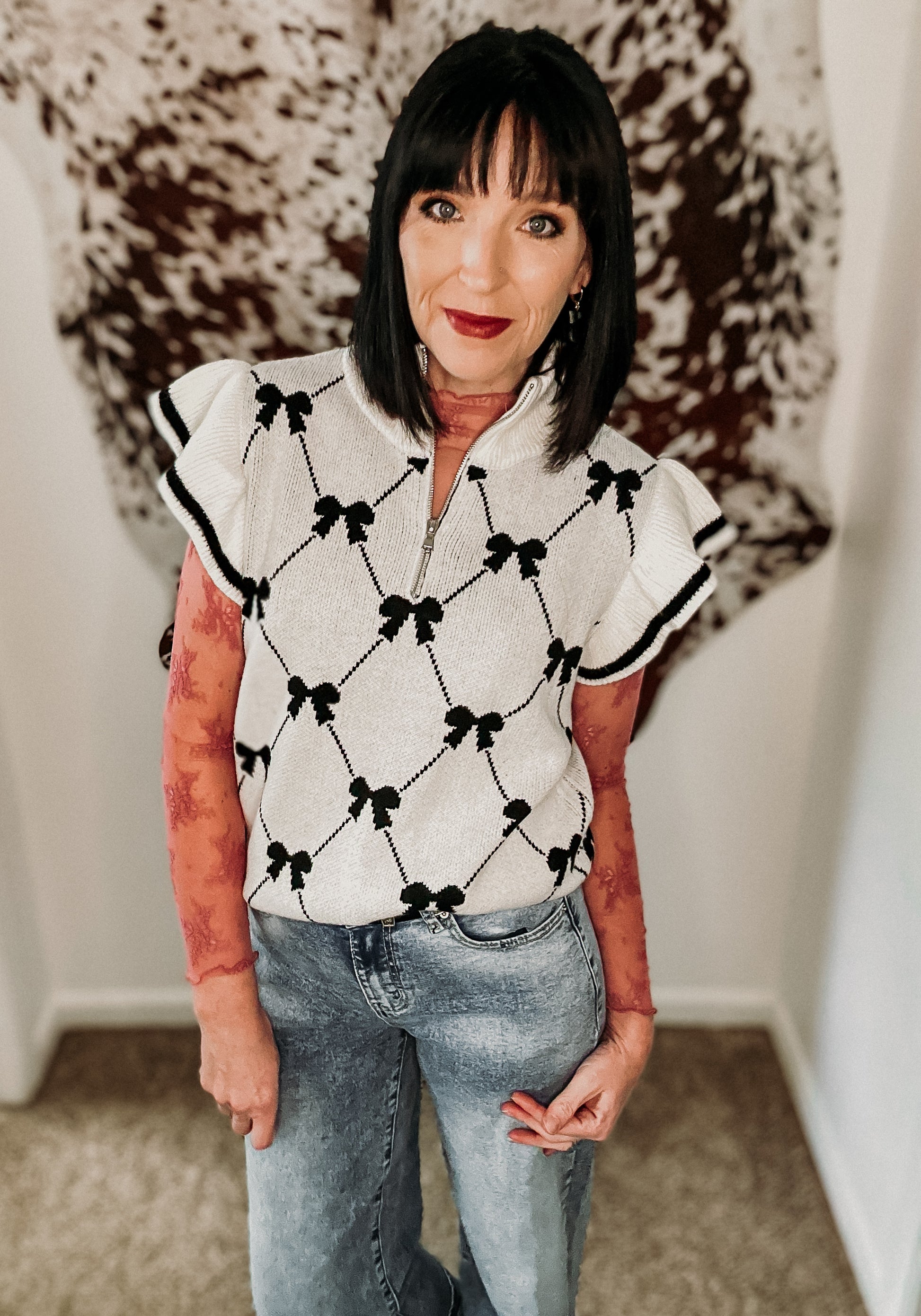 Cue the bows and boot-stompin’ style—The Rodeo Prep Club Sweater brings together polished charm and western sass in one seriously stylish piece. With a flirty bow print, fluttery sleeves, and a quarter-zip collar, this top is giving coquette cowgirl meets varsity rodeo queen in the best way.