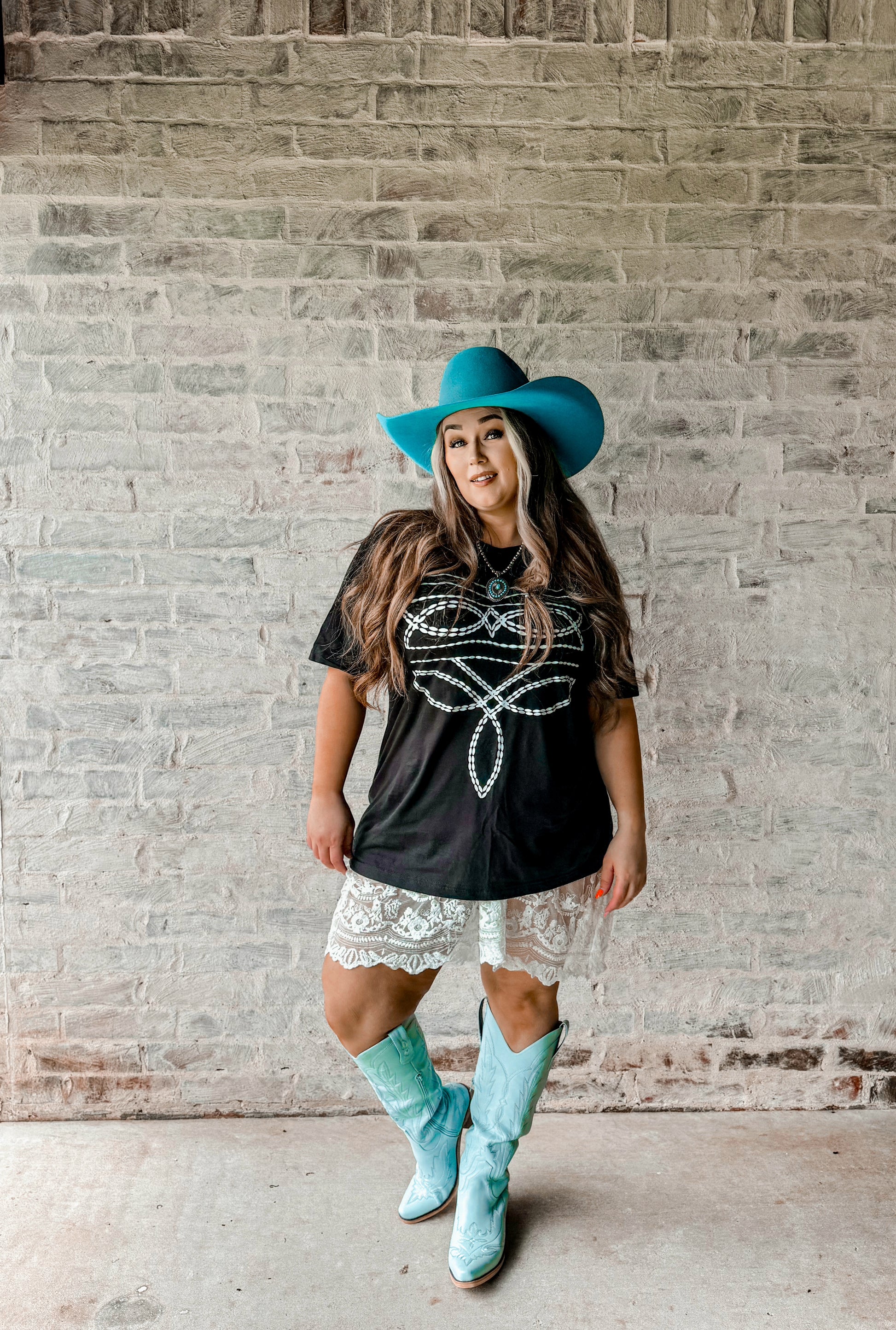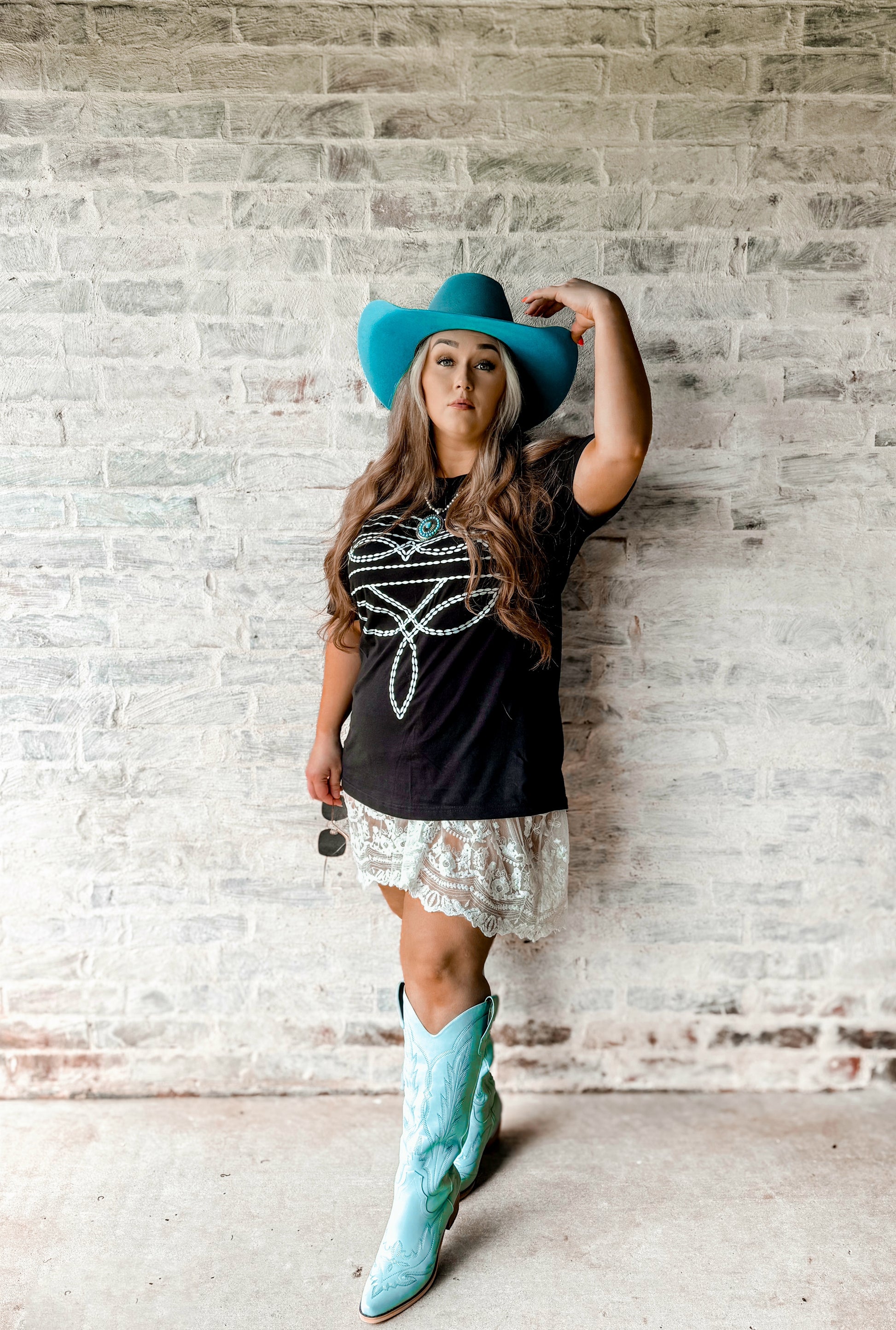 Ready to rebel in style? The Rodeo Rebel T-Shirt Dress is all about that bold cowgirl energy. Made from super soft black t-shirt fabric with a large white boot stitch graphic, it’s designed to make sure you stand out and own the room. Wear it oversized for that effortlessly cool look, and pair it with your Lunar Lace Slip Dress for the ultimate rebel vibe. Whether you're out on the town or just need a chic, laid-back look, this dress is here to make your fashion statement loud and clear.