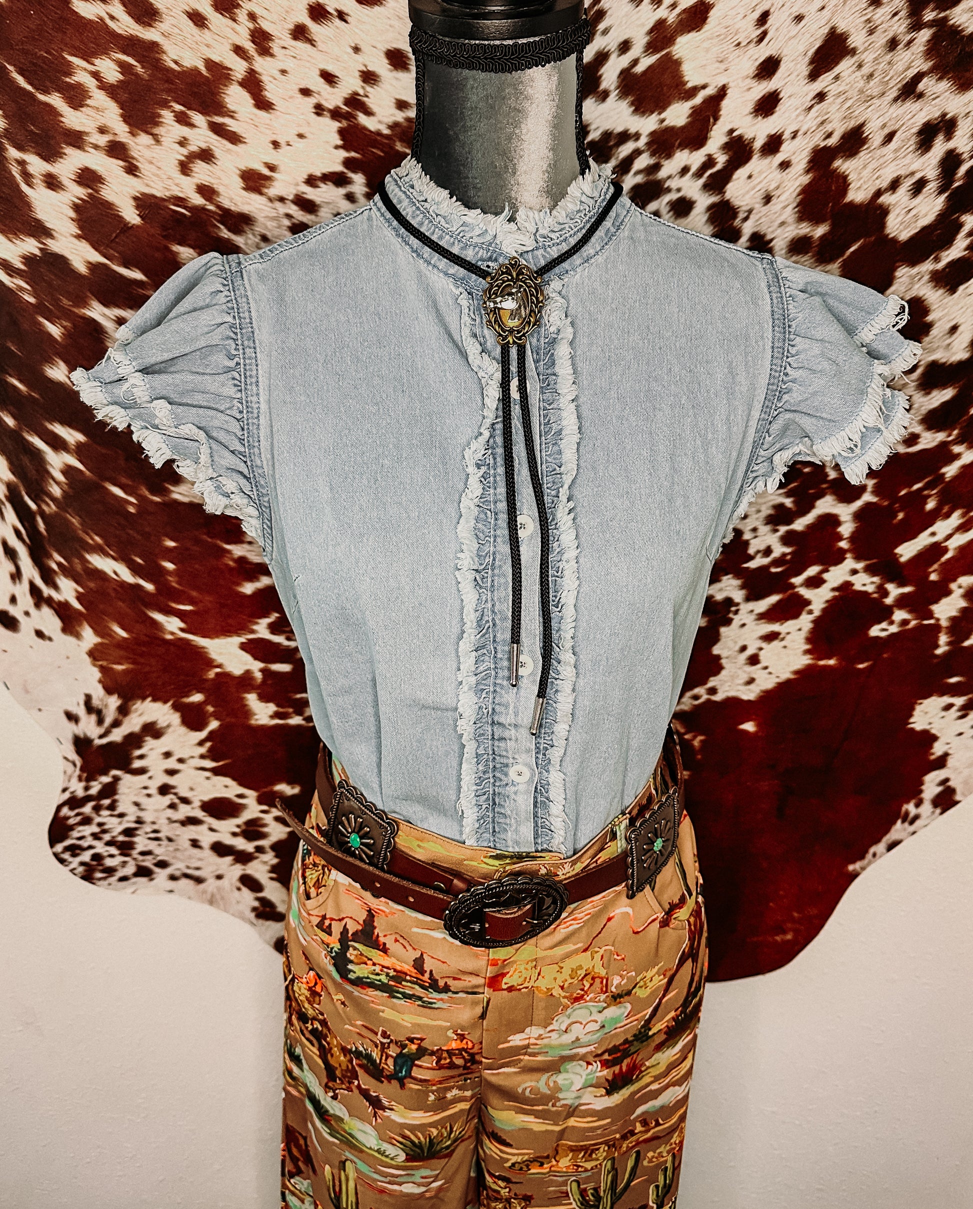 Style tip: We paired it with a horse bolo tie, western belt, and high-waisted trousers—but she plays well with skirts, cutoff shorts, and rancher hats too.