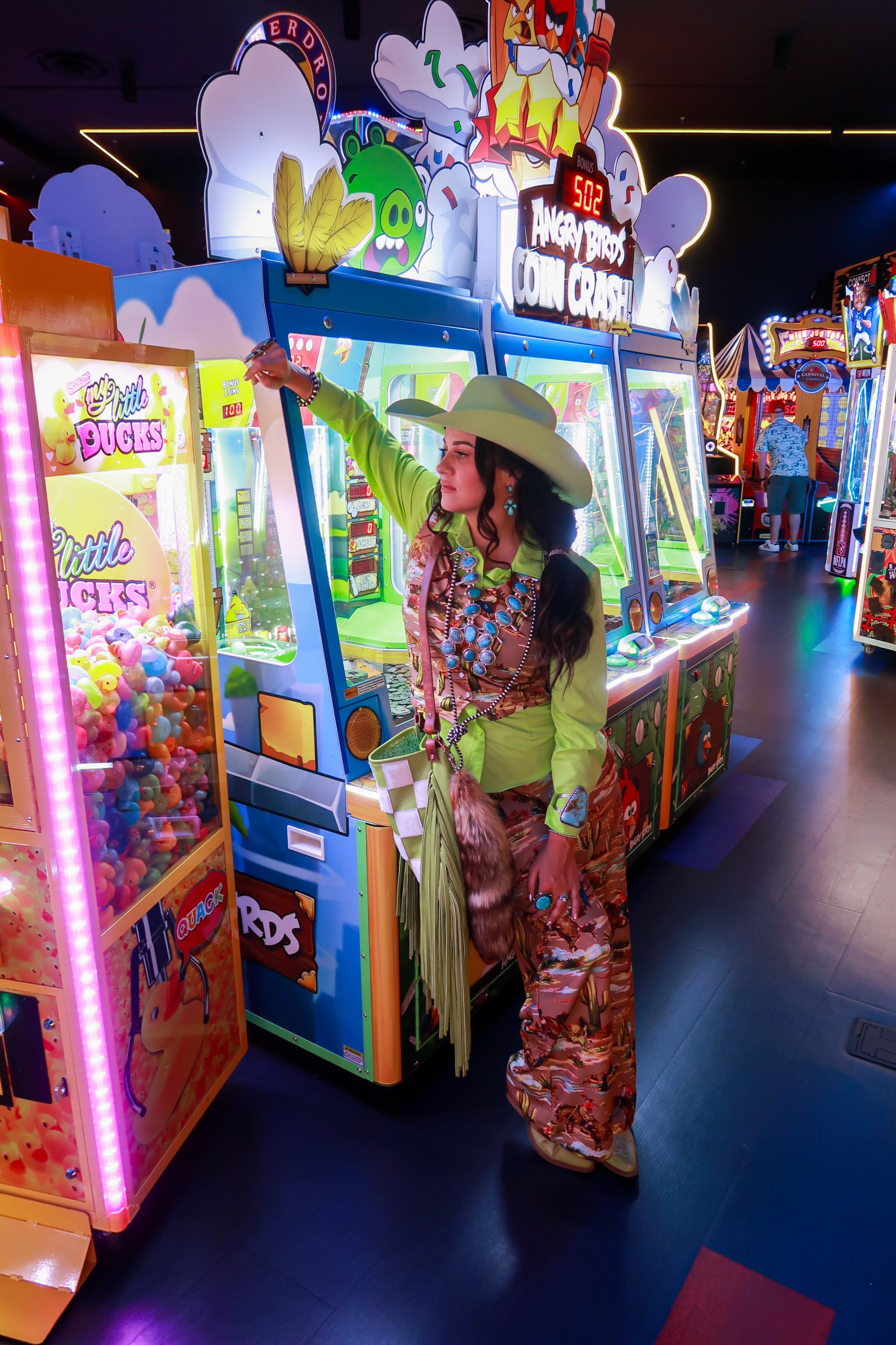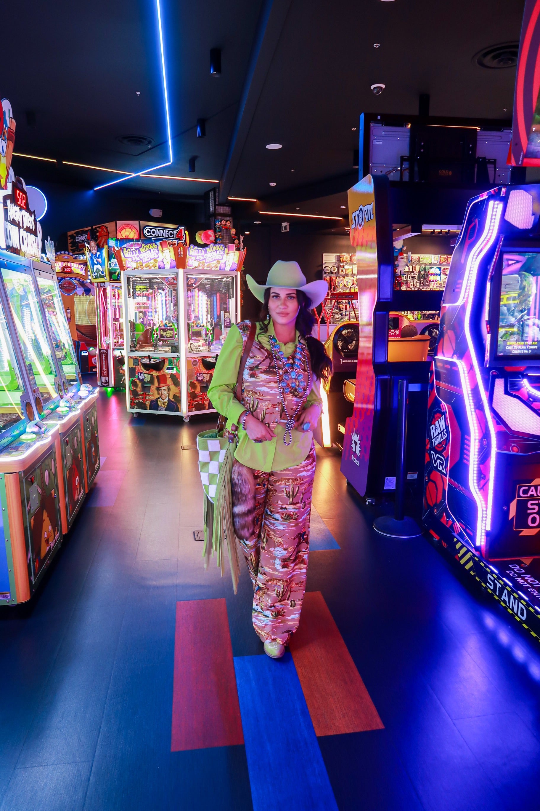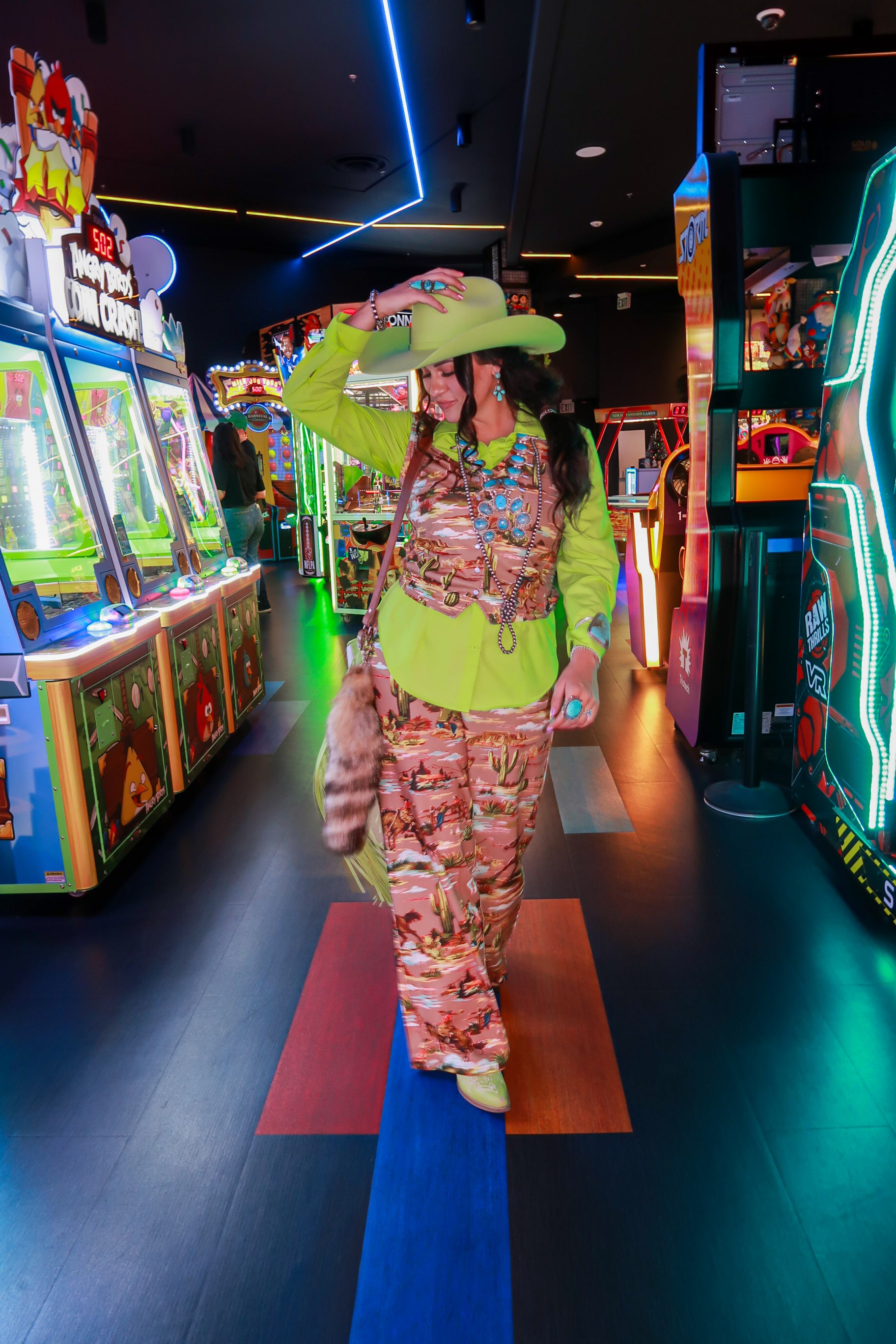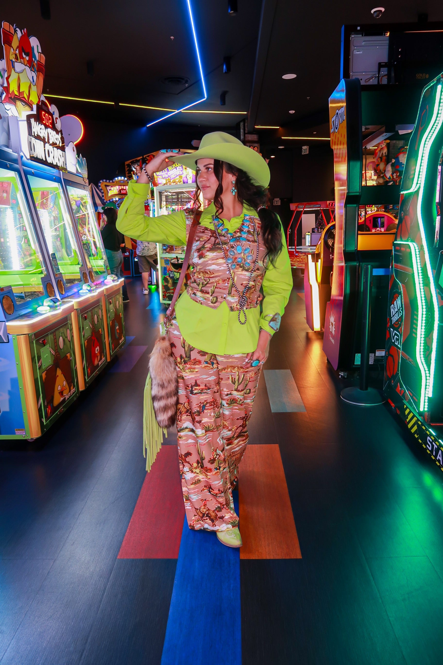 Style tip: Wear solo with the matching trousers for the full Neon Wrangler look, or layer over a tee and belt it for structured rodeo glam.
