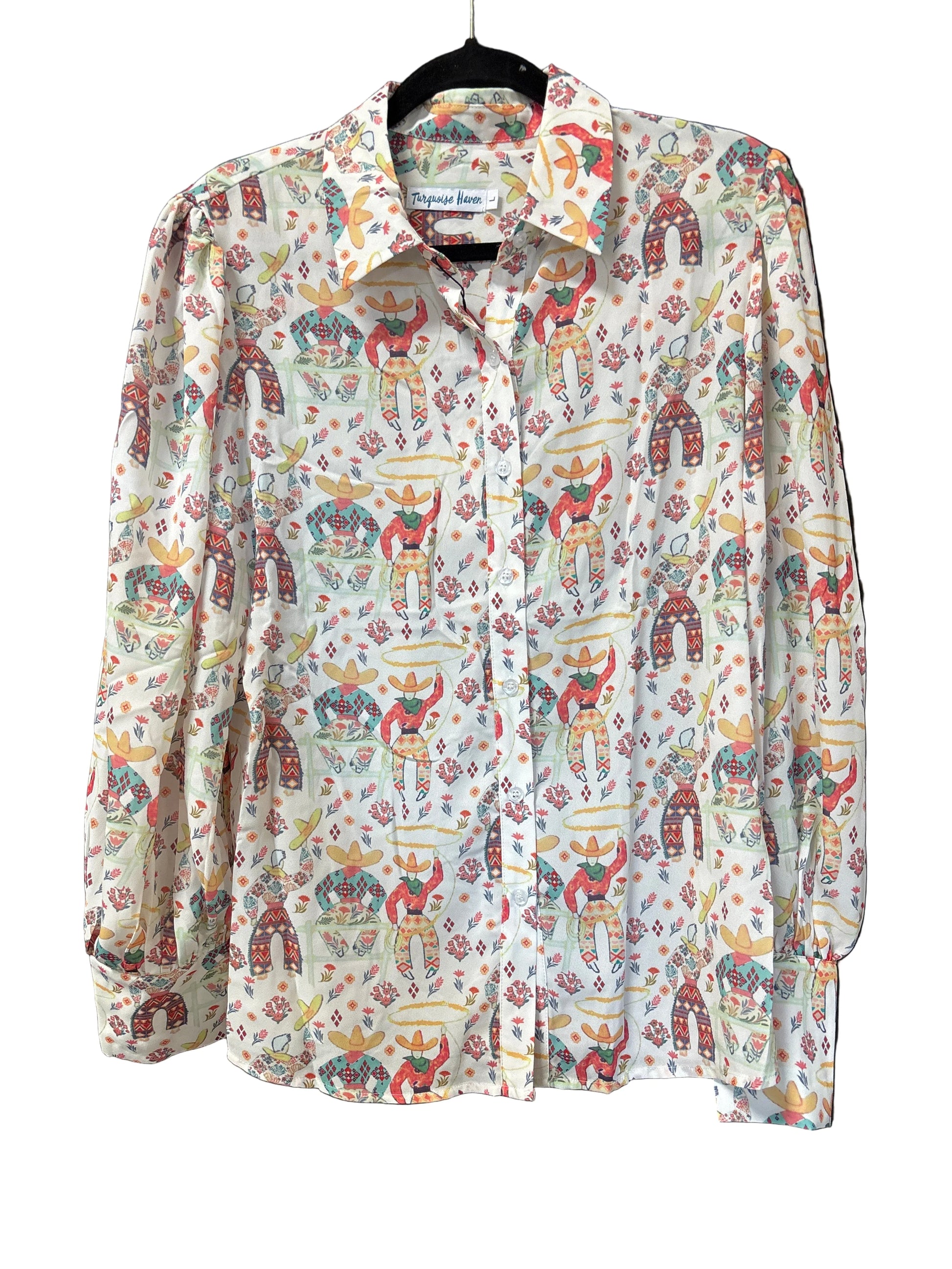 Bring a little rodeo romance into your closet with the Rodeo Tales Blouse. This lightweight button-up features a colorful all-over cowboy print — think lassos, boots, hats, and rodeo scenes in vibrant turquoise, gold, and earthy tones against a creamy ivory backdrop. The soft woven fabric drapes easy for everyday wear, while the classic collar, button cuffs, and straight hem keep it polished enough for work, play, or the rodeo arena.