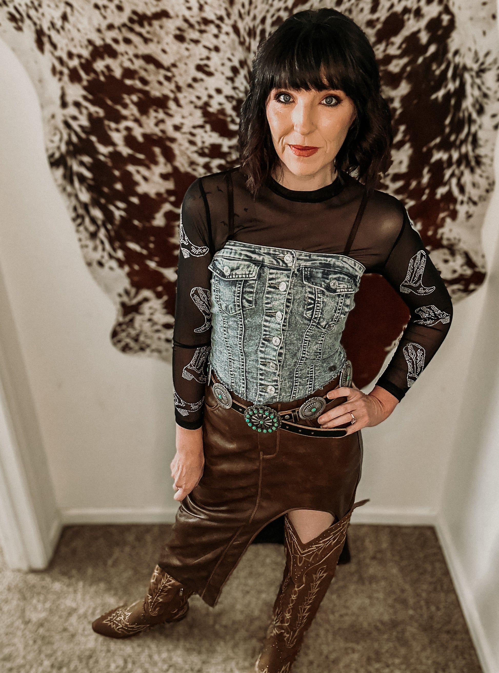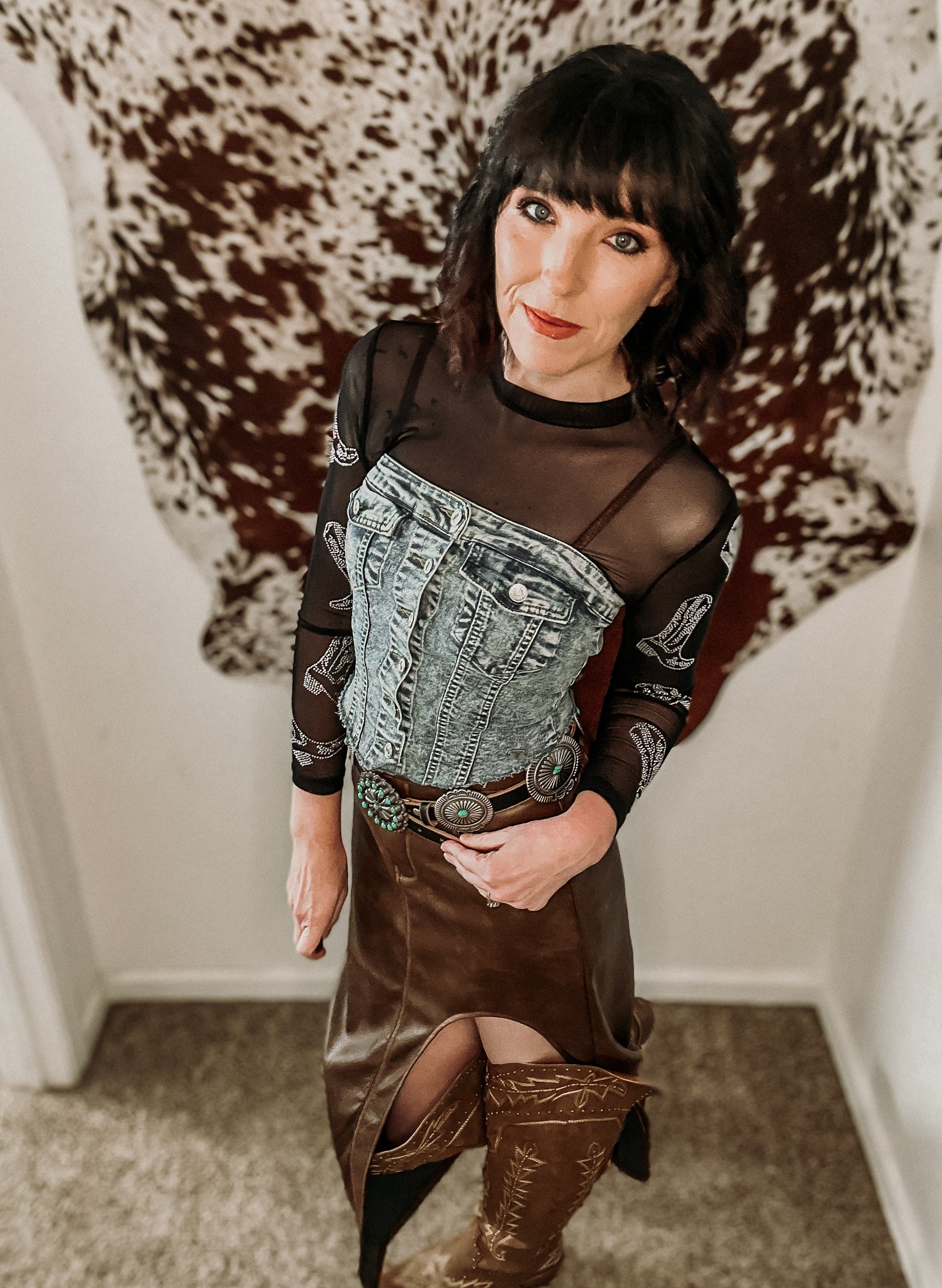 Style tip: Pair it with a graphic tee and boots for downtown cowgirl, or tuck in a mesh top for rodeo glam realness.