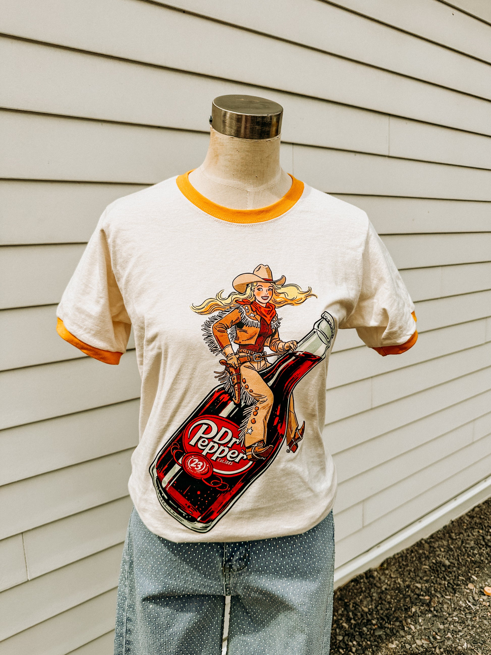 This cream and yellow ringer tee features a bold graphic of a wild cowgirl riding a soda bottle like it’s her trusty bronc. Retro, rowdy, and way too cute to ignore—especially when you pair it with the matching Soda Pop Rodeo hat.