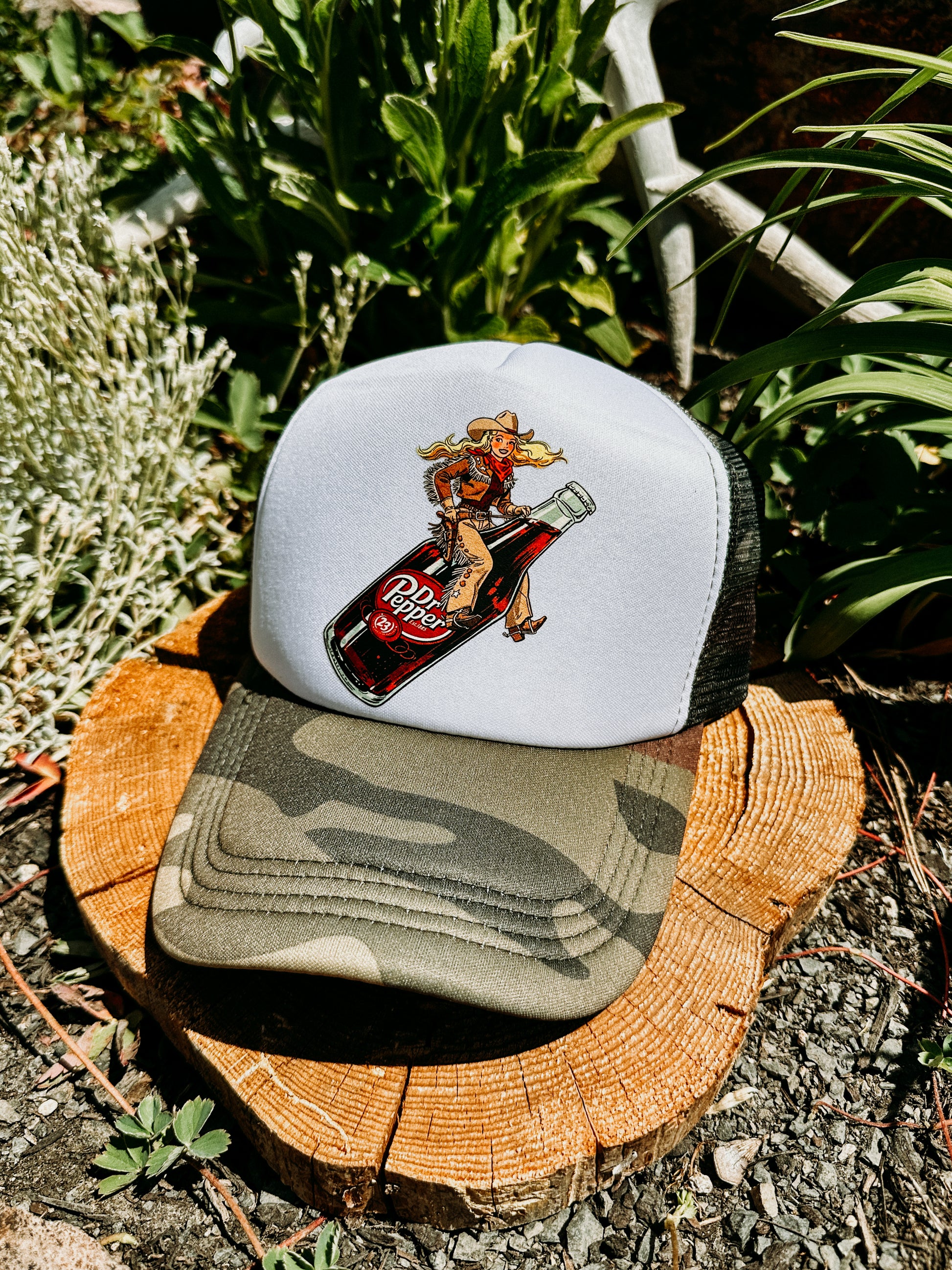 This camo foam trucker brings the chaos with a bold graphic of a wild cowgirl riding a soda bottle like it’s a bucking bronc. She’s sweet, spunky, and a little unhinged—in the best way.