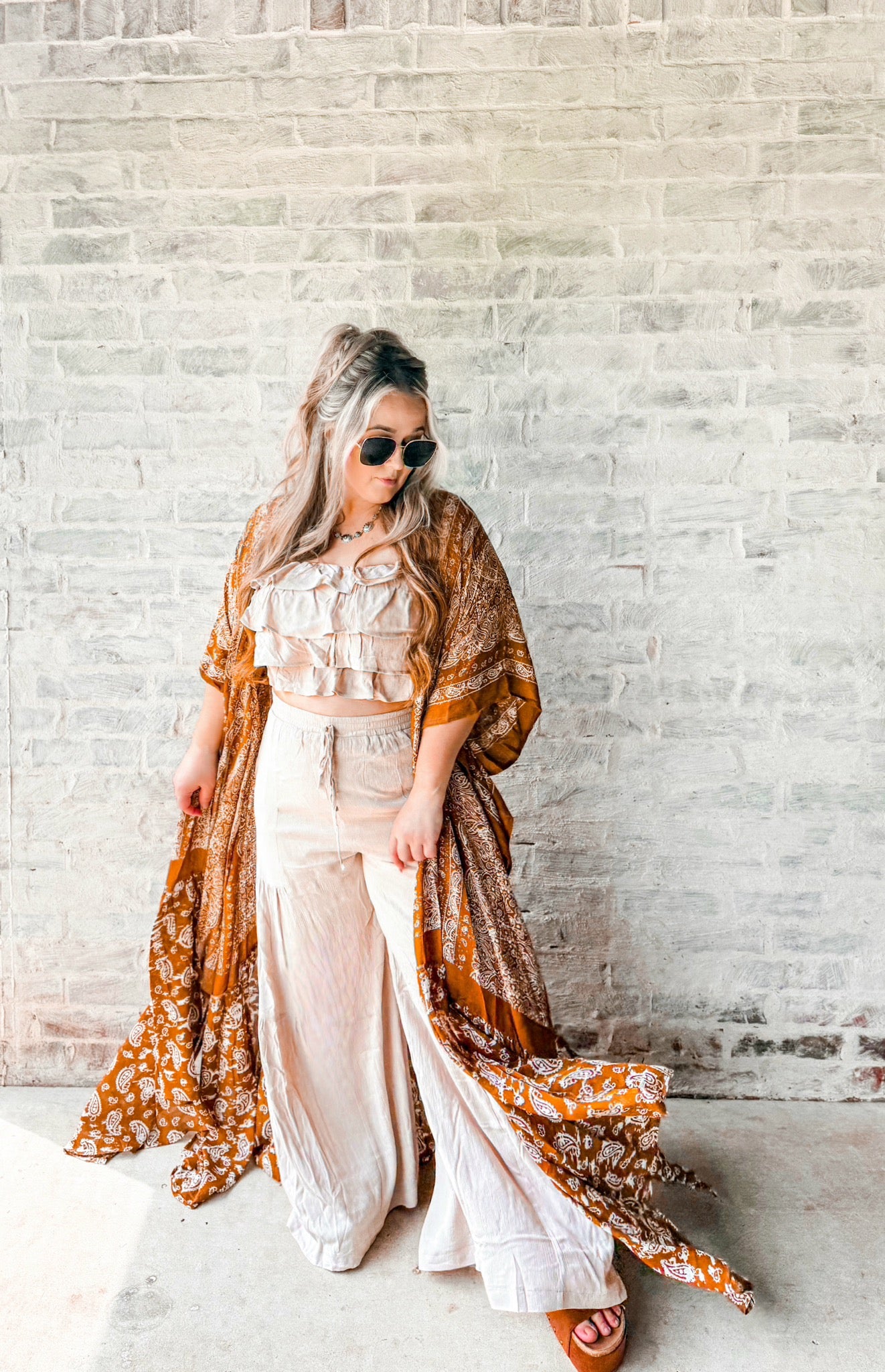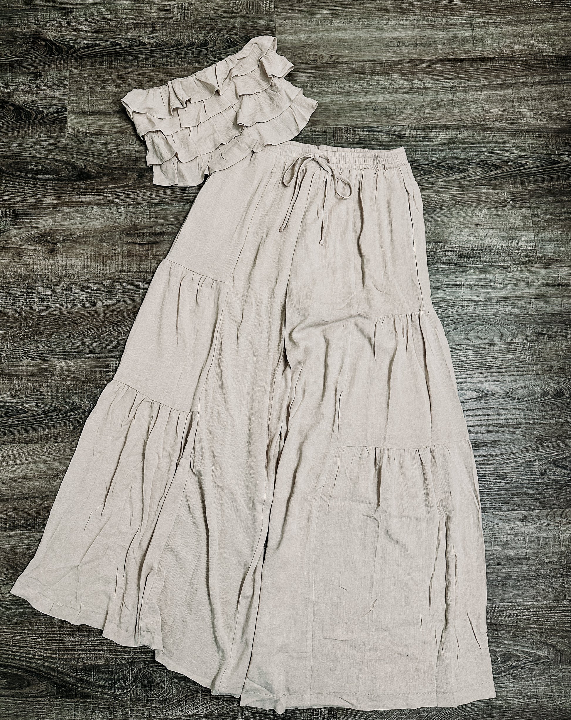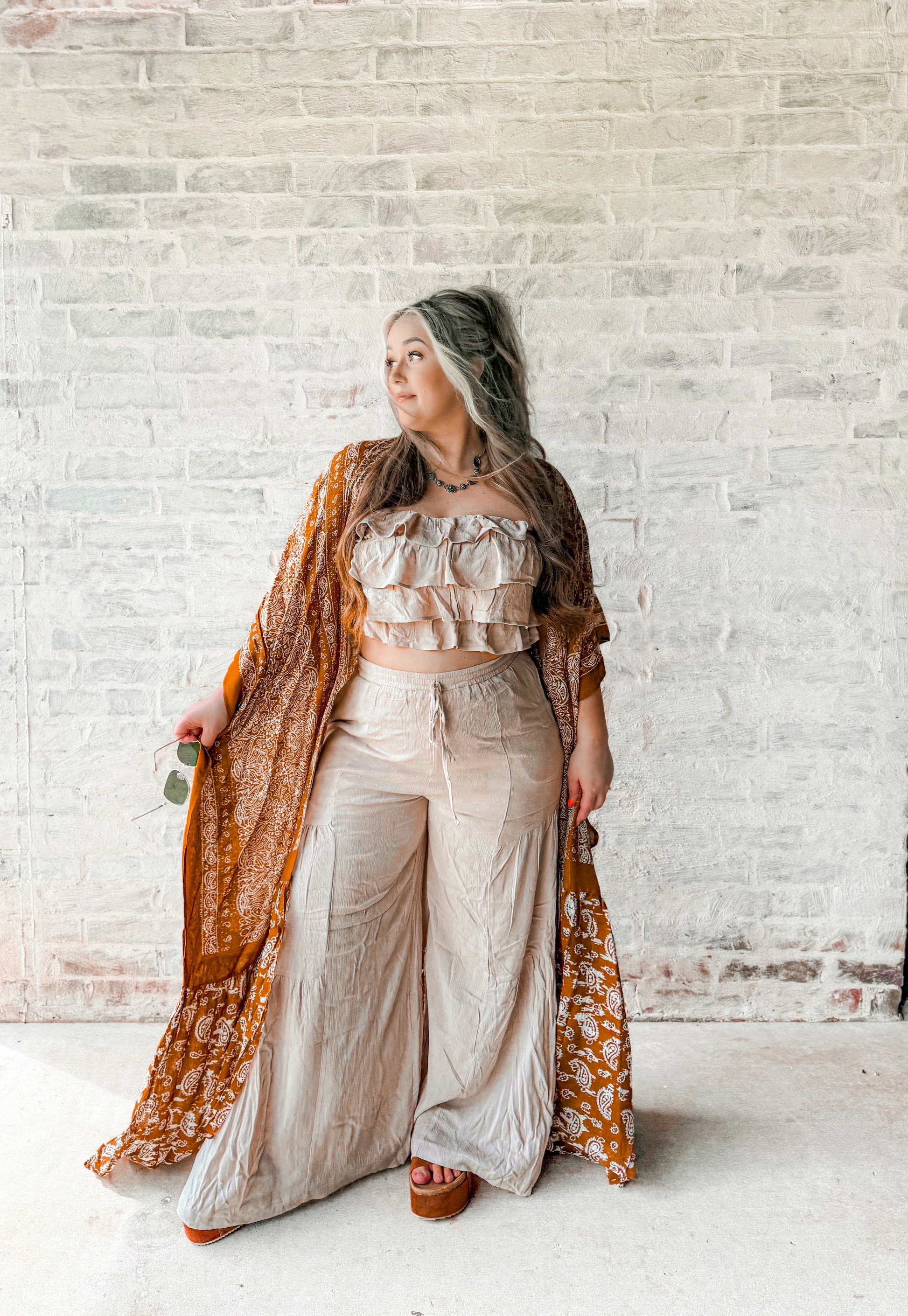 Golden hour has nothing on you in The Golden Dusk Set! This striking two-piece brings bold elegance to the table with a ruffled strapless top and flowy pants that move with you like a desert breeze. Crafted from soft rayon, this set is the perfect balance of comfort and rebellious glamour. Whether you're making a statement at a rodeo or just living your best cowgirl life, this set will make sure you look chic, bold, and effortlessly stunning.