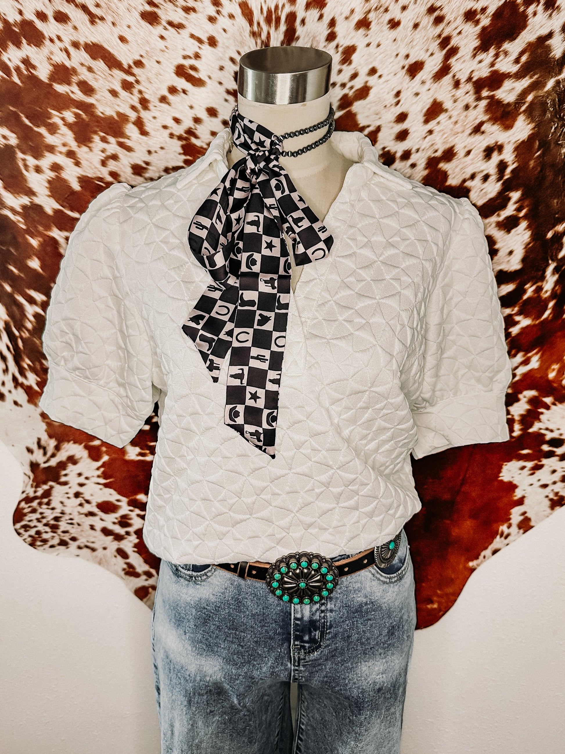 Level up your spring lineup with The High Noon Blouse—a textured puff sleeve top that blends timeless charm with a modern western twist. From the collared V-neckline to the airy, relaxed fit, she’s got sophistication written all over her.