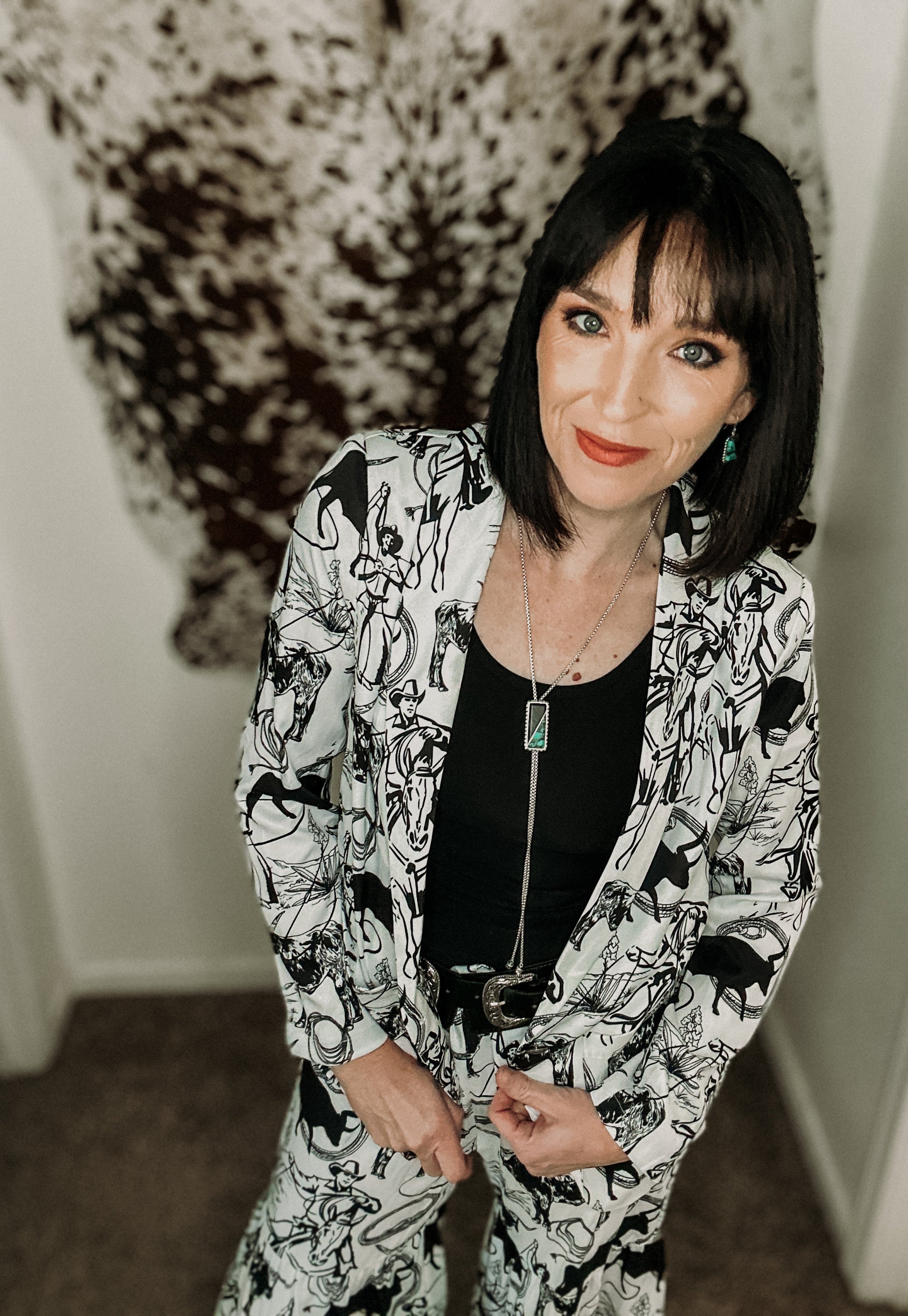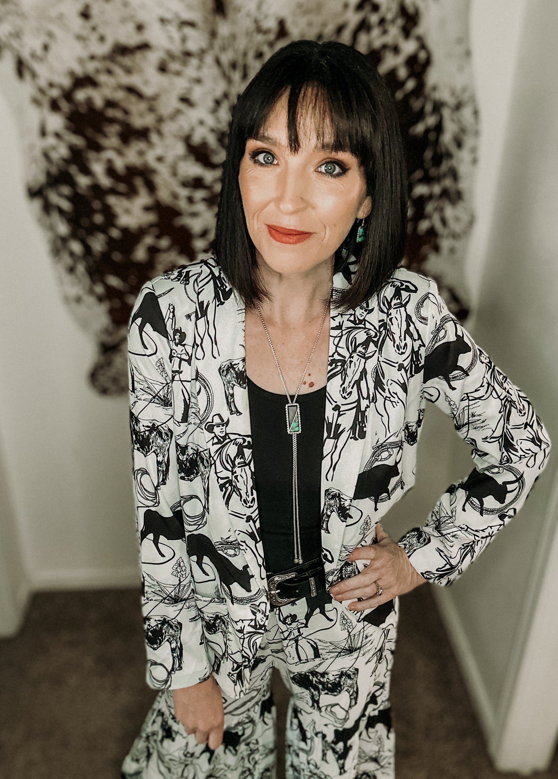 Command the room in The Lasso Luxe Blazer—a lightweight, longhorn-print stunner made for the bold and the boujee. With its soft poly feel, oversized fit, and Western-inspired edge, this piece is perfect for turning the street (or the rodeo grounds) into your personal runway.