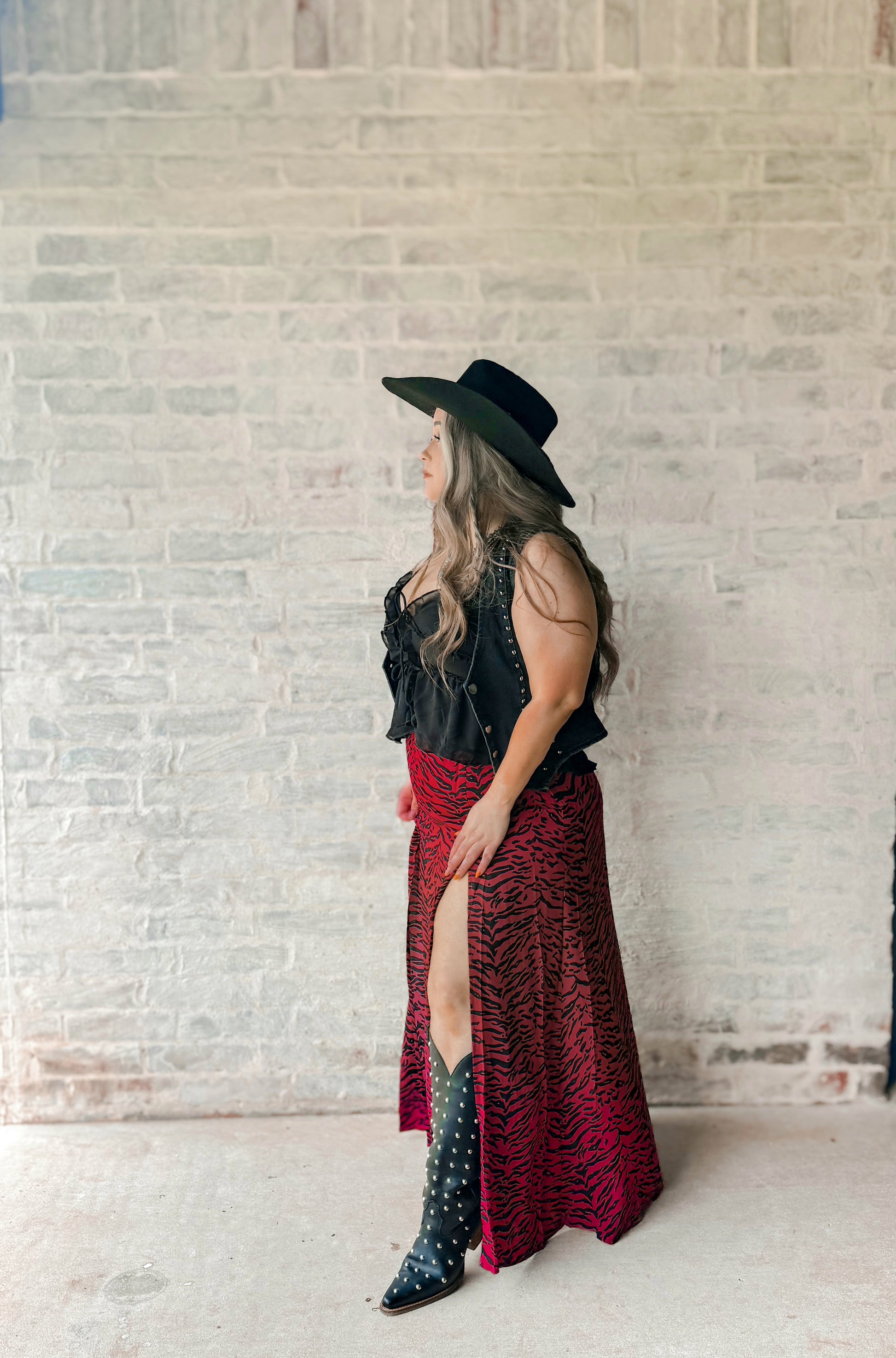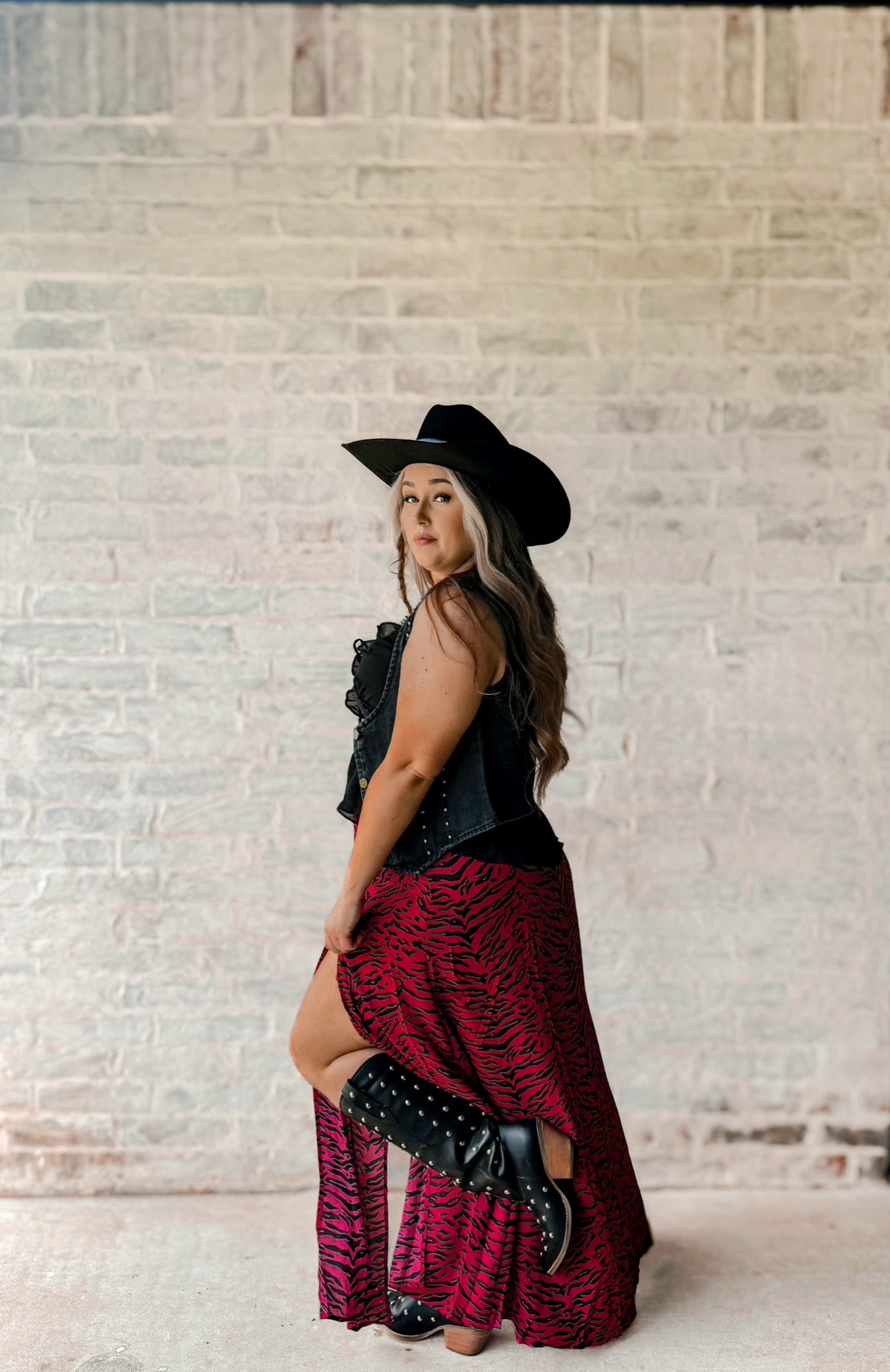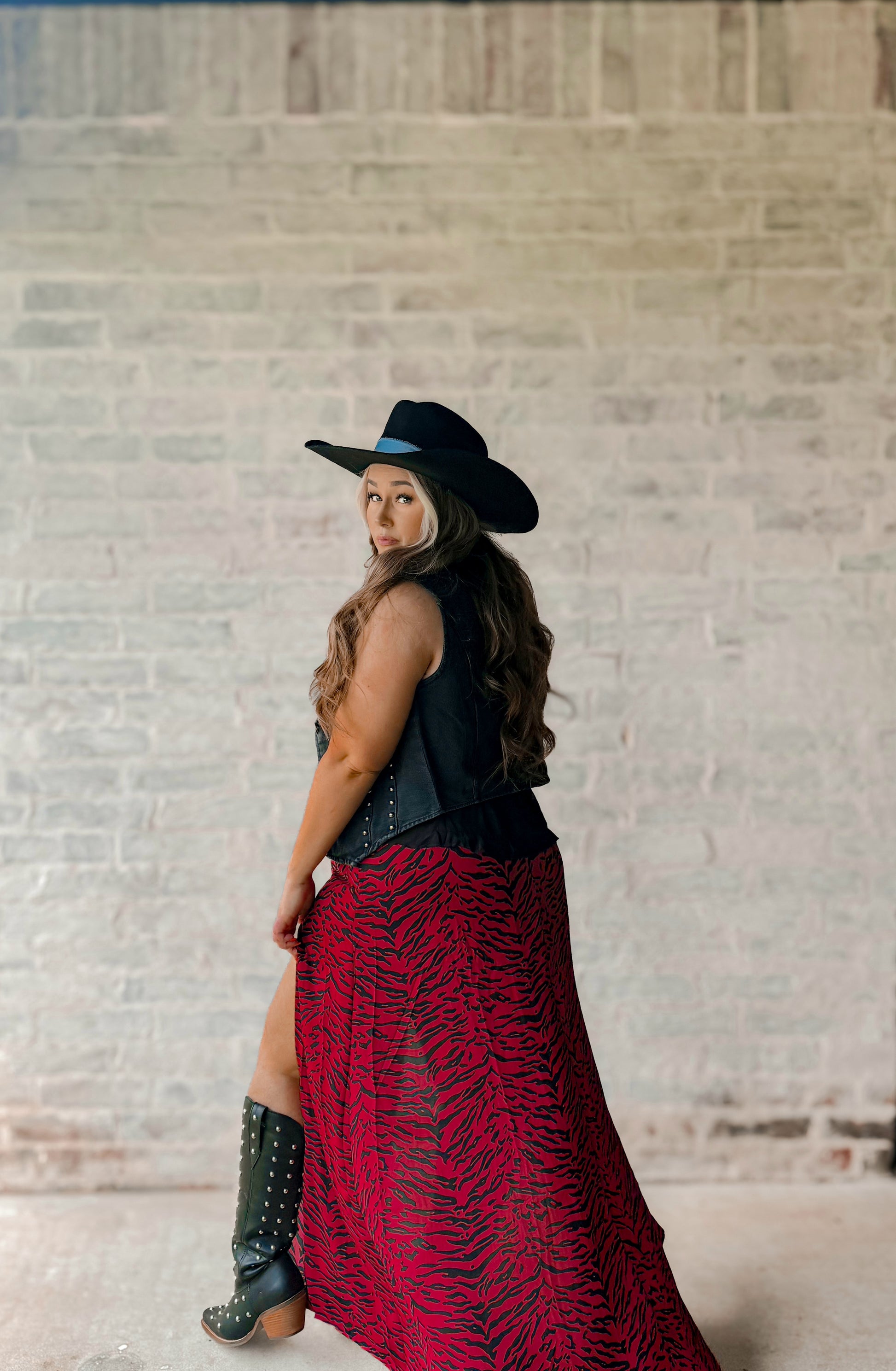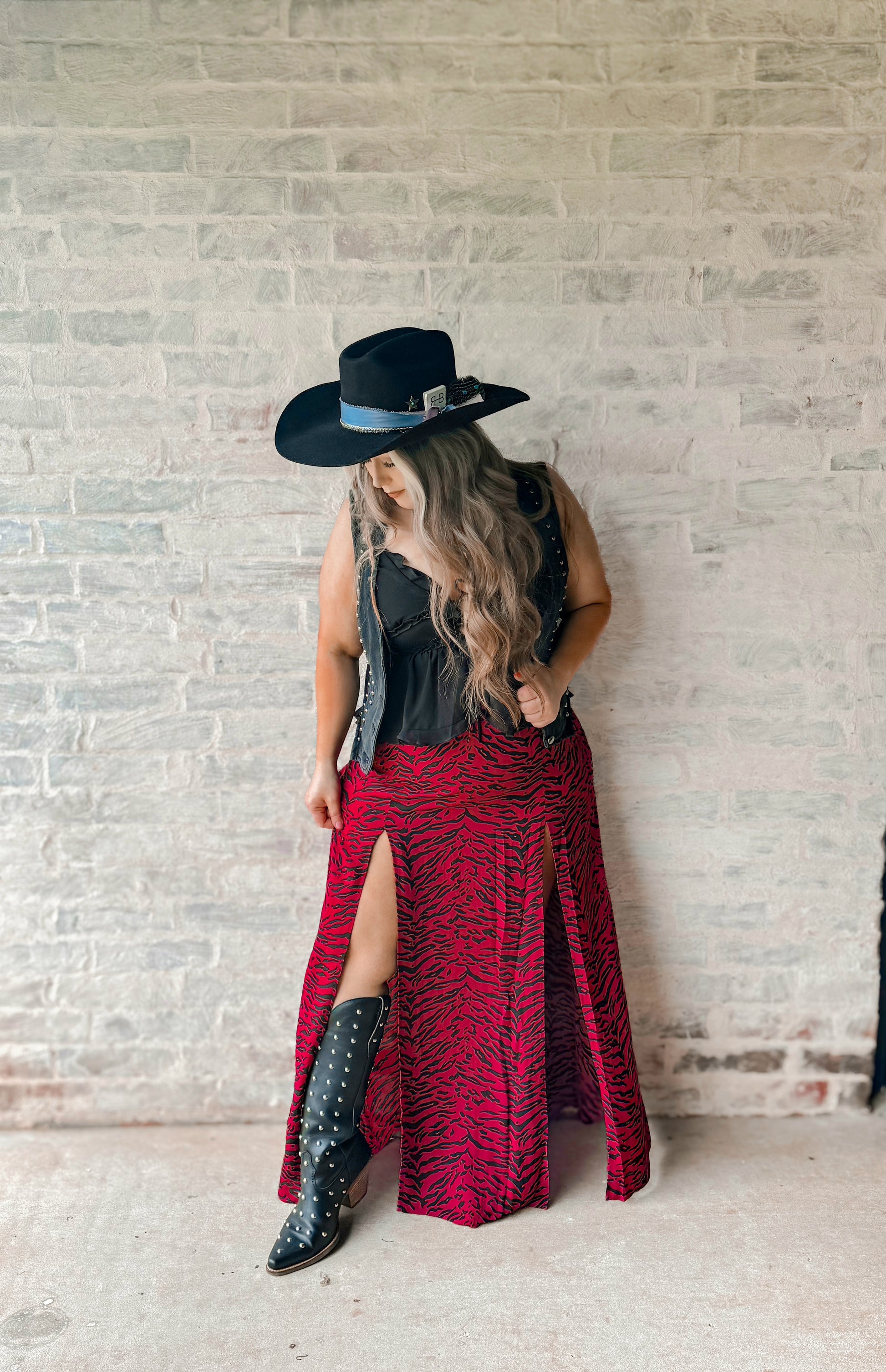 Channel your wild side with The Rogue Wrangler. This maxi skirt features an elastic waistband and front slits, making it the perfect piece for any cowgirl ready to break the rules. Lined for comfort, this skirt pairs well with your favorite boots or heels.