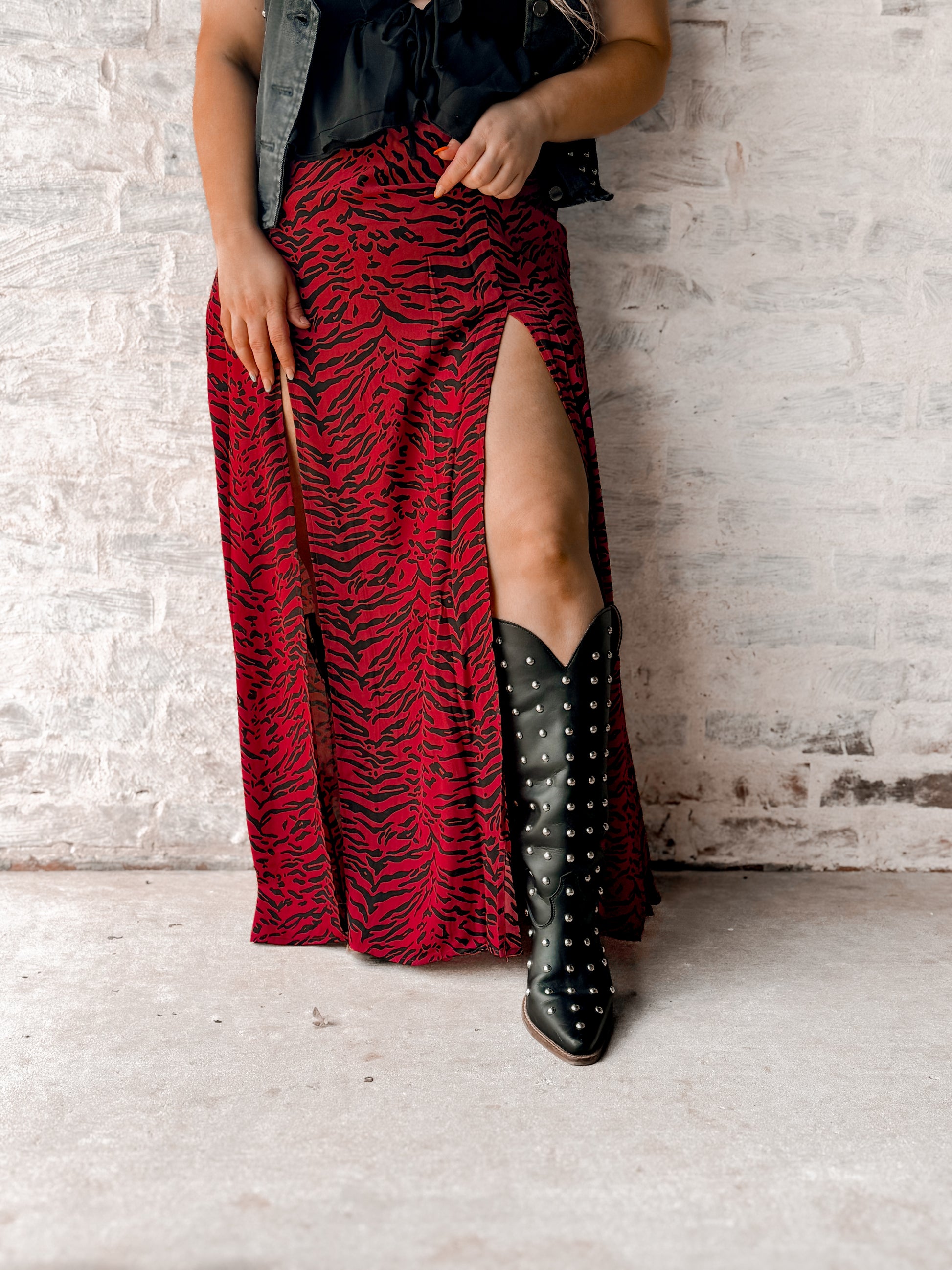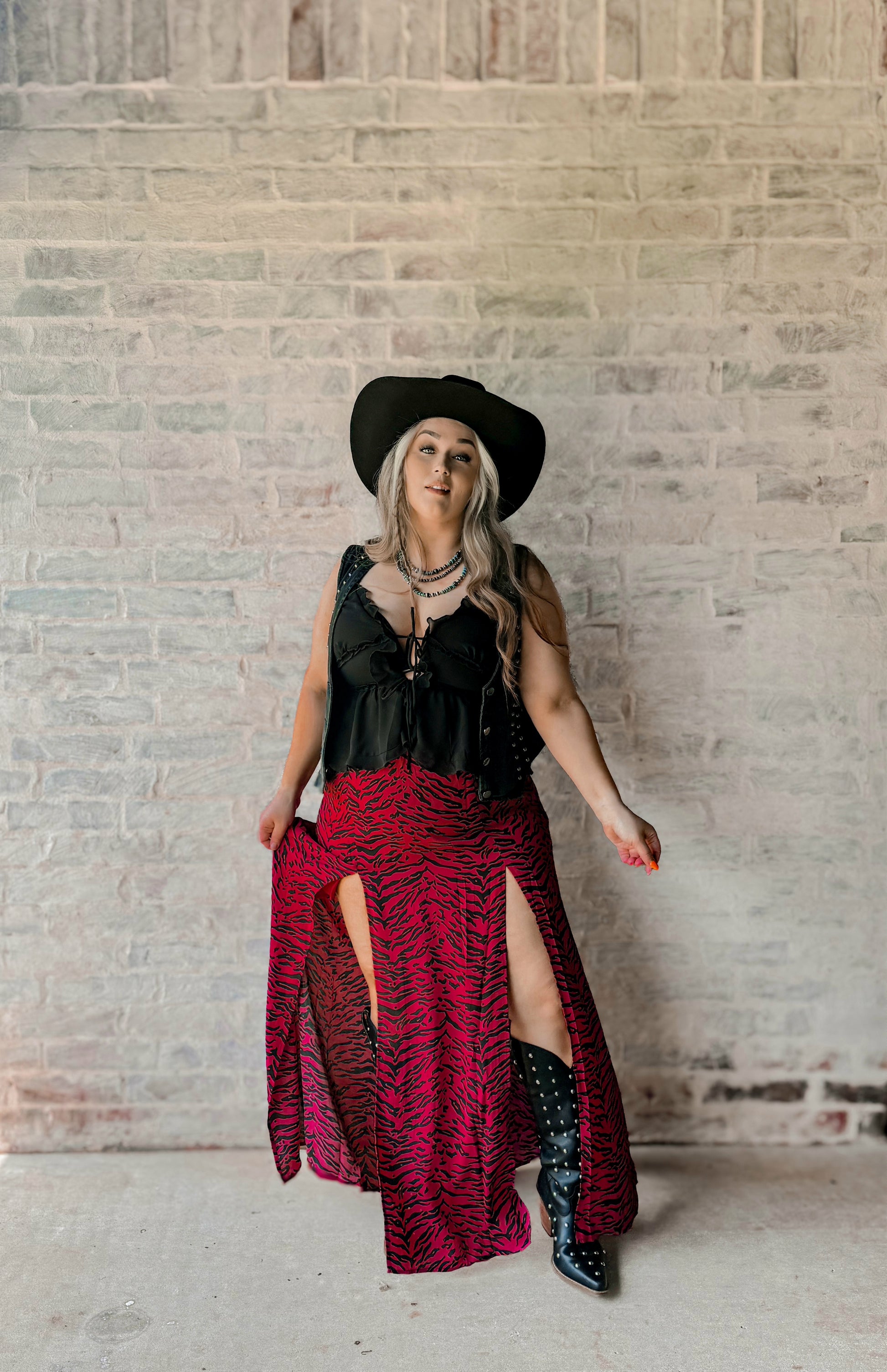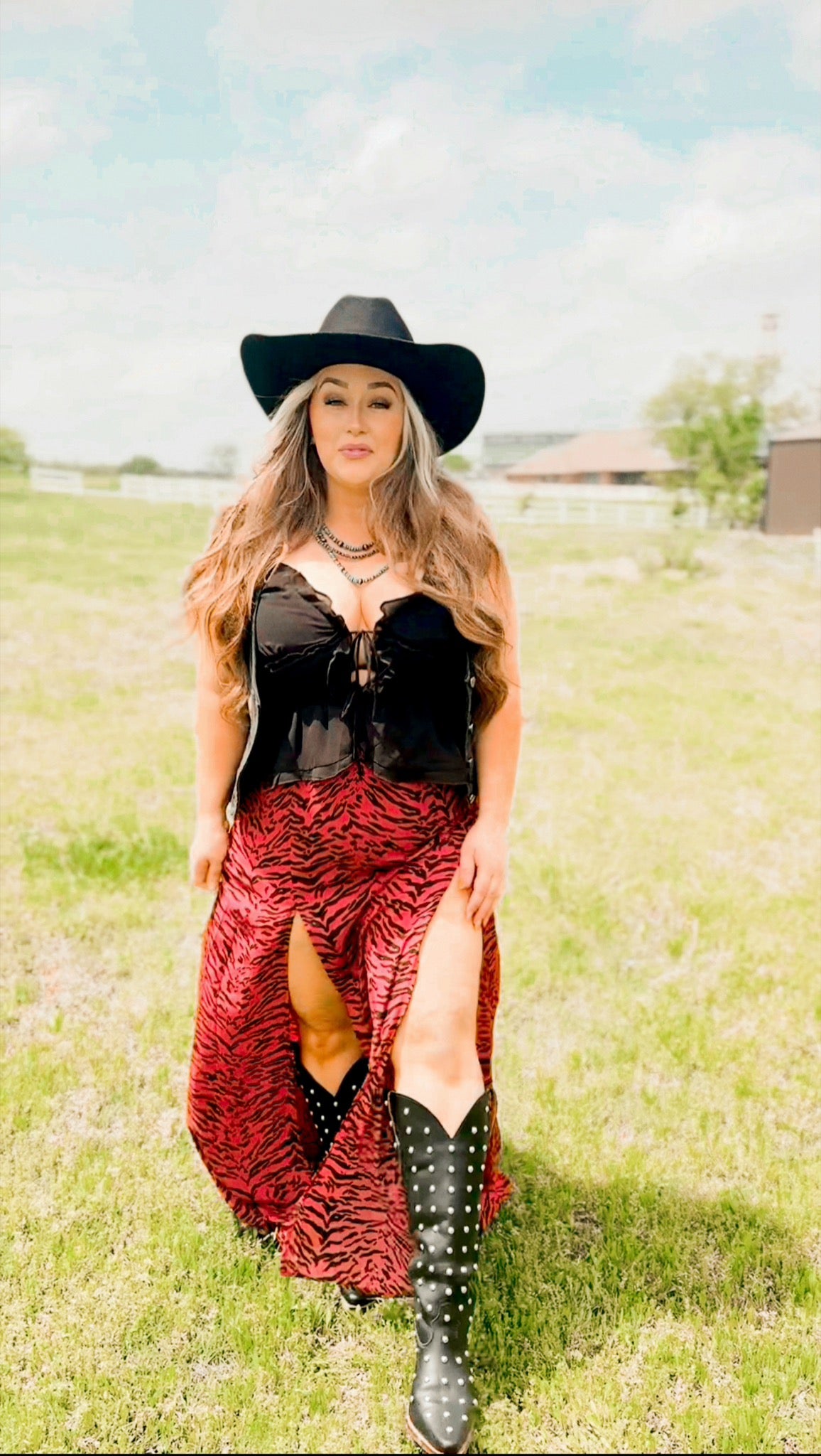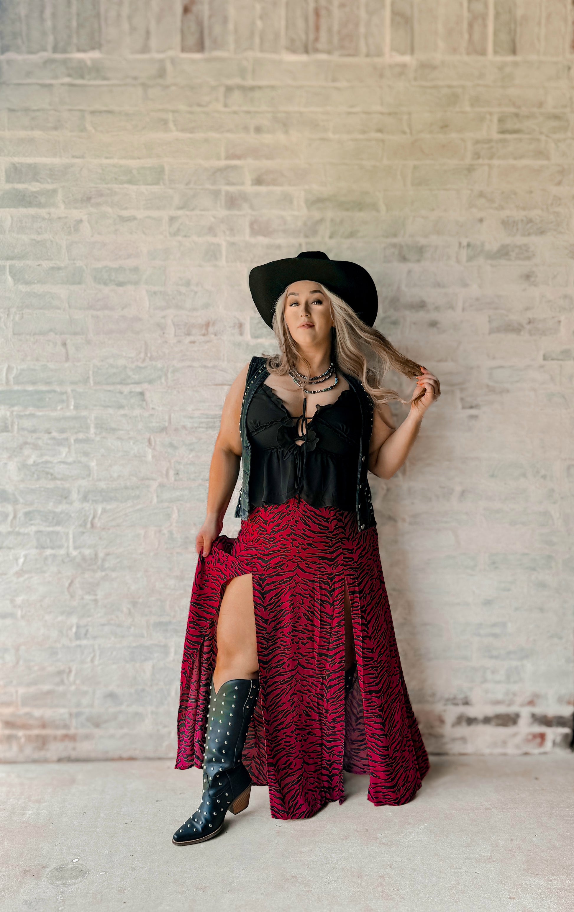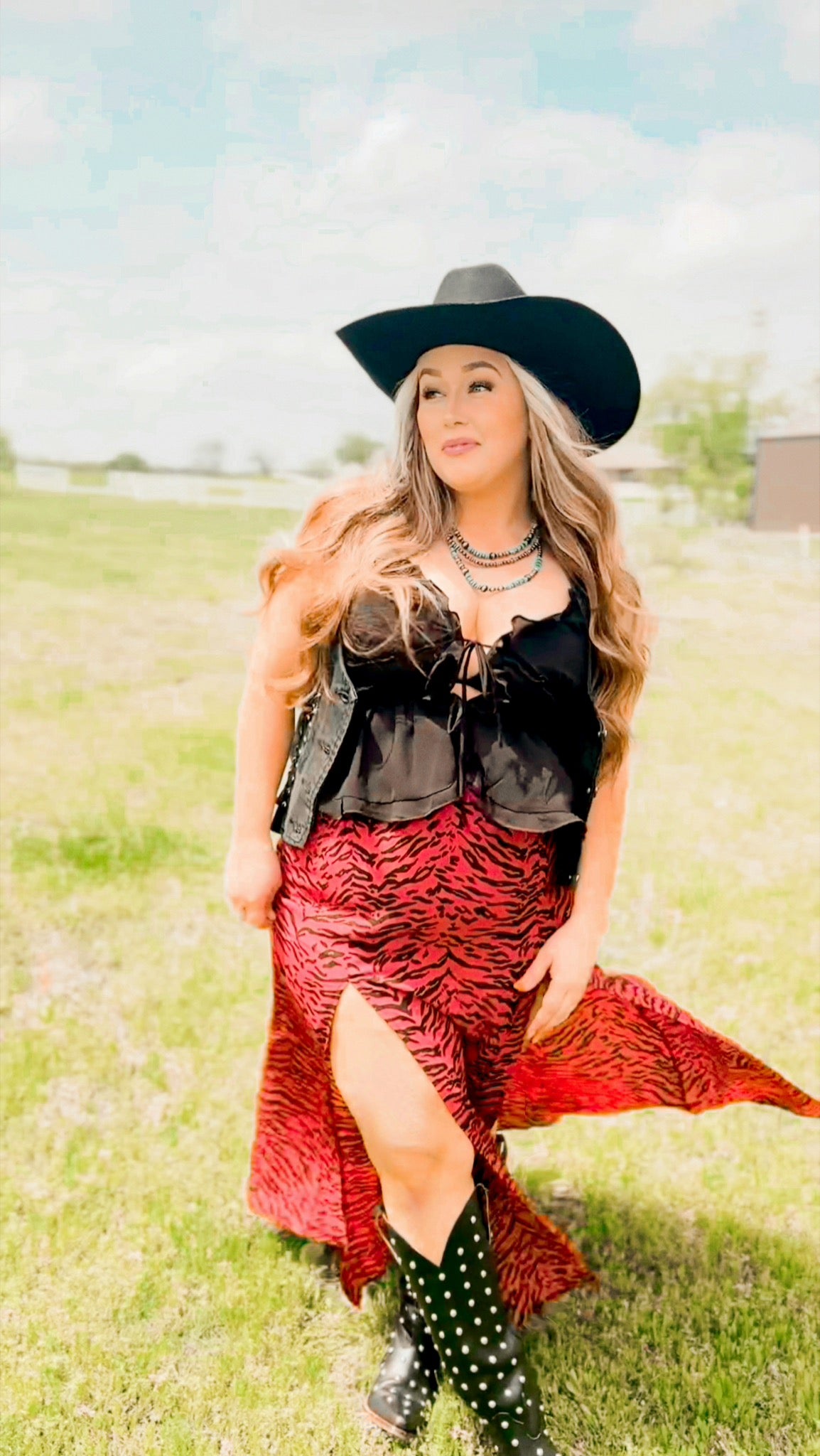 Channel your wild side with The Rogue Wrangler. This maxi skirt features an elastic waistband and front slits, making it the perfect piece for any cowgirl ready to break the rules. Lined for comfort, this skirt pairs well with your favorite boots or heels.