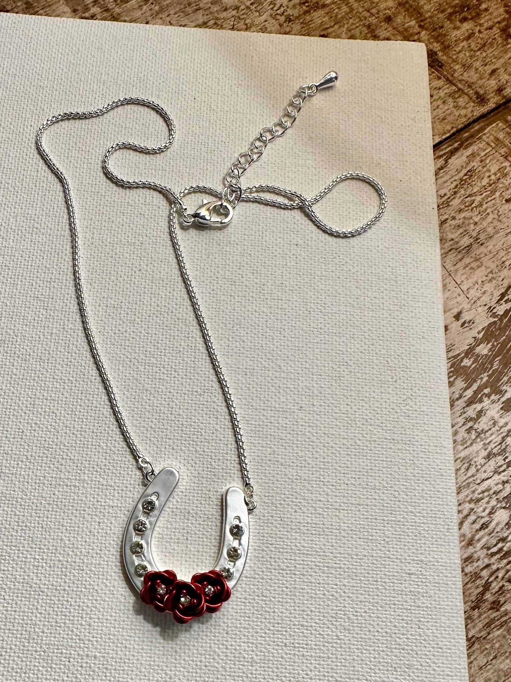 Crafted for true horse lovers, The Rose Garland Necklace is a stunning tribute to the strength and elegance of the Arabian horse. A silver-tone horseshoe sparkles with white CZ stones, while three deep red roses bloom at its base—mirroring the traditional rose garlands awarded to Arabian champions.